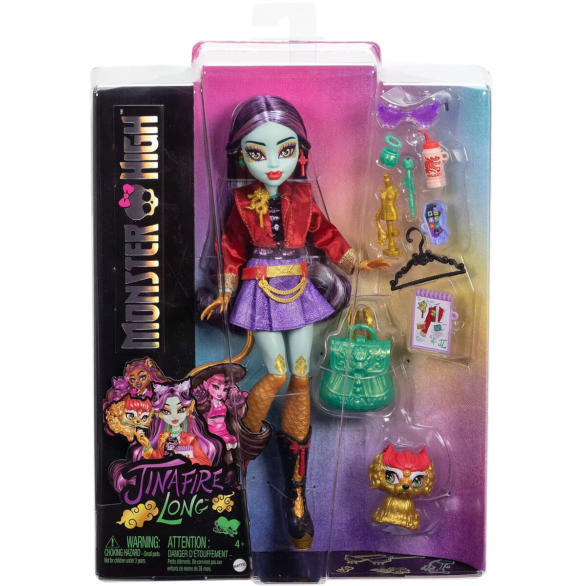 LongDesc - Meet Jinafire Long! An exchange student from Fanghai, this Monster High doll is a daydreaming dragon who loves designing clothes. Jinafire Long comes with 7 frightfully fun accessories, as well as her scare-dorable pet, Cloudy 'Yun Yun' -- a cross between a Pekingese puppy and a traditional Chinese lion. Kids 4 years old and up will love adding Jinafire Long to their Monster High skullection! Doll cannot stand alone. Colours and decorations may vary.