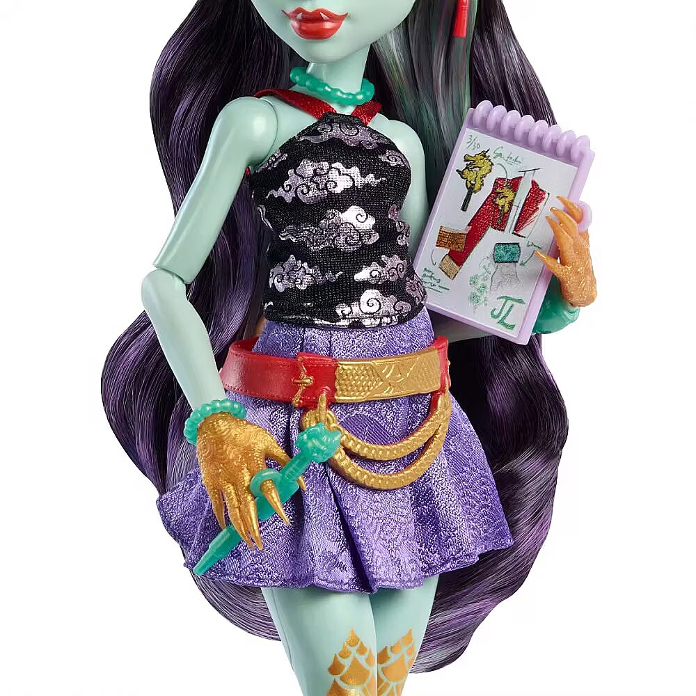 Description - Monster High Jinafire Long Przedstawiamy Jinafire Long! Ta lalka Monster High przyjechaĹa do Straszyceum w ramach wymiany zagranicznej ze szkoĹy w Fanghai. To marzycielski smok chiĹski, uwielbiajÄcy projektowanie ubraĹ. W zestawie z lalkÄ Jinafire Long jest 7 akcesoriĂłw oraz jej uroczy zwierzak Cloudy "Yun Yun", ktĂłry jest mieszankÄ pekiĹczyka i lwa chiĹskiego. Dzieci w wieku od 4 lat z radoĹciÄ wzbogacÄ swojÄ kolekcjÄ lalek Monster High o Jinafire Long. Lalka nie stoi samodzielnie. Kolory i elementy dekoracyjne mogÄ siÄ róşniÄ. Lalka Monster High Jinafire Long to urocza, stylowa i temperamentna smoczyca wĹadajÄca pogodÄ. W zestawie ma urocze zwierzÄtko i wspaniaĹe akcesoria. Jinafire Long uwielbia modÄ. Jej efektowny top wiÄzany na szyi i spĂłdniczka sÄ ozdobione nadrukiem chmurek i doskonale pasujÄ do krĂłtkiej kurtki. StylizacjÄ uzupeĹniajÄ akcesoria, takie jak kolczyki, "jadeitowe" bransoletki i kowbojki. W zestawie sÄ teĹź szkicownik, oĹĂłwek i minimanekin, z ktĂłrymi moĹźe wymyĹlaÄ straszystyczne modowe projekty. ZwierzÄcy przyjaciel lalki, Cloudy "Yun Yun", nie moĹźe siÄ doczekaÄ przygĂłd! To lojalny towarzysz, w ktĂłrego rodowodzie sÄ pekiĹczyk i lew chiĹski. DziÄki dodatkowym akcesoriom, takim jak plecak, okulary przeciwsĹoneczne, telefon i "jogurt do picia", lalka Jinafire Long jest gotowa na kaĹźdÄ przygodÄ. Poznaj caĹÄ kolekcjÄ lalek i zestawĂłw Monster High, ktĂłre zainspirujÄ CiÄ do eksperymentĂłw z modÄ i potwornie ciekawych opowieĹci. Sprzedawane oddzielnie, zaleĹźnie od dostÄpnoĹci.