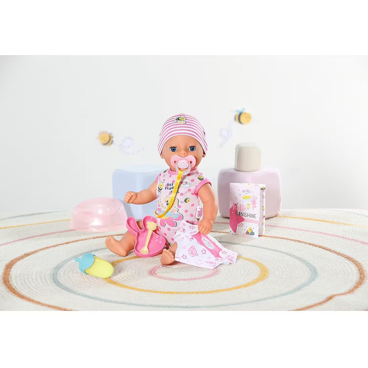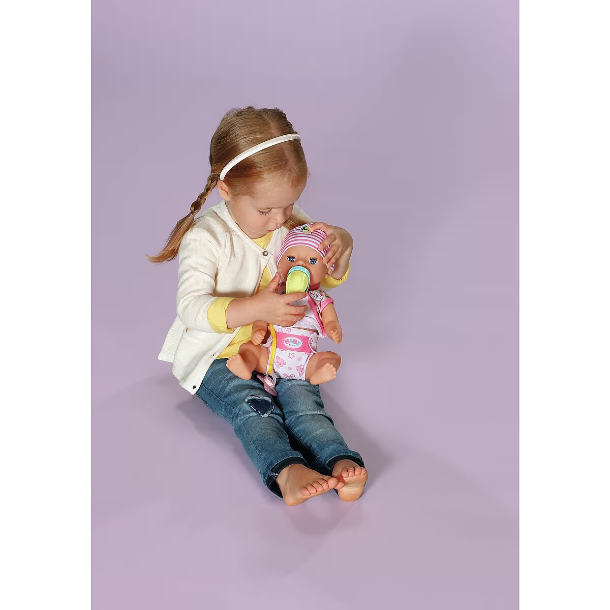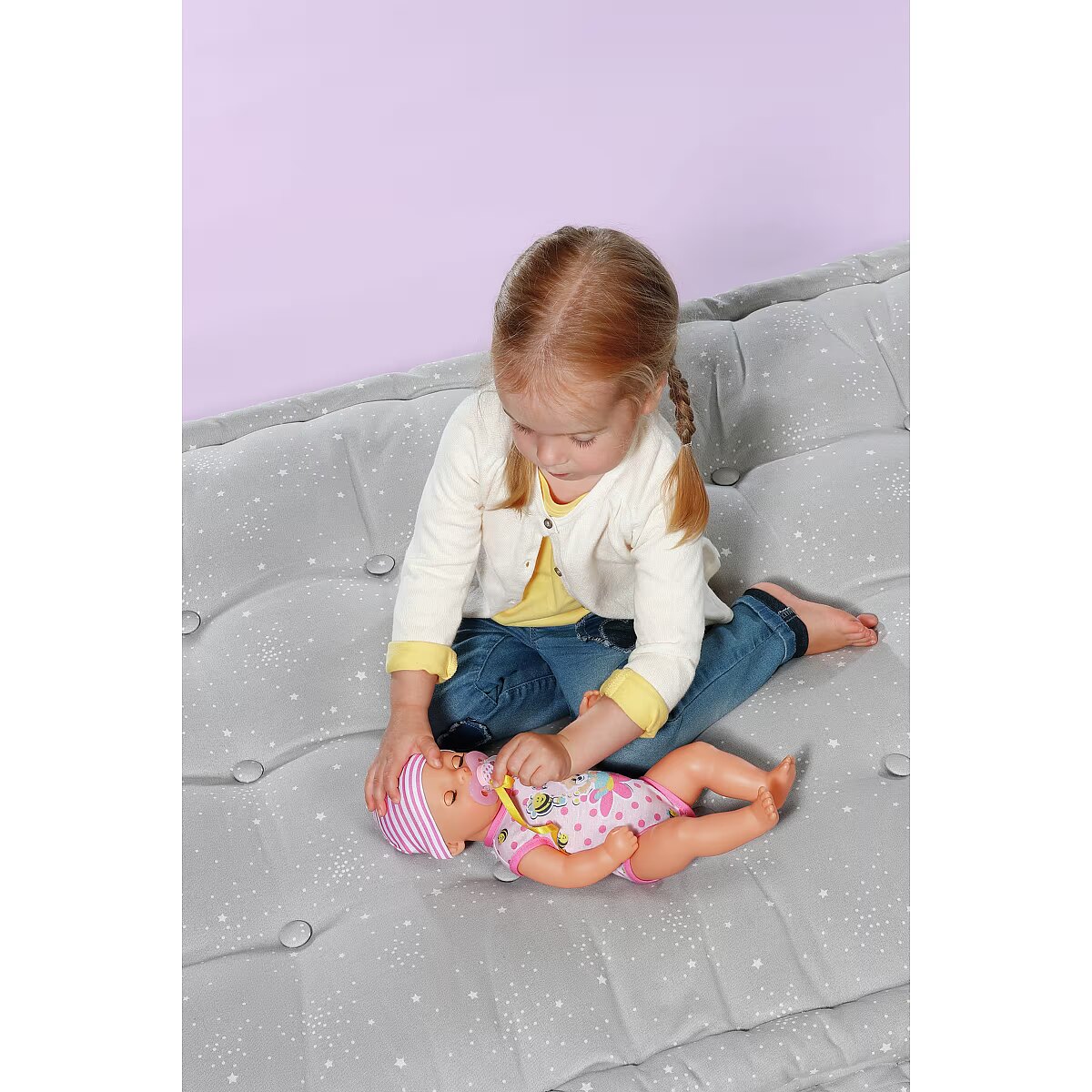 LongDesc - BABY born Little Baby Girl has 7 great functions that all work without batteries. She comes with everything she needs. She can drink water from her bottle, change her nappy or go on her pink potty. When she receives the dummy attached to her body, her eyes magically open or close. If you give her the dummy and turn it to the left, she closes her eyes; if you turn it to the right, she opens her eyes. If you put her to sleep in her cot, she closes her eyes even without a dummy. Her arms, legs and head are super manoeuvrable and make dressing and undressing her child's play. At 36 cm, she is suitable for smaller children's hands from the age of one and is the perfect doll for starting out with varied baby play. They can even sit on the potty together and playfully help your child to get dry.
