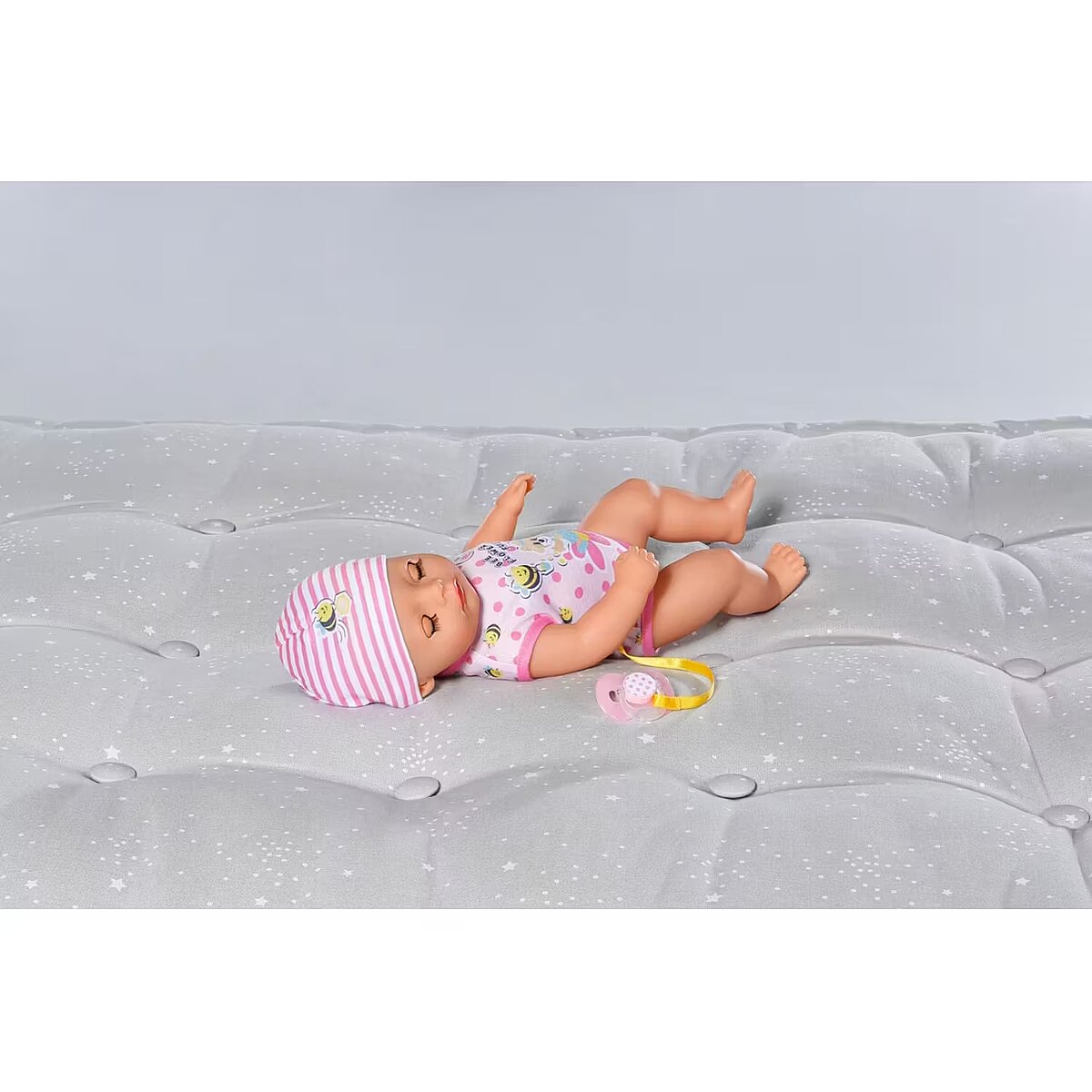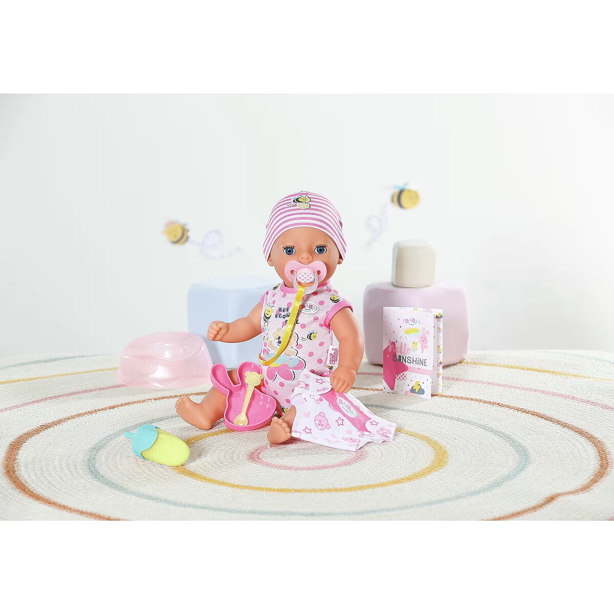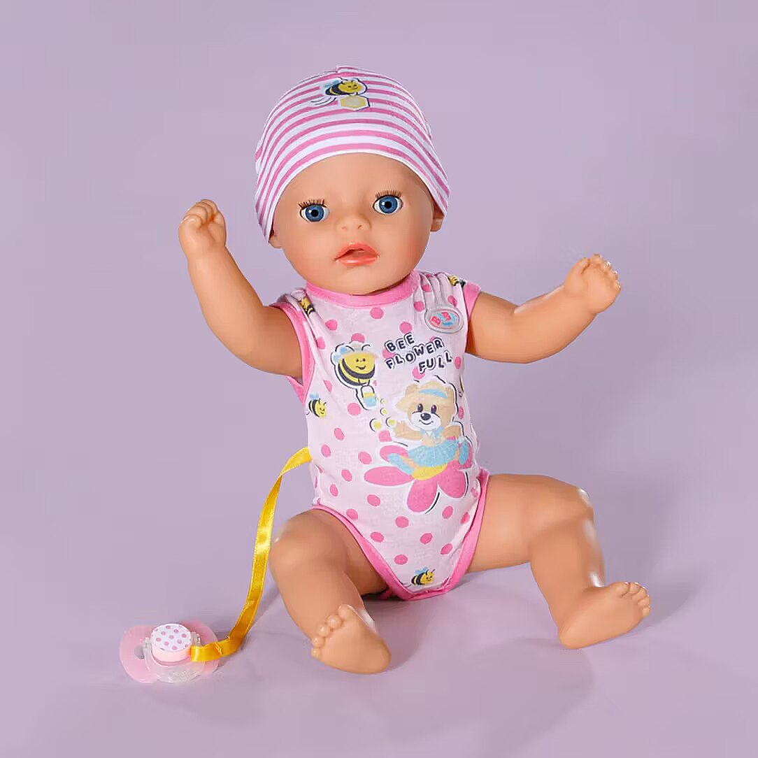 LongDesc - BABY born Little Baby Girl has 7 great functions that all work without batteries. She comes with everything she needs. She can drink water from her bottle, change her nappy or go on her pink potty. When she receives the dummy attached to her body, her eyes magically open or close. If you give her the dummy and turn it to the left, she closes her eyes; if you turn it to the right, she opens her eyes. If you put her to sleep in her cot, she closes her eyes even without a dummy. Her arms, legs and head are super manoeuvrable and make dressing and undressing her child's play. At 36 cm, she is suitable for smaller children's hands from the age of one and is the perfect doll for starting out with varied baby play. They can even sit on the potty together and playfully help your child to get dry.