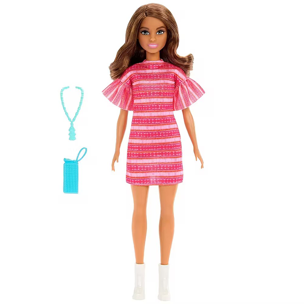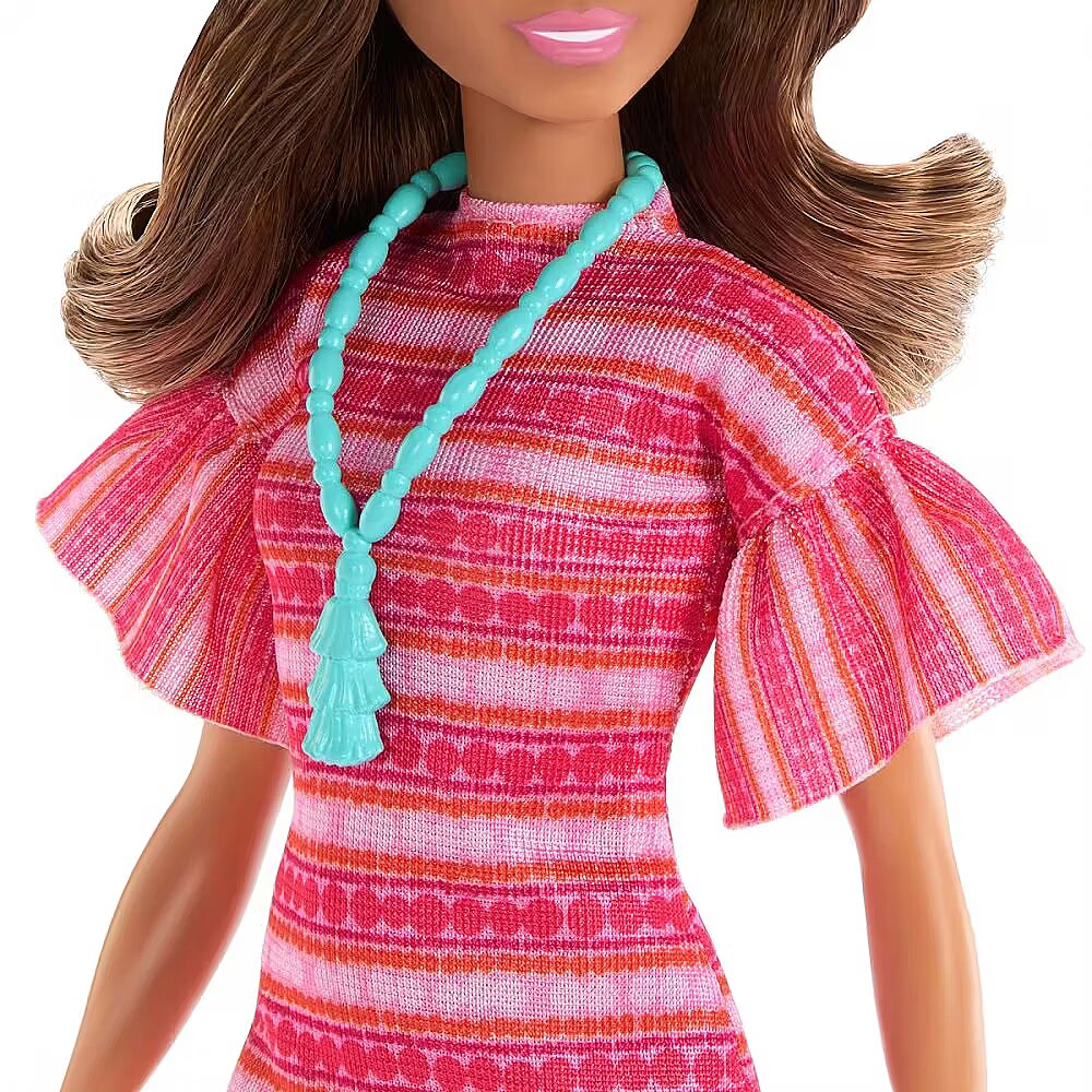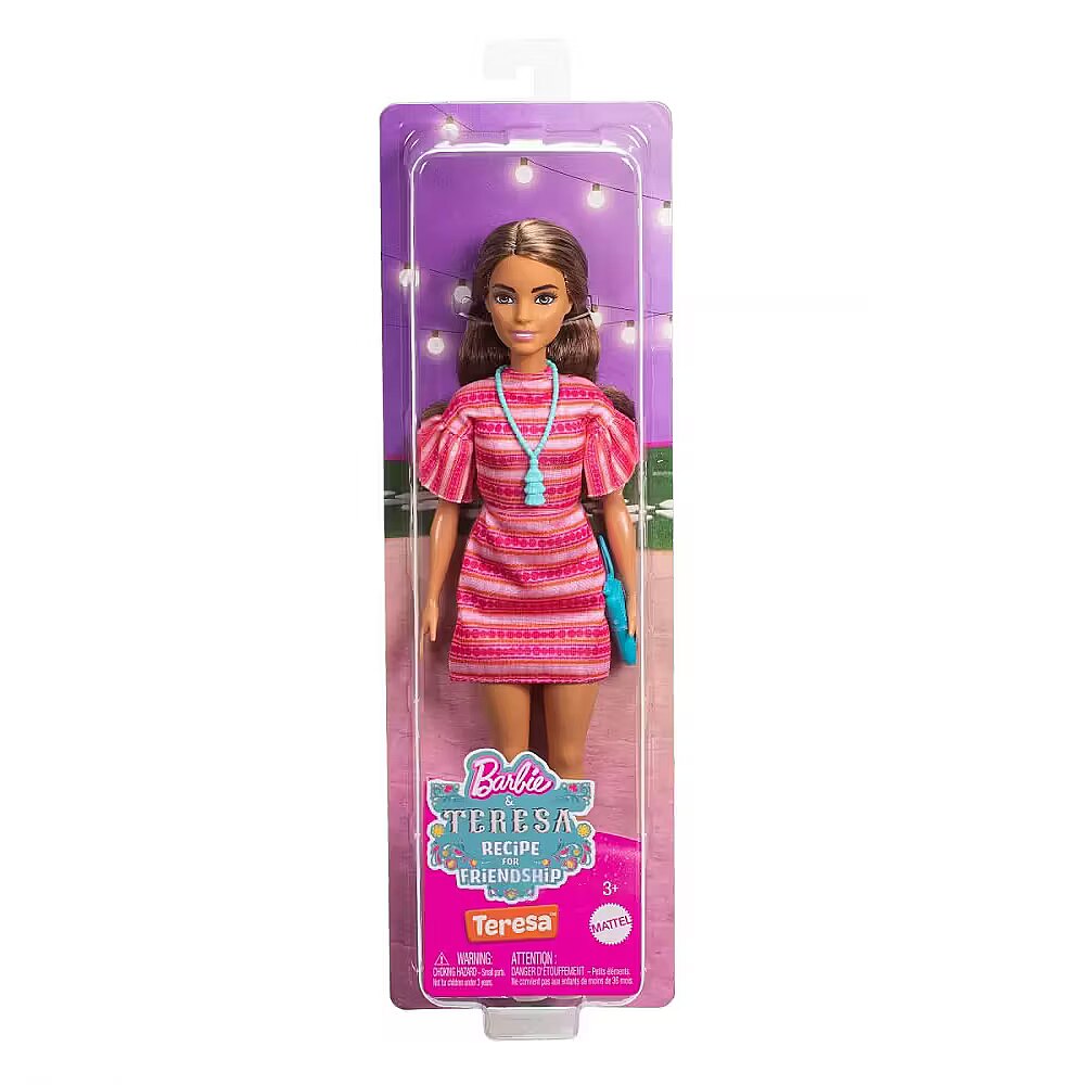 LongDesc - Imaginations can cook up all kinds of stories with Teresa doll inspired by the movie Barbie and Teresa Recipe for Friendship. The fashion doll brings the character to life wearing her iconic pink patterned dress with white booties. Two bright blue fashion accessories include a clutch purse and a tassel necklace resembling her piece seen onscreen. Kids and fans ages 3 years and older will love recreating scenes and making up new recipes for adventure! Doll cannot stand alone. Colours and decorations may vary.