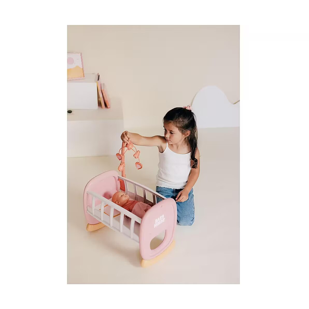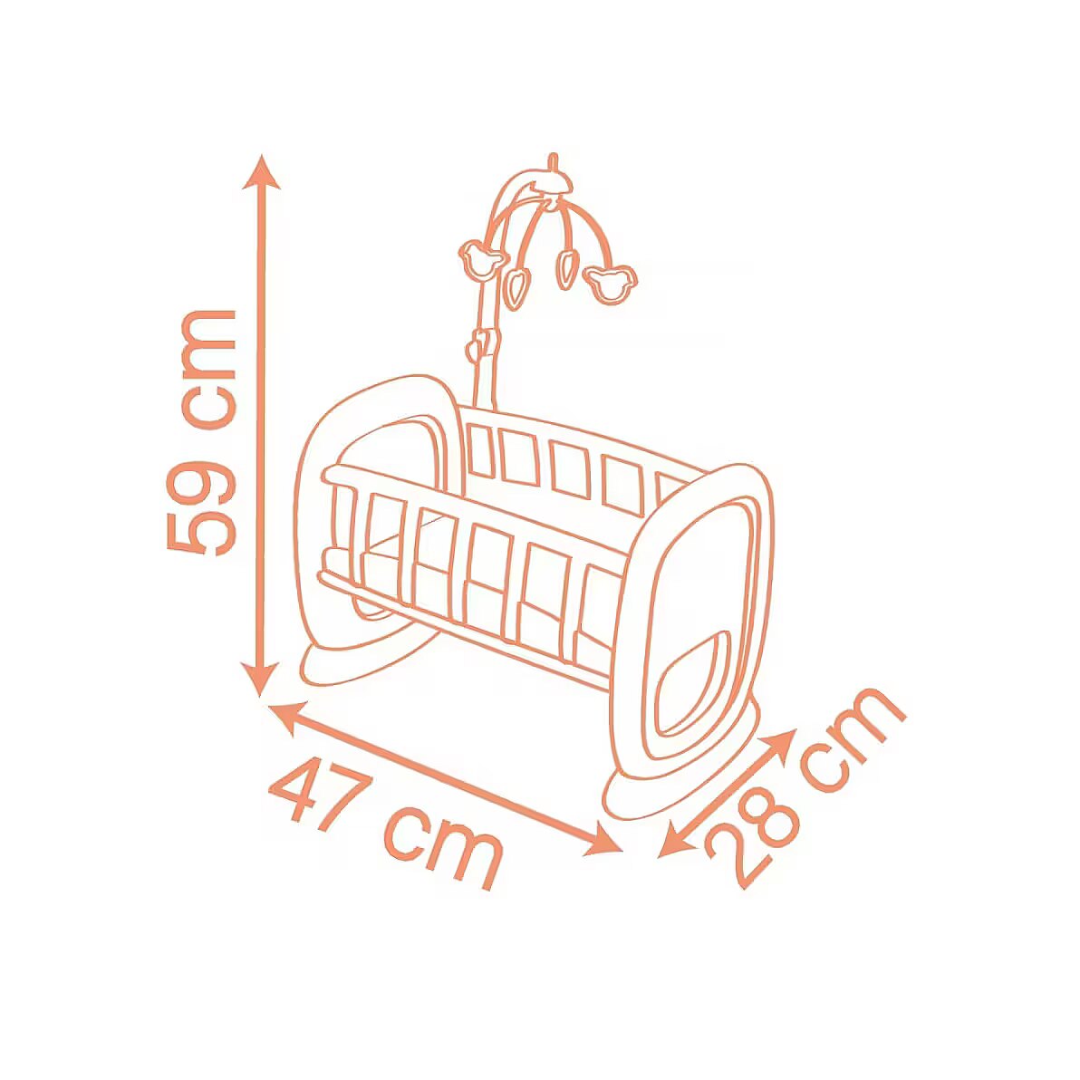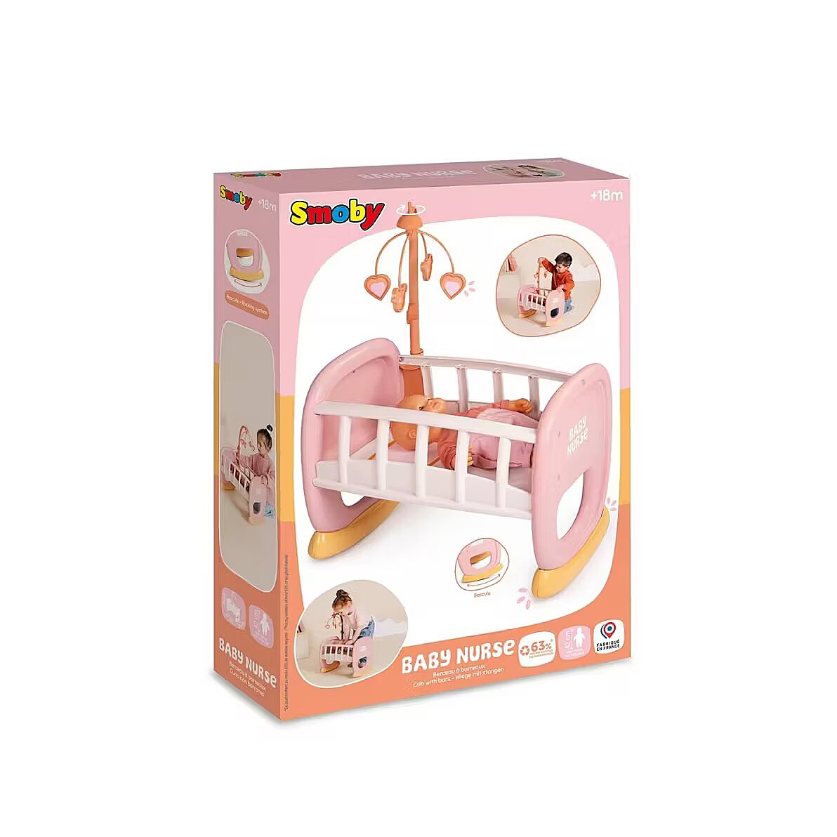 Description - Smoby Baby Nurse Baby's Cot The Smoby Baby Nurse doll's cradle is both a cradle and a doll's bed. With the beautifully designed cradle in your favourite colours, you can gently rock your doll to sleep. The manually rotatable mobile attached to the cradle helps your little one to fall asleep. This will gently guide your little darling to sleep. The surface can be quickly cleaned with a damp cloth. The Smoby Baby Nurse doll's cradle is produced in the Smoby factory in France and, with a recycled content of 63%, sets a strong example for sustainability and responsible production. Suitable for dolls up to 42 cm.