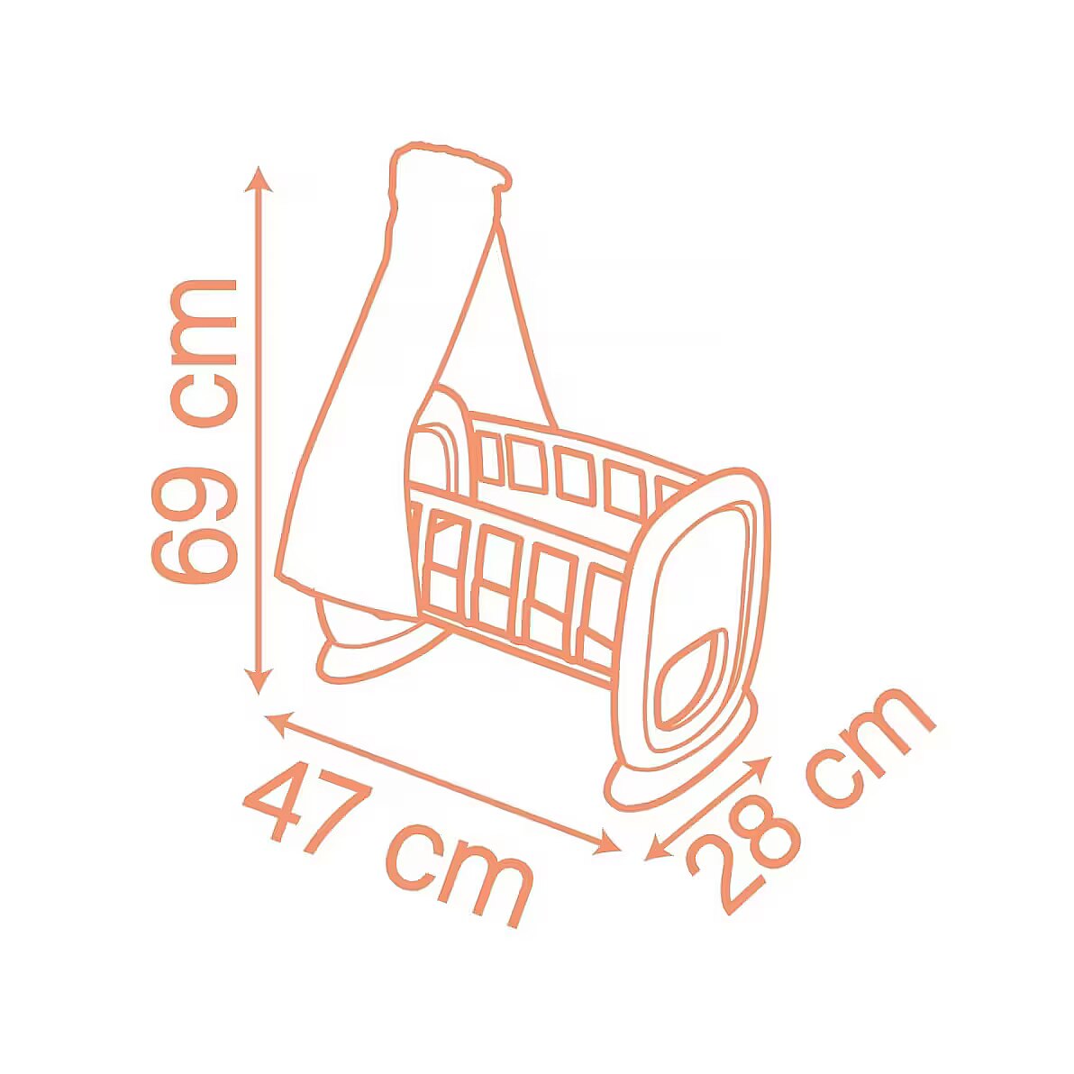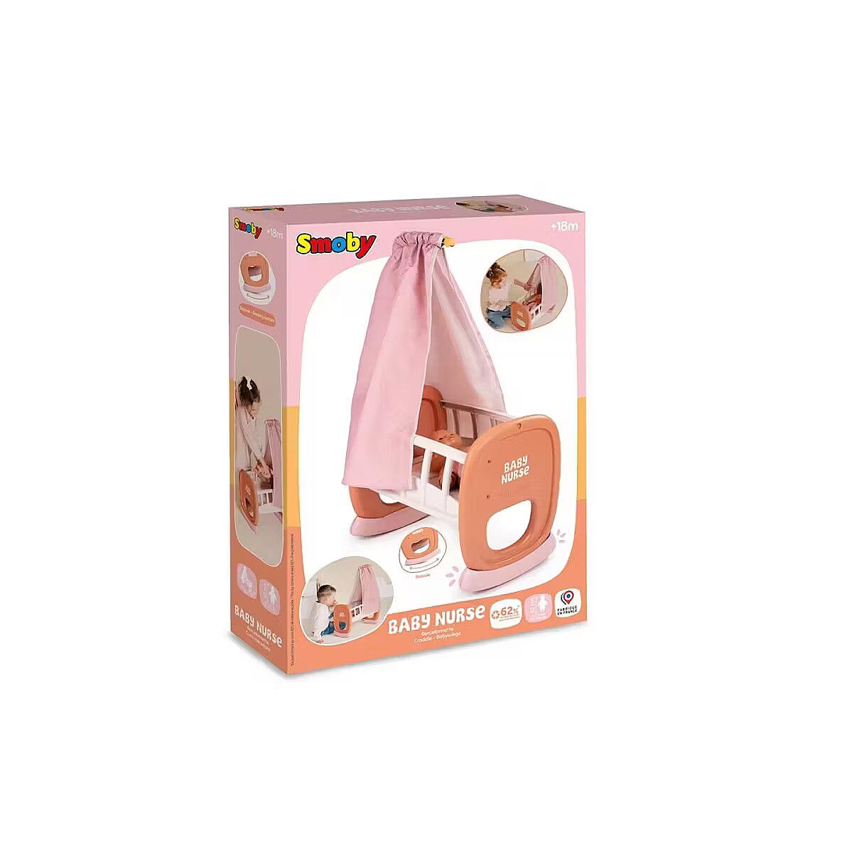 Description - Smoby Baby Nurse Cradle The Smoby Baby Nurse doll's cradle with lovingly designed fabric canopy ensures sweet dreams! It is both a doll's cradle and cot and gently lulls your favourite doll to sleep. The fabric canopy is removable and washable, and the high-quality plastic can be easily cleaned with a damp cloth. The Smoby Baby Nurse doll's cradle is produced in the Smoby factory in France and, with a recycled content of 62%, sets a strong example for sustainability and responsible production. Suitable for dolls up to 42 cm.