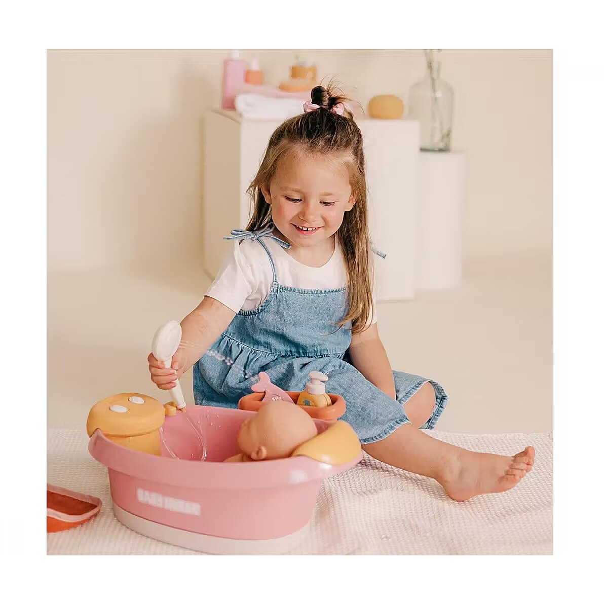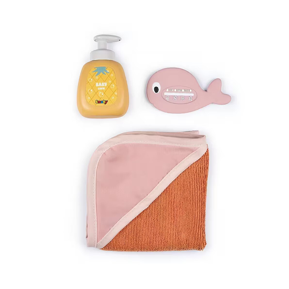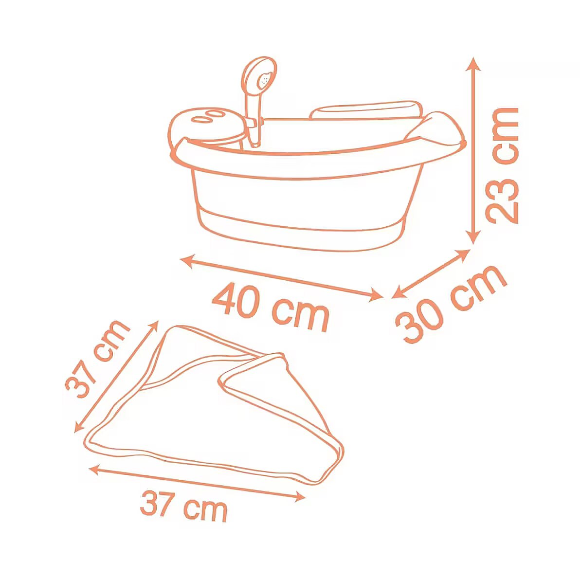 Description - Smoby Baby Nurse Balneo Bath All your favourite dolls will feel right at home in the Smoby Baby Nurse doll bathtub! While they take a nice, warm bath, bubbles rise to the top and a great light effect with different colours provides variety. After washing, they can be rinsed off quickly, as real water flows out of the automatic shower head at the touch of a button. The bath has an electronic module with 2 functions: Water jet with closed circuit and bubbles with light. The headrest ensures that your little one lies comfortably even during longer bathing sessions. The storage area offers enough space to store the accessories supplied: Cotton towelling bath towel, a shampoo bottle with pump function and a whale thermometer. The thermometer is heat-sensitive and changes colour when it comes into contact with water. Suitable for dolls up to 42 cm. Doll not included.