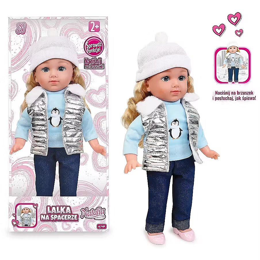 Description - Lalka funkcyjna Natalia w srebrnej kamizelce Po naciśnieciu na brzuszek wypowiada frazy po polsku, śpiewa 2 piosenki Baterie: 3 x AG13 dołączone testowe
