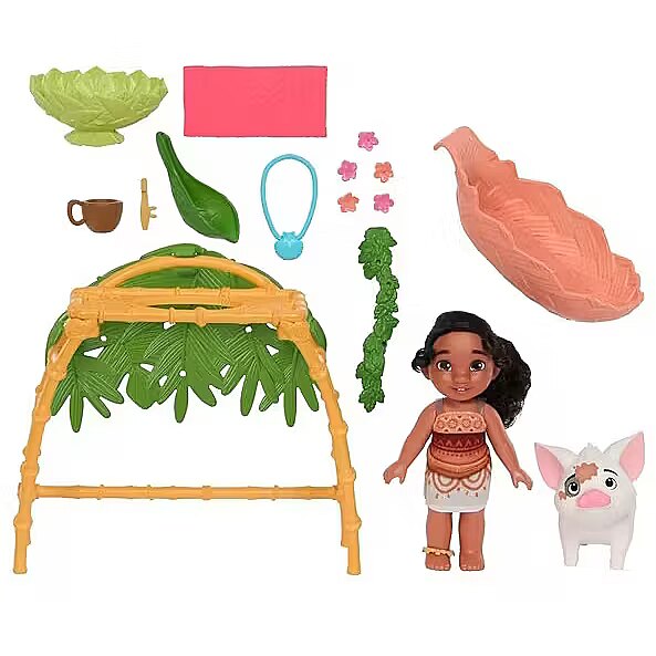 Accessories included - 1 lalka Simea 1 figurka świni Pua ze zmianą koloru 1 chatka 1 wanna 11 innych akcesoriów