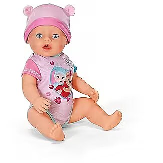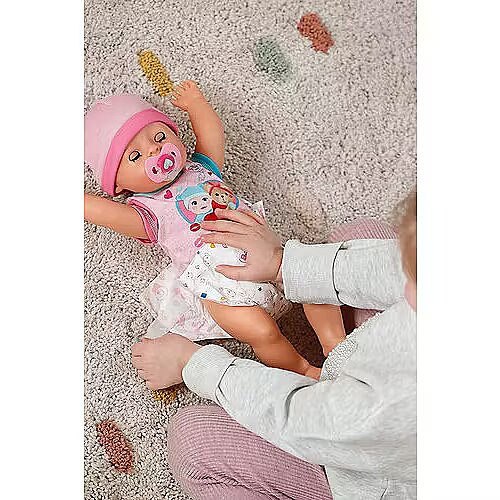 LongDesc - Here comes Emma! Already known from the BABY born animation series, which can be seen on YouTube and Toggo, Emma is now also available in her new outfit and with 10 accessories for you at home. She also has her magic plate with her: if you put water on the insert in the plate, the water magic makes delicious dishes appear, making the feeding game even more exciting. If you place her on her potty after playing with food (with water) or drink and press on her tummy, her small and large dishes will also appear there. If Emma drinks water from her bottle, she can even cry and needs to be gently comforted. The magic dummy helps here: if you turn it 180 degrees, her eyes close or open. Turn it again and the opposite happens. If you put her to sleep in her cot, she closes her eyes even without a dummy. But Emma can do even more: she is super manoeuvrable and can even be taken into the bath because she now dries even faster: to clean the doll properly after playtime, the leg can be removed to create a larger opening for cleaning. This makes it much easier for water to drain away. For even more creative play, in addition to her bottle, dummy, plate, spoon, meals and potty, Emma also comes with a nappy, her birth passport and two friendship bracelets - for a long and loving friendship between child and doll.In the usual BABY born quality that has been delighting generations of children since 1991.