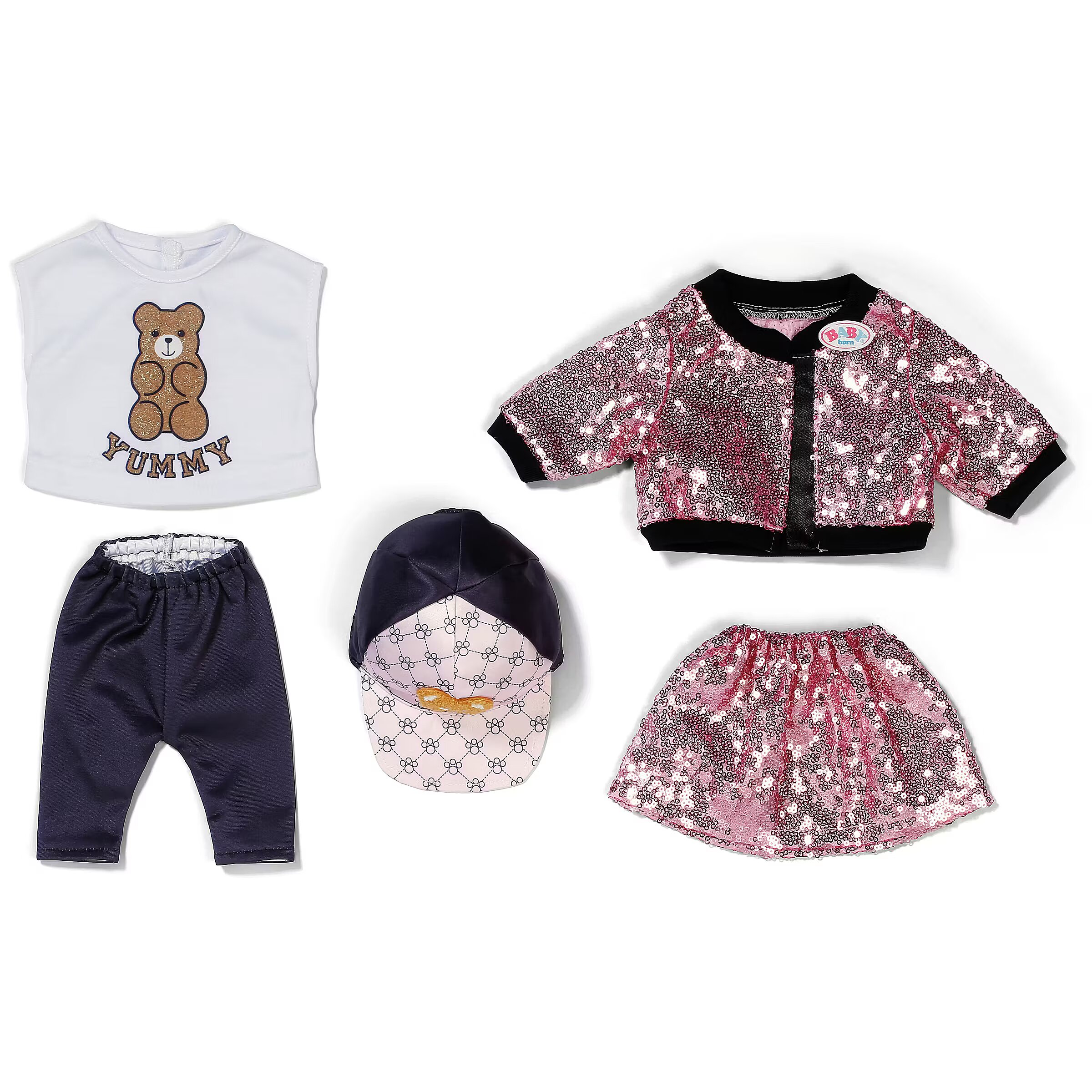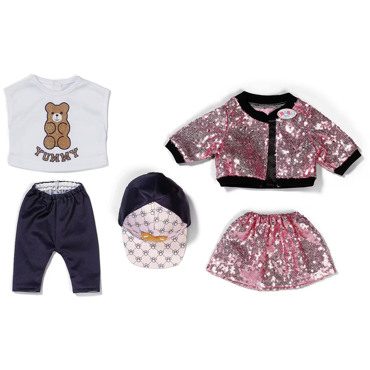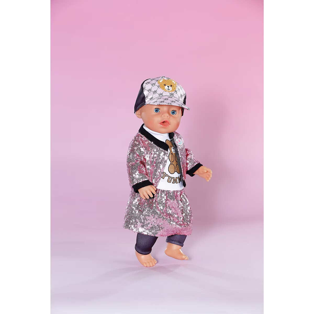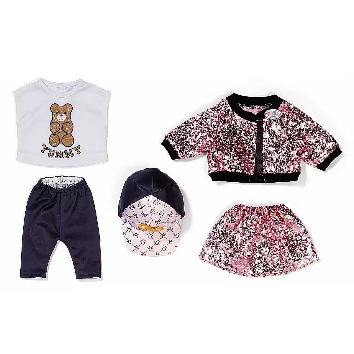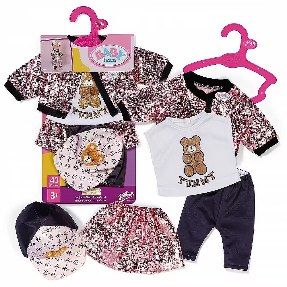 LongDesc - With this glamous 5 piece outfit, BABY born sparkles with the stars! In this set you get shiny leggings and a glitter shirt, complemented by a college-style skirt and jacket with pink sequins, and a cool cap with teddy appliqué rounds off the outfit perfectly. For 43cm dolls. Suitable for children aged 3+. Doll not included.