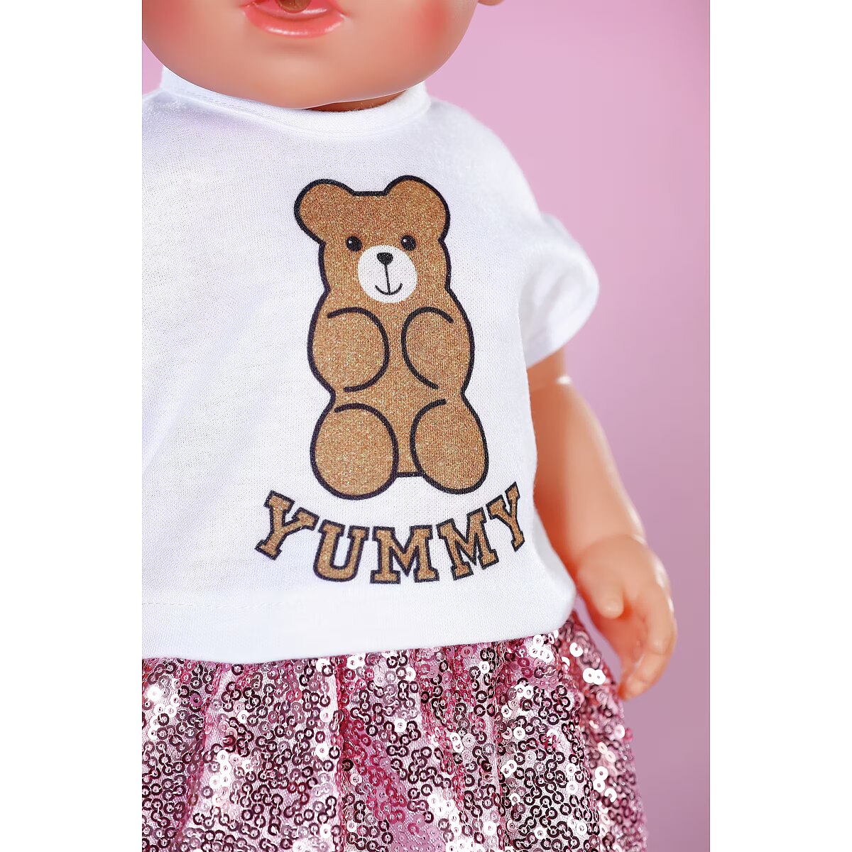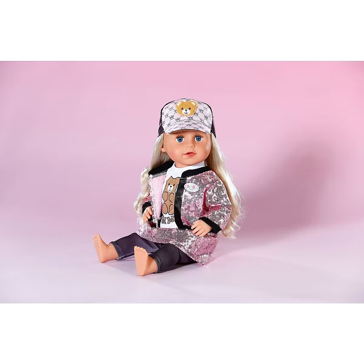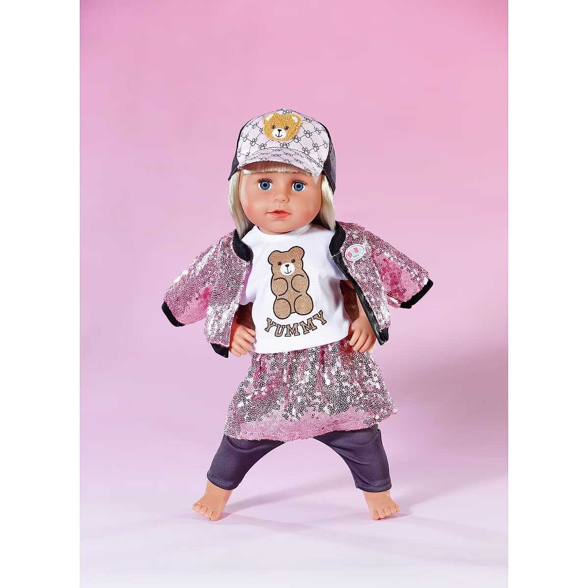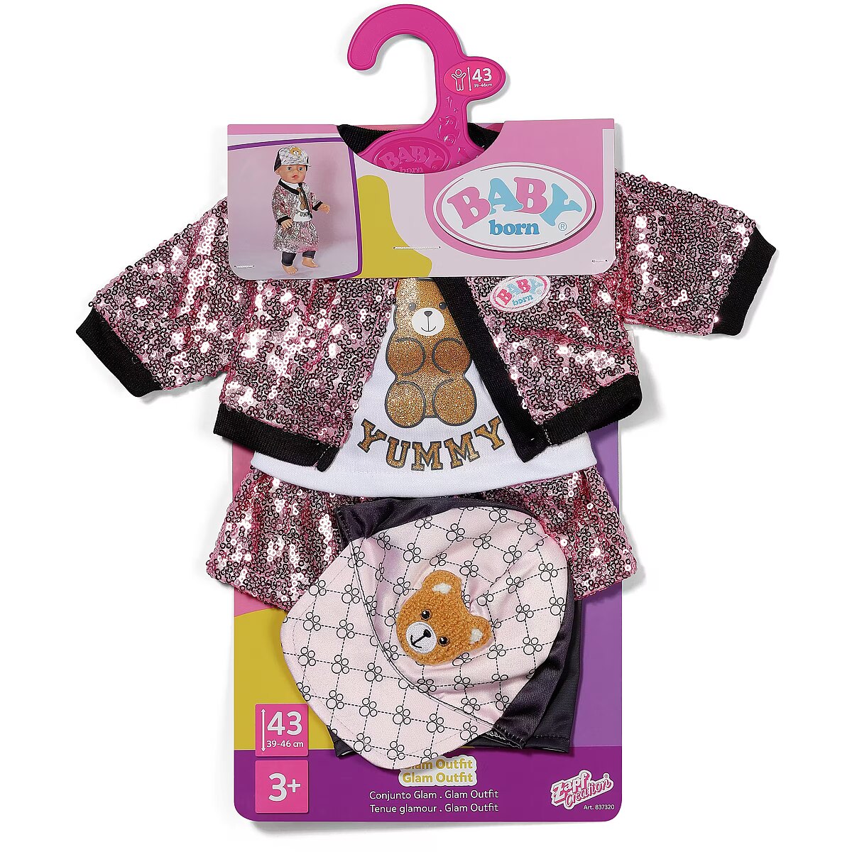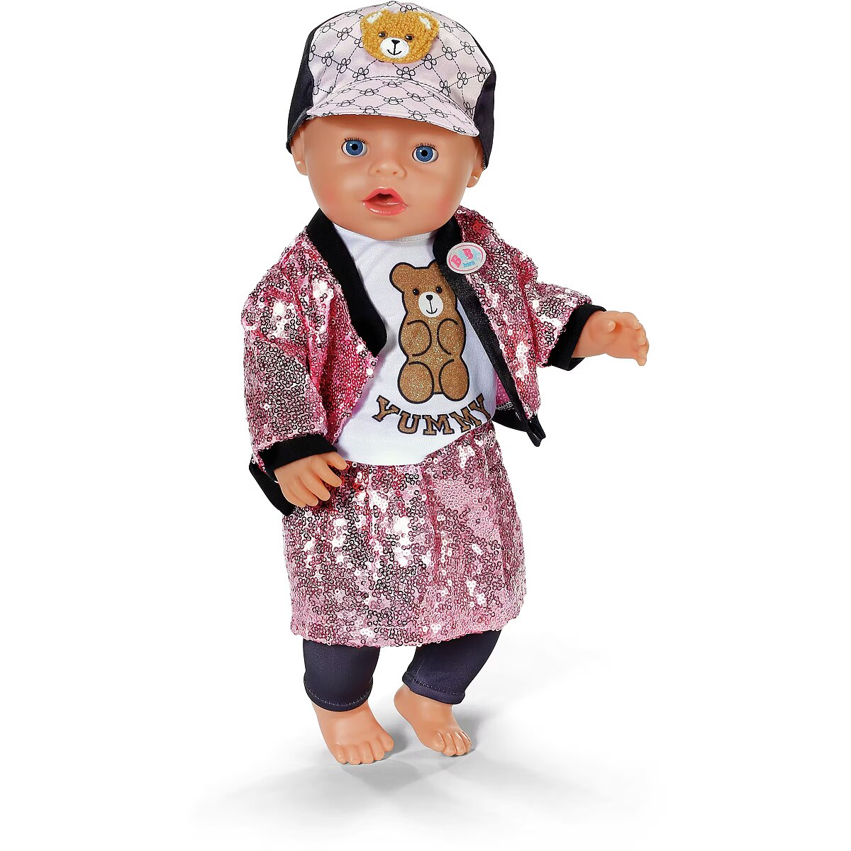 LongDesc - With this glamous 5 piece outfit, BABY born sparkles with the stars! In this set you get shiny leggings and a glitter shirt, complemented by a college-style skirt and jacket with pink sequins, and a cool cap with teddy appliqué rounds off the outfit perfectly. For 43cm dolls. Suitable for children aged 3+. Doll not included.