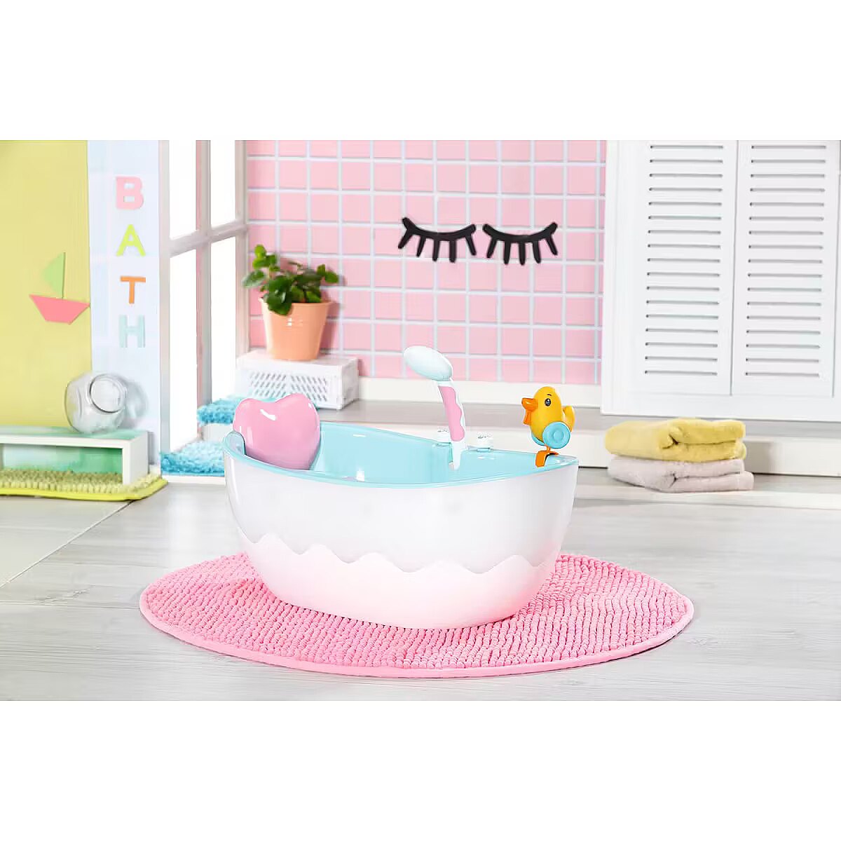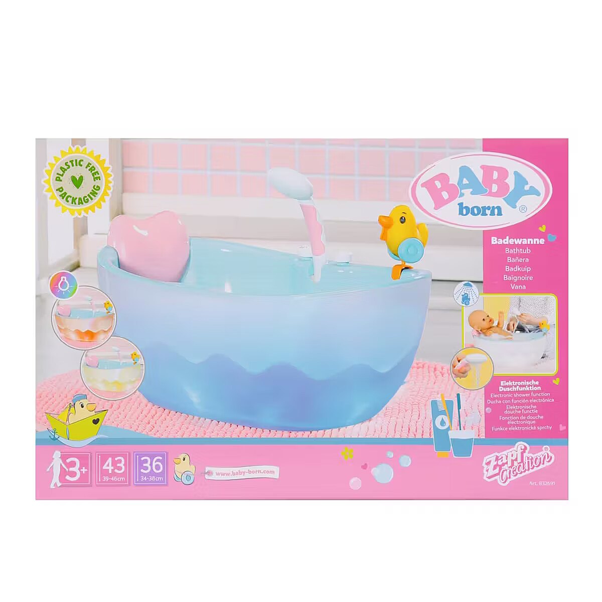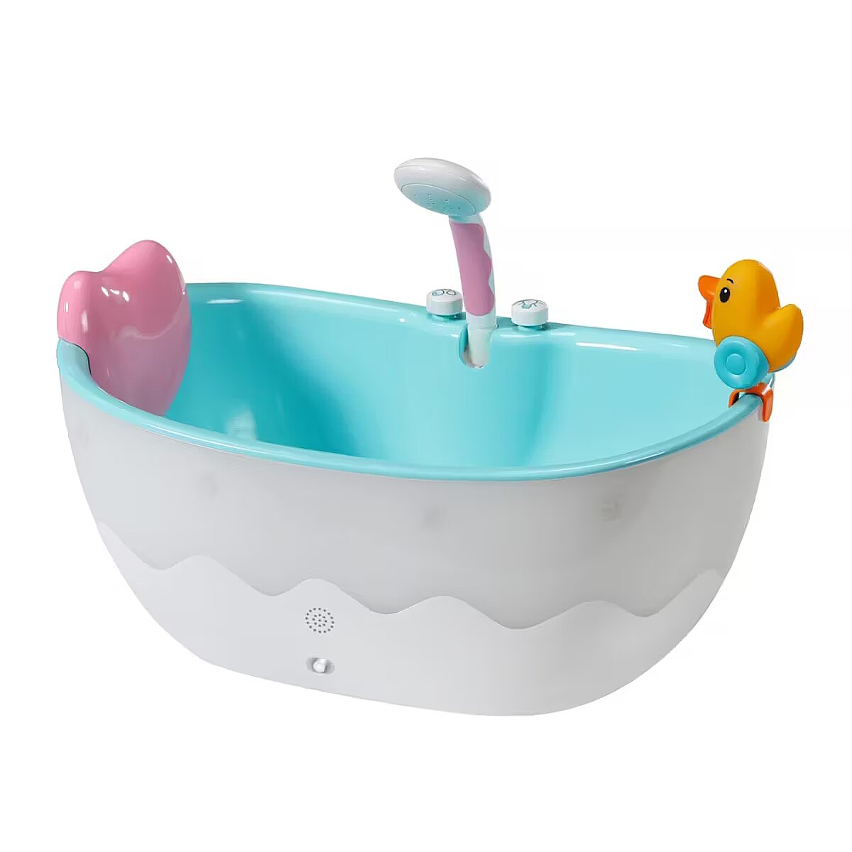 LongDesc - Take aim, fire, aaaand… GOT YOU! Brother is really wet now. A bath duck like this is just perfect for water fights. You can position it anywhere along the edge of the bathtub, just like the heart-shaped pillow. The tub is water-blue on the inside and white with an embedded wave shape on the outside. If you press the light switch next to the shower, the outer shell of the bathtub lights up in alternating colours. The shower button activates the pink and white shower. If the bathtub is empty, you can hear splashing and the typical watery sounds. If the bathtub was filled with water beforehand, the water now runs through the shower head, which can be tilted towards the bathtub so that no water drips outside the tub. You can also take out the hose in order to give BABY born a good wash or to soak Brother a little bit more. - High-quality accessories for the BABY born branded doll.- For enhanced, diverse and long-lasting fun through play.- Suitable for dolls in the sizes 36 cm and 43 cm.- Requires batteries (not included). BABY born Bath Bathtub with light and sound effects. Includes pillow and squirting duck.