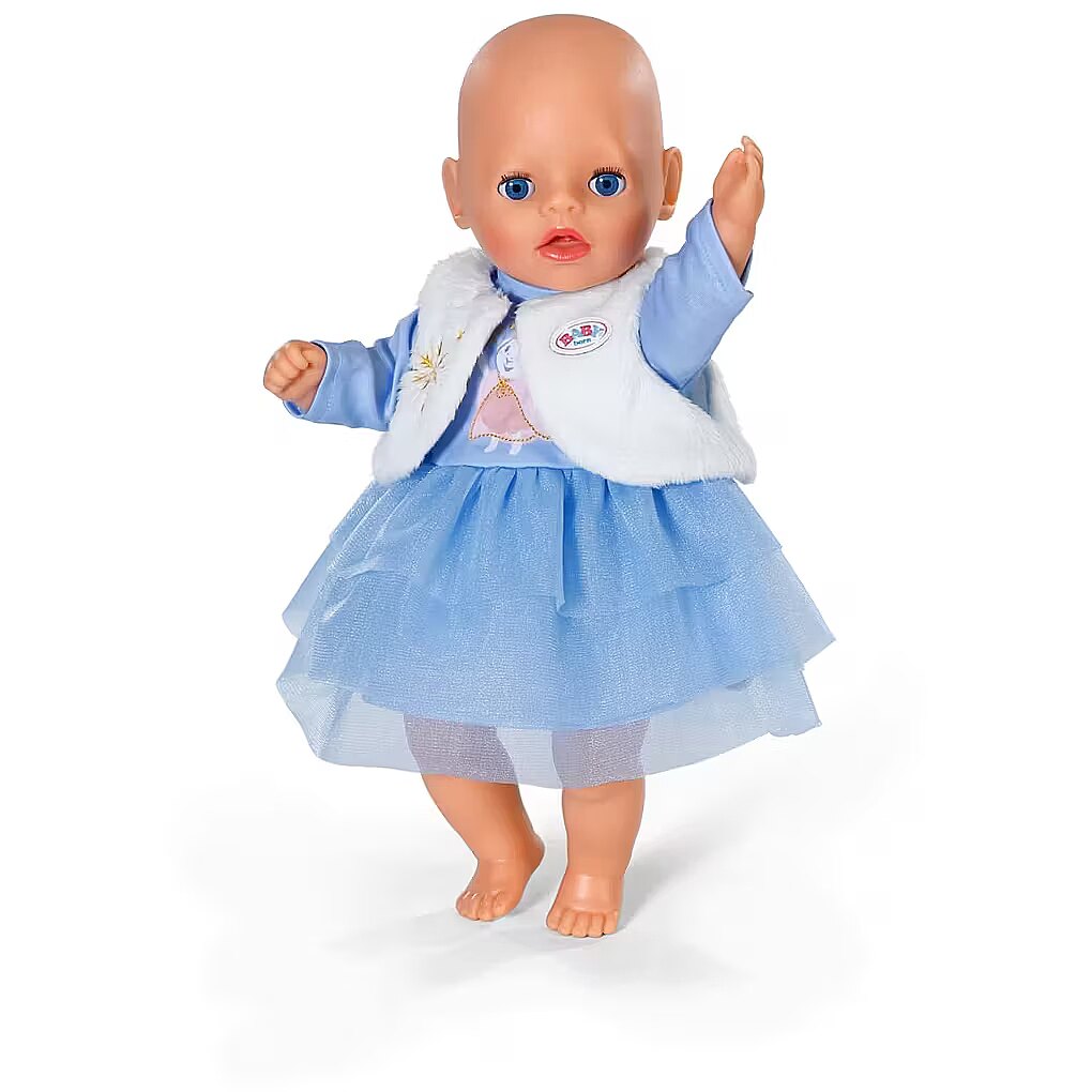 Description - BABY born Niebieska Sukienka Zimowa - uroczy zestaw, który wprowadza magiczny, zimowy styl do garderoby lalki. Sukienka z długim rękawem i błyszczącą tiulową spódnicą tworzy modny, elegancki look, a miękka kamizelka dodaje przytulnego akcentu, zapewniając jeszcze więcej radości z ubierania. Zestaw jest idealnie dopasowany do lalek BABY born o wysokości 36cm, gwarantując wygodę noszenia i uroczy wygląd na każdą okazję. Prosty krój pozwala małym rączkom samodzielnie zmieniać ubranka, rozwijając kreatywność i zabawę w modę. Delikatne kolory i staranne wykonanie sprawiają, że zestaw jest eleganckim dodatkiem oraz doskonałym prezentem na wyjątkowe okazje. Marka BABY born od 1991 roku zapewnia trwałą jakość i niezawodną zabawę.