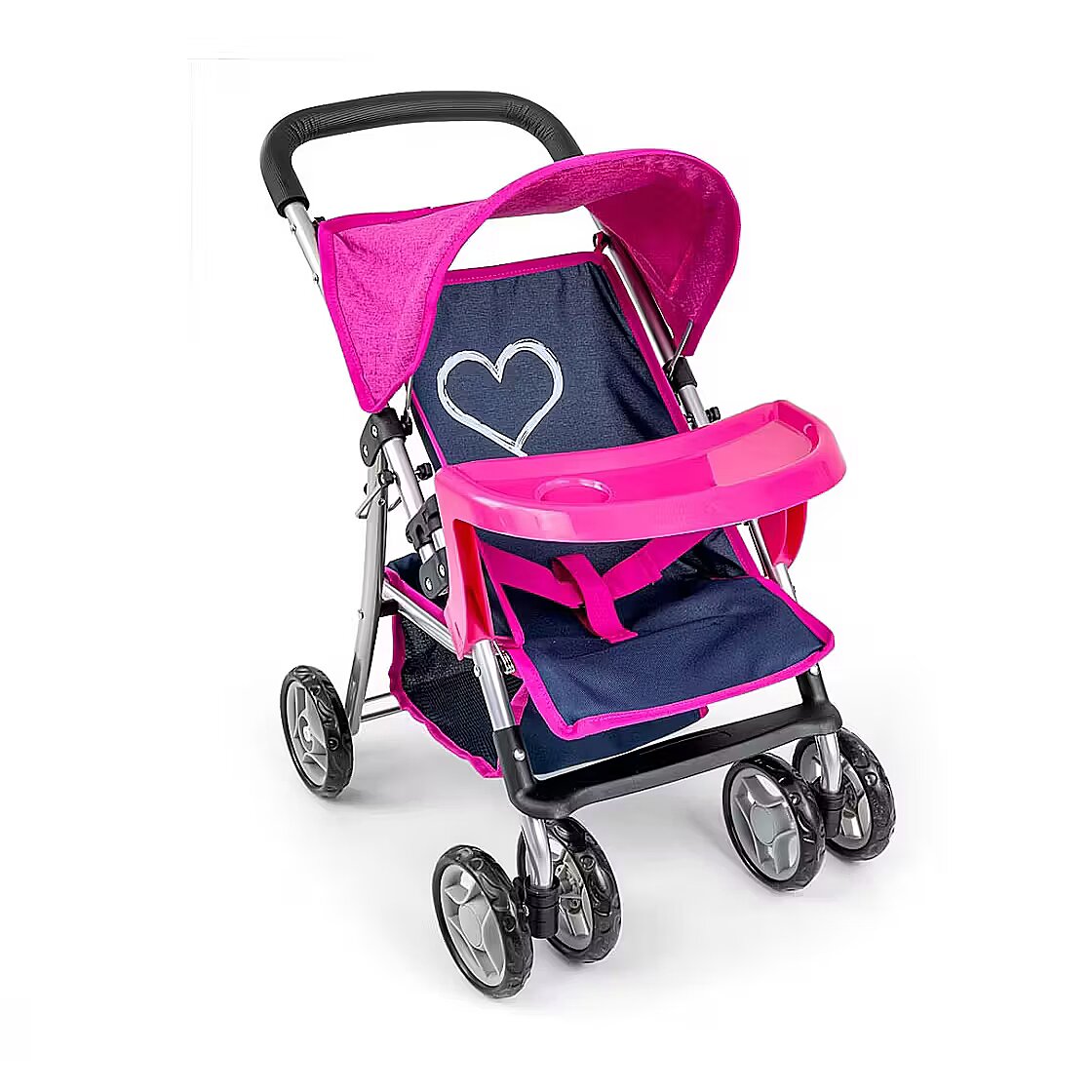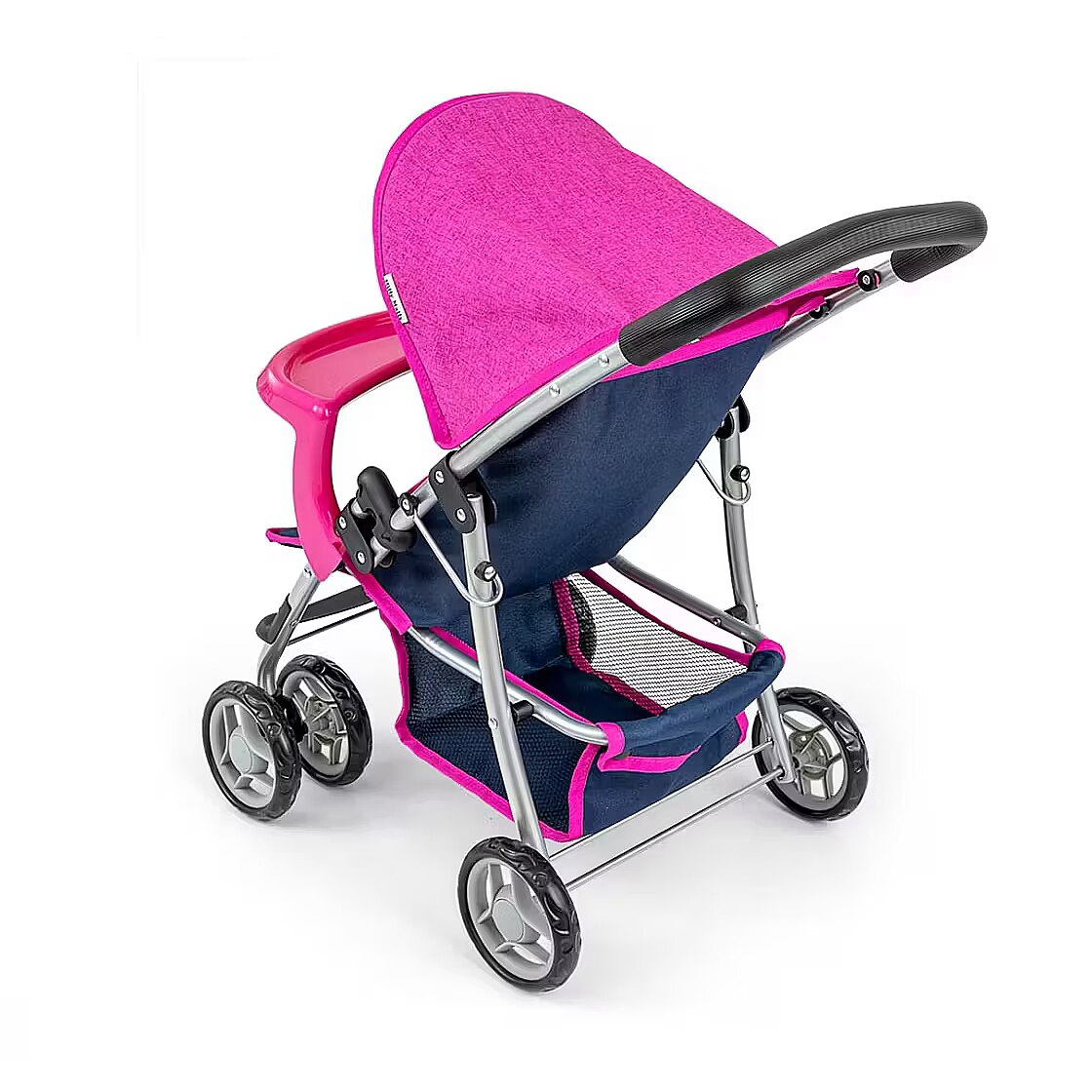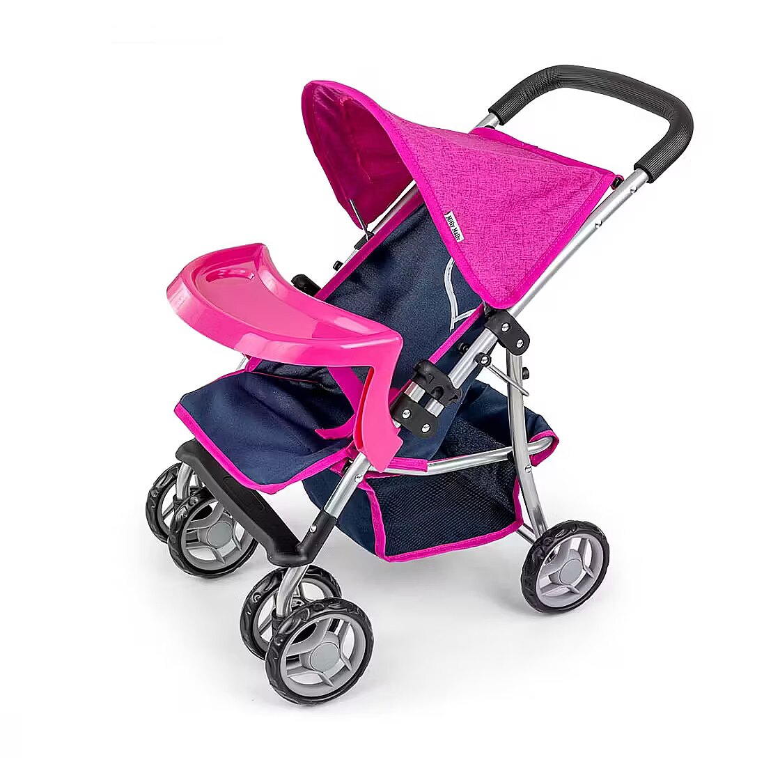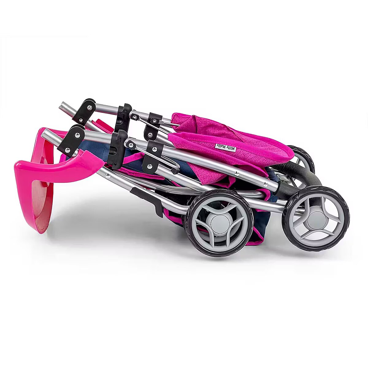 Description - The Kate doll pram by Milly Mally, is made of high quality materials. The functions and design of the doll pram resemble a real baby pram. Kate is a pushchair for dolls up to 50 cm in length. It is equipped with a foldable canopy, feeding tray, straps and swivelling front wheels. In addition, it has a basket for doll accessories that are essential when walking, including milk bottles, clothes and nappies. Metal frame Swivel front wheels Detachable tray Straps Foam wheels Handle with foam padding Foldable canopy Self-folding safety device Lower net for shopping Pram folds flat Washable polyester fabric cover Available in four colour variants Candy, Prestige Navy, Prestige Mint, Prestige Pink.