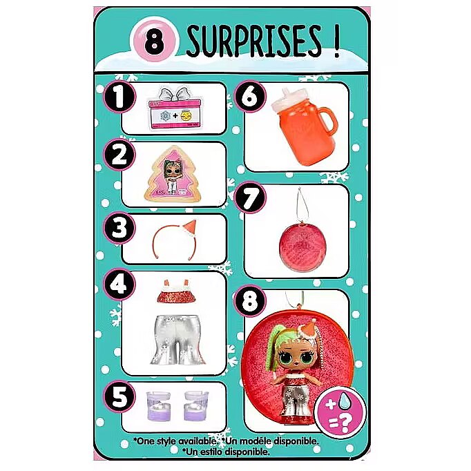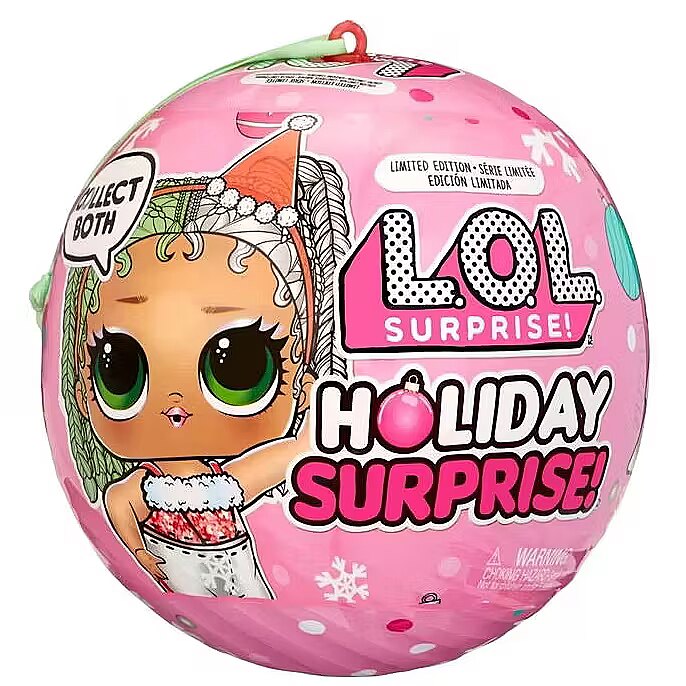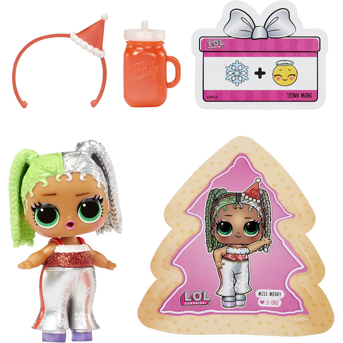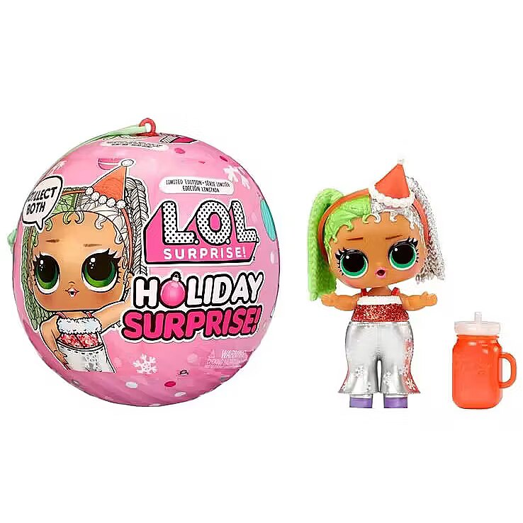LongDesc - Introducing L.O.L. Surprise! Holiday Surprise™ - Miss Merry! Miss Merry is ready to celebrate her favorite winter holidays in style! Both Baking Beauty and Miss Merry love gift shopping for their besties, sipping hot cocoa, and making snow angels! Miss Merry is ready to ring in the new year in glittery style with sparkling fashions, shoes, bottle, accessories, ornament ball, sticker, and secret message! Miss Merry comes with a water surprise! Will yours spit, cry, or tinkle? Feed them to find out! Includes: (1) 1 Limited edition L.O.L. Surprise! Holiday Present Surprise™ doll; (2) Outfit; (3) Shoes; (4) Bottle; (5) Accessory; (6) Sticker; (7) Secret Message; (8) Ornament Ball. LOL Surprise collectible dolls with stylish hair, fun to dress outfits and many detailed accessory pieces make a perfect toy and playset for kids including 4- to 7-year-olds and up girls and boys for imaginative pretend play! As birthday gifts and gifts for any special occasion, dolls provide hours of social play with siblings and friends! From MGA Entertainment, creators of Bratz® fashion dolls, LOL Surprise and LOL Surprise OMG fashion and collectible dolls and pets, Rainbow High™ posable fashion dolls, Mermaze Mermaidz™ mermaid dolls with color change, MGA's Miniverse™, Na Na Na Surprise dolls, MGA's Dream Ella™ fashion fairy princess and unicorn dolls, MGA's Glitter Babyz™, Lalaloopsy™, Baby Born® Surprise baby dolls and collectibles, Little Tikes® kids' toys and many other favorite brands.