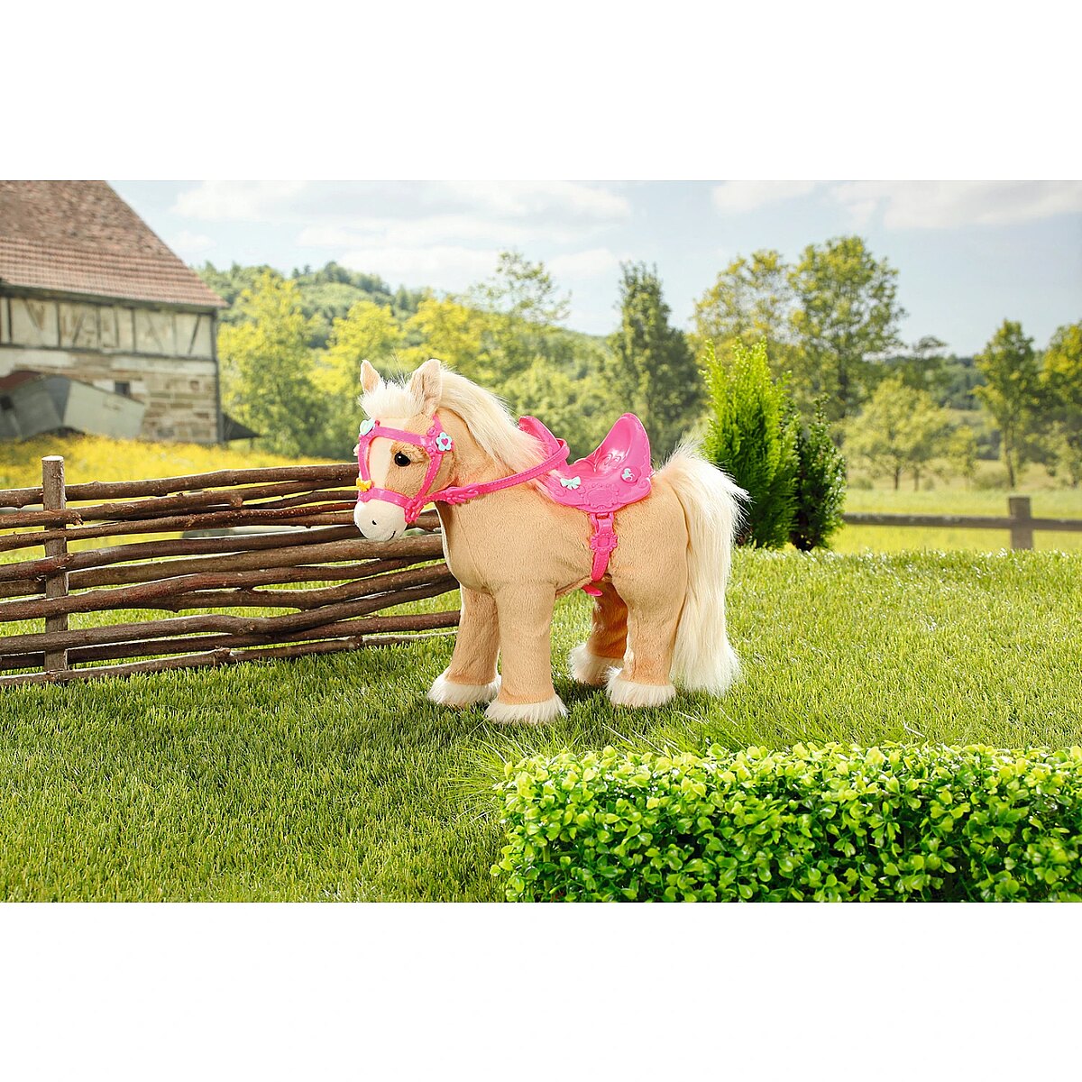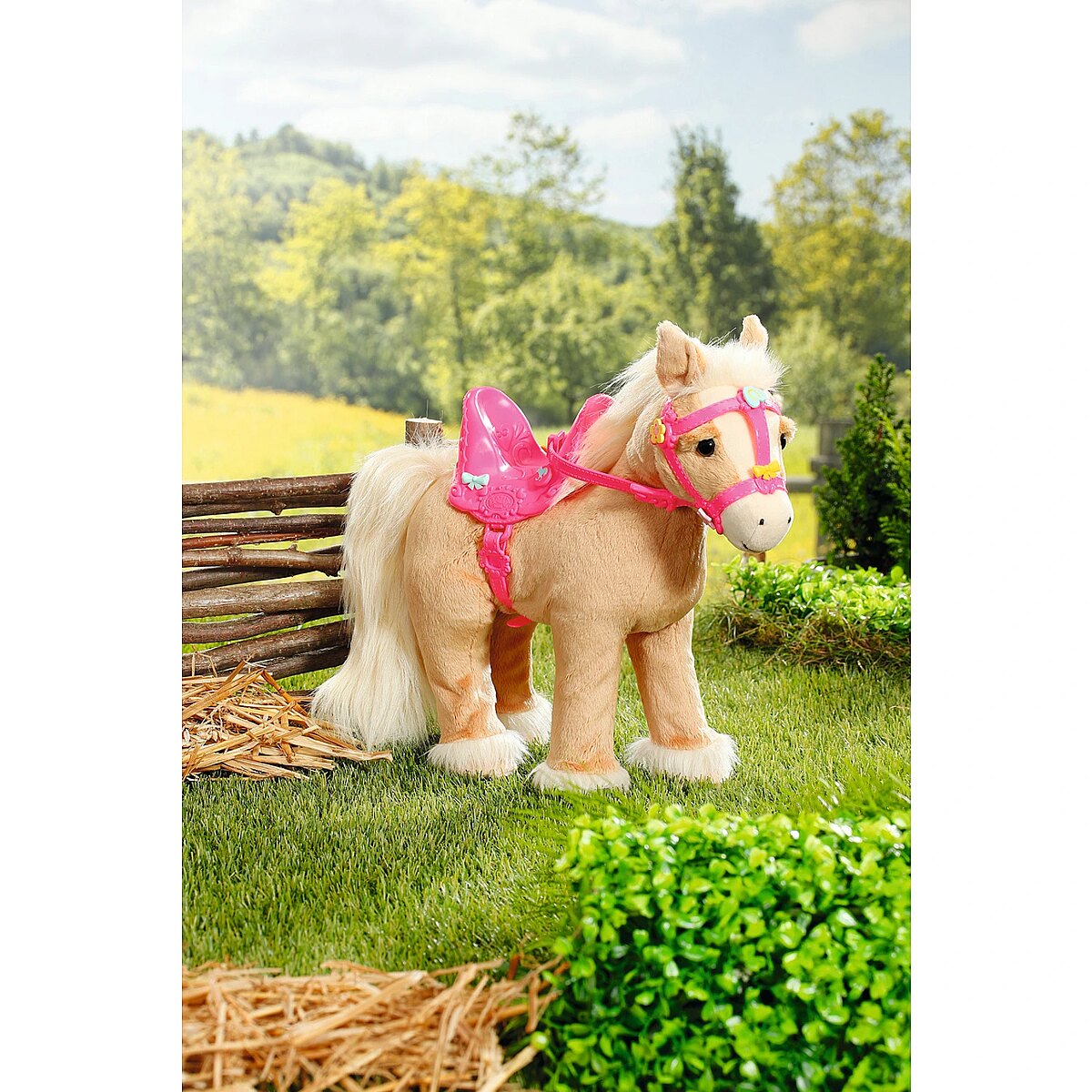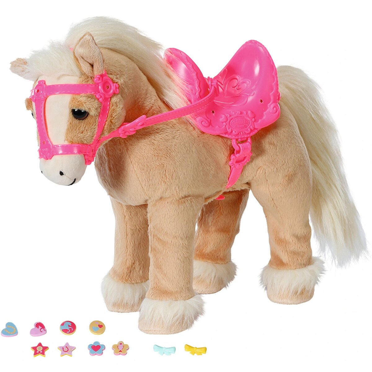 Technical_details - BABY born® My Cute Horse, cuddly toy When BABY born is in the pit lane and takes the pins out of the horse box, a horse show is definitely on the agenda. Then she always trims her sweet pony in a particularly pretty way. The pink saddle and the pink bridle are decorated with colorful pins and the white mane and white tail are extensively coiffed. The cute little horse already knows exactly what's going on and whinnies excitedly. It does when its right ear is pressed. By pressing the left ear, the horse starts to move. It prefers to run on flat surfaces. The sound of hoofbeats and happy horse noises can be heard. Another pressure on the left ear stops the riding excursion. Type: stuffed animal EAN code: 4001167831168 Manufacturer number: 831168 Series: BABY born® Contents/Equipment: BABY born My Cute Horse with saddle, bridle and pins Age recommendation: from 36 months Target group: kindergarten children Material: fabric audio: yes Warnings: Caution: Not suitable for children under 36 months! Warnings: Attention: Danger of suffocation due to small parts! Accessories: required | 4 AA batteries