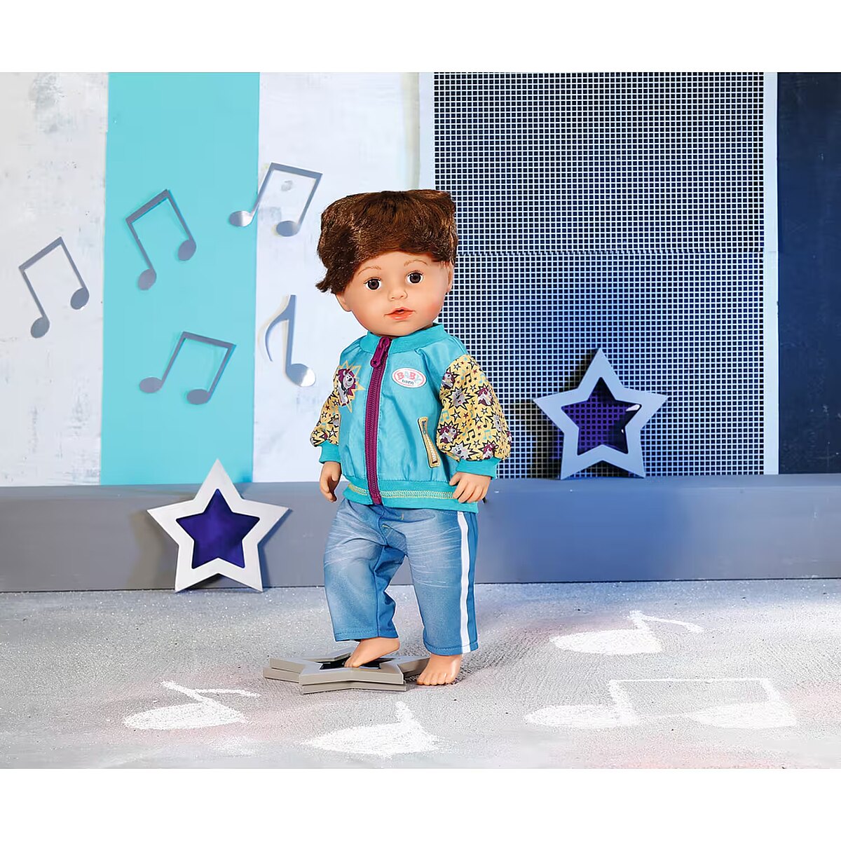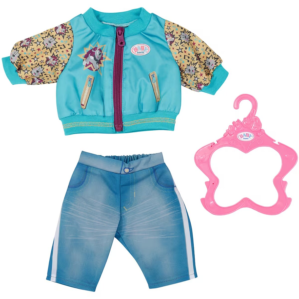 LongDesc - BABY born has already tried a lot of things. Right now, there is a disco fox course at the dance school. She has never seen a fox dance, but her animal friends Bruna and Bello can dance too. They both come along for dancing classes in the form of a print on her turquoise bomber jacket with blackberry-red zip. The yellow arms of the stylish top are decorated with disco stars and musical notes. To match, the little dancer is wearing a pair of trousers in jeans look with dynamic stripes on the side. - High-quality clothing for the BABY born branded doll.- For enhanced, diverse and long-lasting fun through play. BABY born Outfit with Jacket 43cm including clothes hanger.