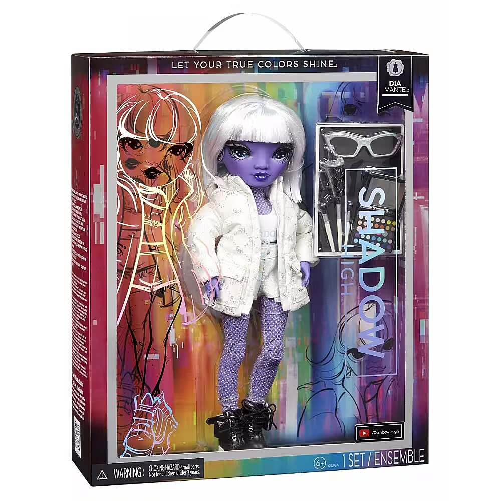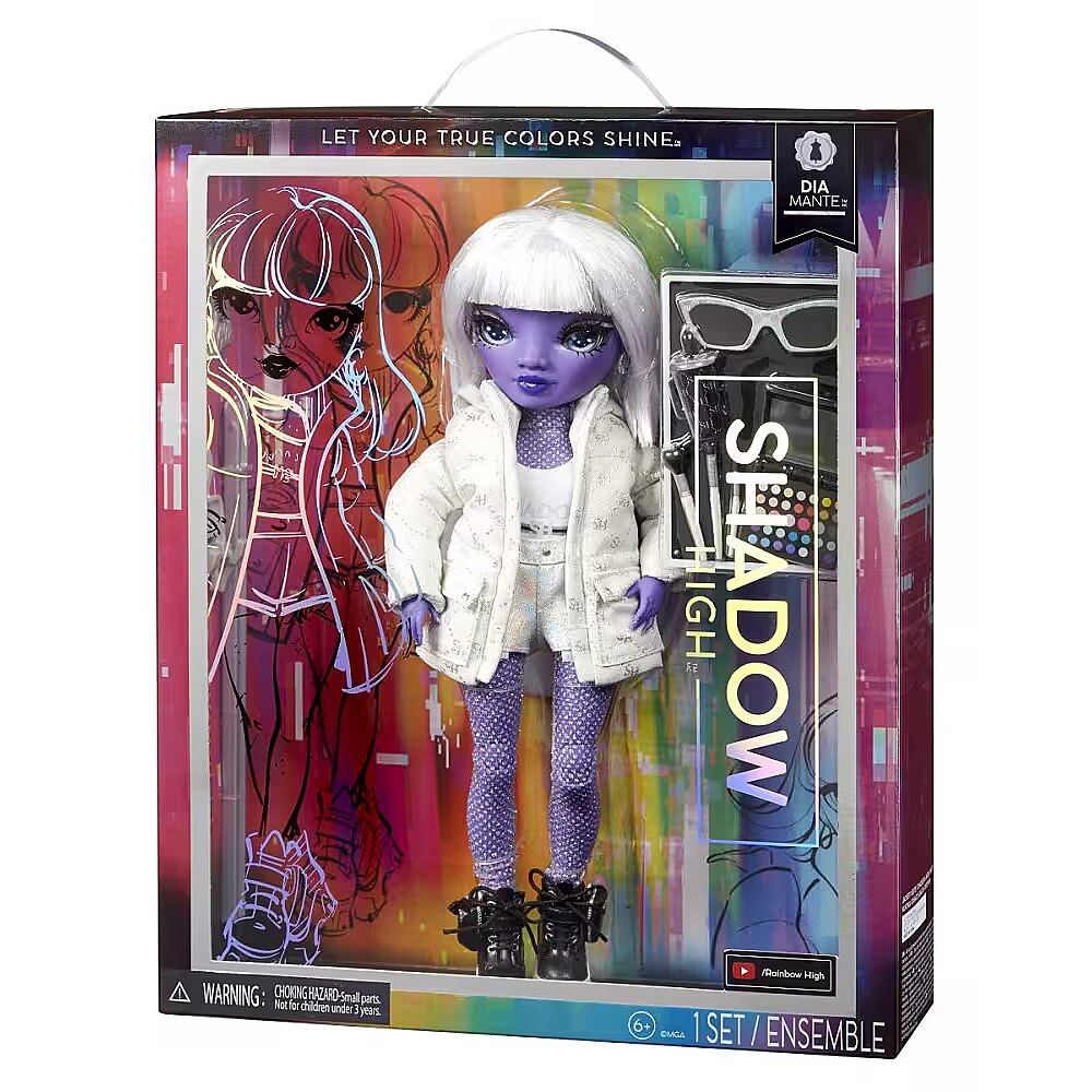 LongSummaryDescription - Rainbow High Shadow High S23 Fashion Doll- Dia Mante (Purple). Doll type: Fashion doll, Doll's gender: Female, Recommended age (min): 4 yr(s), Suggested gender: Boy/Girl. Height: 280 mm. Material: Plastic, Textile, Product colour: Assorted colours