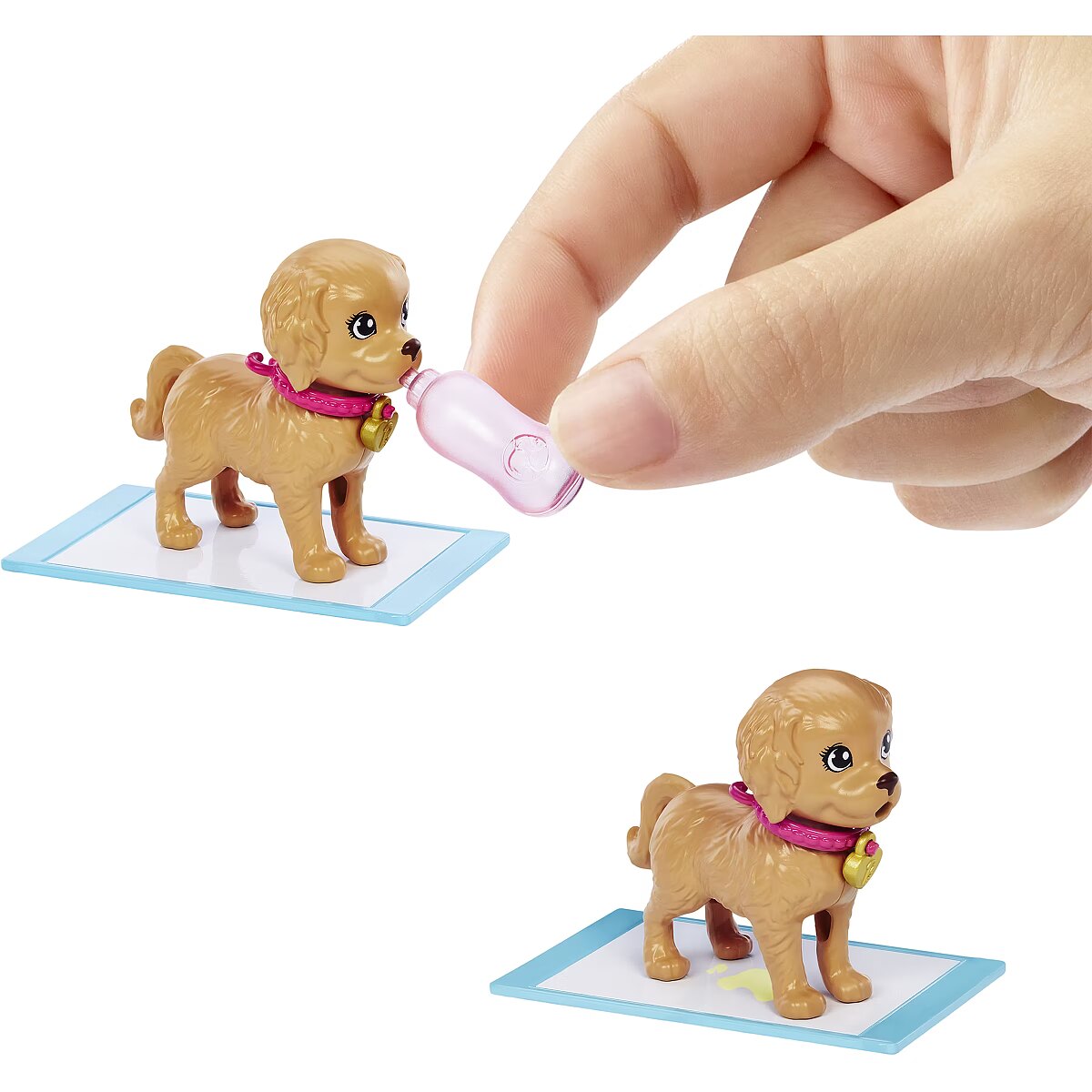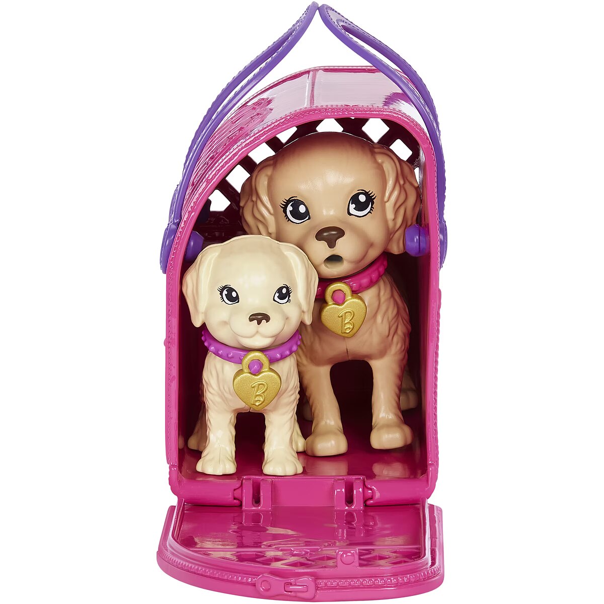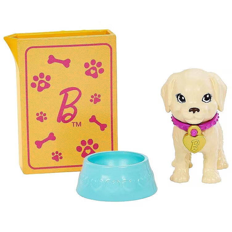 Packaging content - Packaging content - Includes 1 Barbie doll wearing dress and shoes, 1 colour-change puppy and 1 drinking/peeing puppy each with collar and dog tag, 1 colour-change pee pad, 1 pet carrier, 1 pet bed, 1 food bowl, 1 bottle, 1 bag of food, 1 treat, 1 towel, 1 dog toy, 1 leash and 2 adoption certificates. Doll cannot stand alone. Colours and decorations may vary.