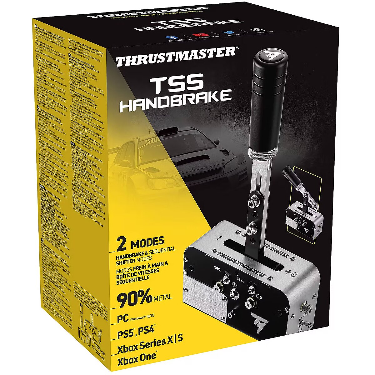 LongDesc - Master the art of Rally racing with TSS Handbrake, and take on the challenges of the most demanding racing circuits! Two modes are available: progressive handbrake mode for better control of turns and drifting, and sequential shifter mode for controlled and responsive gear shifting. Inspired by real-world professional equipment, its realism will transport you for total immersion. Crafted of 90% metal (steel and aluminum structure), its components are of high quality for better resistance. It also features H.E.A.R.T (HallEffect AccuRate Technology) technology with contactless magnetic sensors, for precision that won't decrease over time.TSS Handbrake is compatible with PC (Windows 10/11), Xbox Series X|S and Xbox One, PS5 and PS4 with Thrustmaster Force Feedback racing wheel bases.Two TSS Handbrake devices can be used together as handbrakes and sequential shifters, to replicate a Rally-style cockpit.MASTER THE ART OF RALLY RACING WITH TSS HANDBRAKE, AND TAKE ON THE CHALLENGES OF THE MOST DEMANDING RACING CIRCUITS!2-in-1 product: progressive handbrake mode to master every turn and drift, and sequential shifter mode for responsive gear shifting. Realistic, ergonomically-designed gear knob/handbrake lever can be adjusted to horizontal or vertical positions. Sturdy 90% metal structure, high-quality components.2-IN-1 PRODUCTTSS Handbrake offers two highly-realistic modes: progressive handbrake mode (for better control of turns and drifting), and sequential shifter mode (for controlled and responsive gear shifting).2 DIFFERENT HANDBRAKE MODESTSS Handbrake lets the user adapt the handbrake's position to suit the game's configuration: vertical position for Rally mode, or horizontal position for GT mode. A kit is included in the box, allowing the user to adjust the lever's inclination.HIGH-QUALITY EQUIPMENTTSS Handbrake is crafted of 90% metal: steel and aluminum. Its components are of high quality, including German-made slide bearings, and industrial-class flat coil springs with 8.8 lb/4 kg of resistance.MAGNETIC SENSORSTSS Handbrake features H.E.A.R.T (HallEffect AccuRate Technology) technology with magnetic sensors, for surgical precision that won't decrease over time.REALISTIC SIZE1:1 scale version of a real handbrake, with a knob shaped to fit the user’s hand: enjoy realism that will transport you, for total immersion in the world of racing!COMPLETE RACING ECOSYSTEMTSS Handbrake is the latest addition to Thrustmaster's Racing ecosystem, featuring a wide selection of racing wheels, pedal sets, wheel rims, and add-ons. TSS Handbrake can be mounted in a cockpit, or attached to TM Racing Clamp (sold separately).