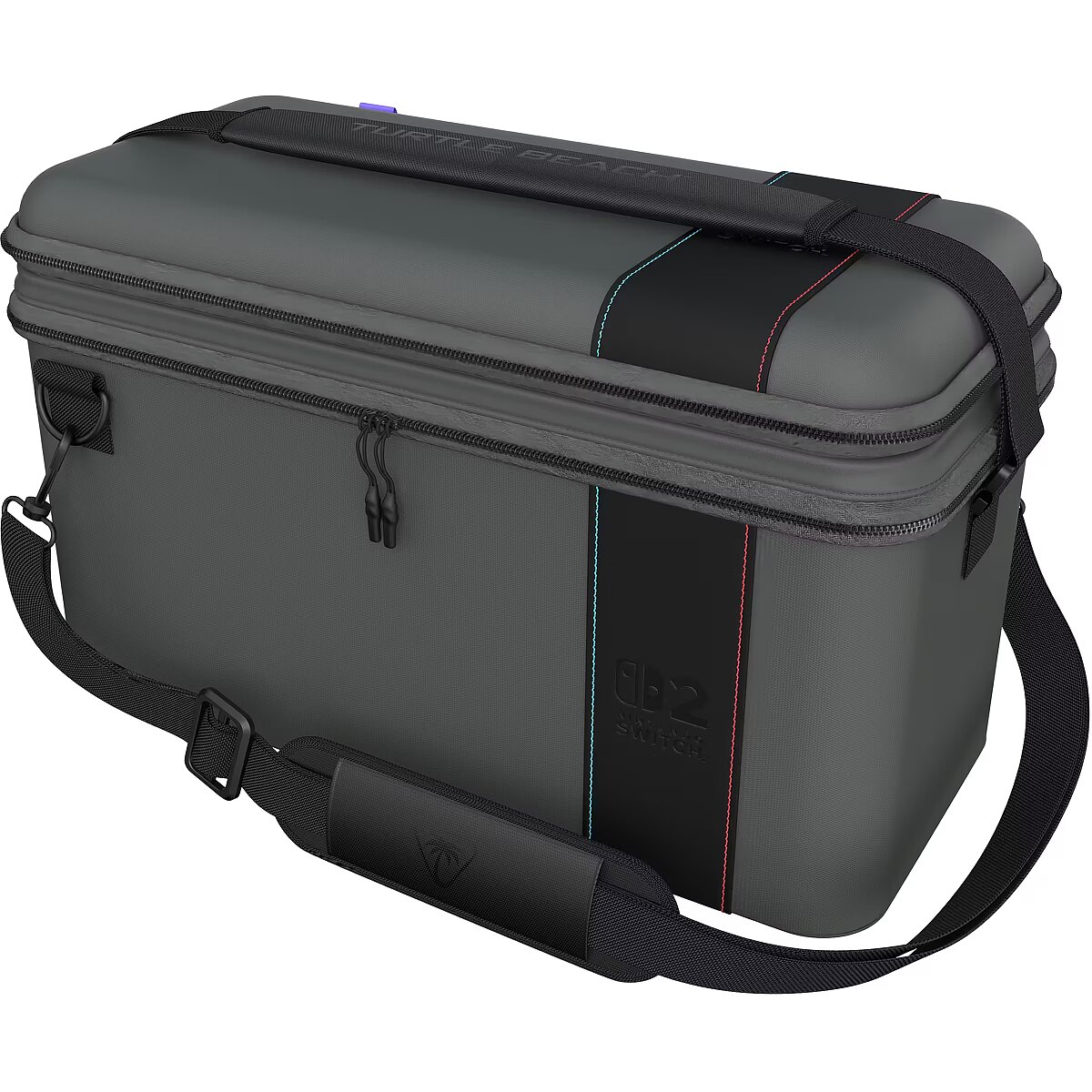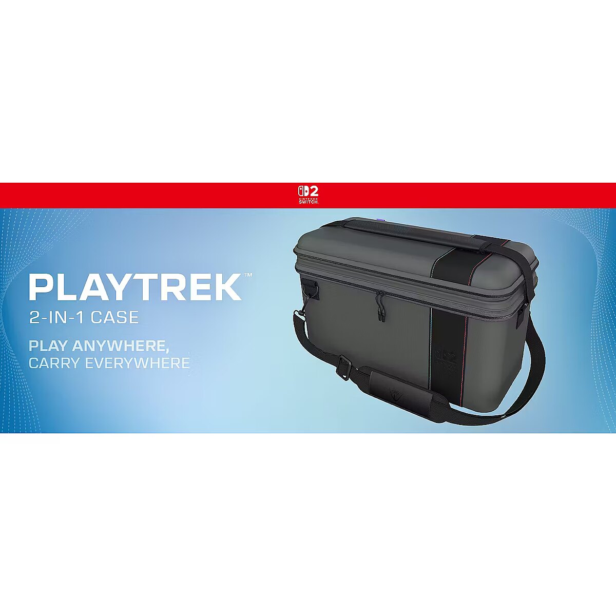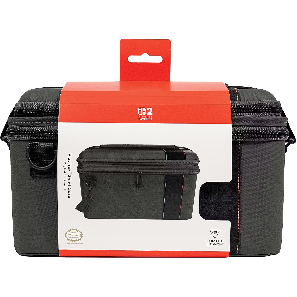 LongDesc - The Turtle Beach® PlayTrek 2-in-1 Case for Nintendo Switch™ 2 is the all-in-one travel and storage solution for your console and accessories. The detachable top case keeps your console safe with a padded screen flap, a zippered mesh pocket, and game card slots. Below, a spacious compartment stores your dock, AC adapter, extra Joy-Con™ Controllers and a wireless controller. Built with a ridged EVA molded shell and TPU-coated polyester exterior, this case delivers durability with style. A neoprene handle, adjustable should straps, and official Nintendo® licensing make it perfect for travel, tournaments, or everyday gaming.