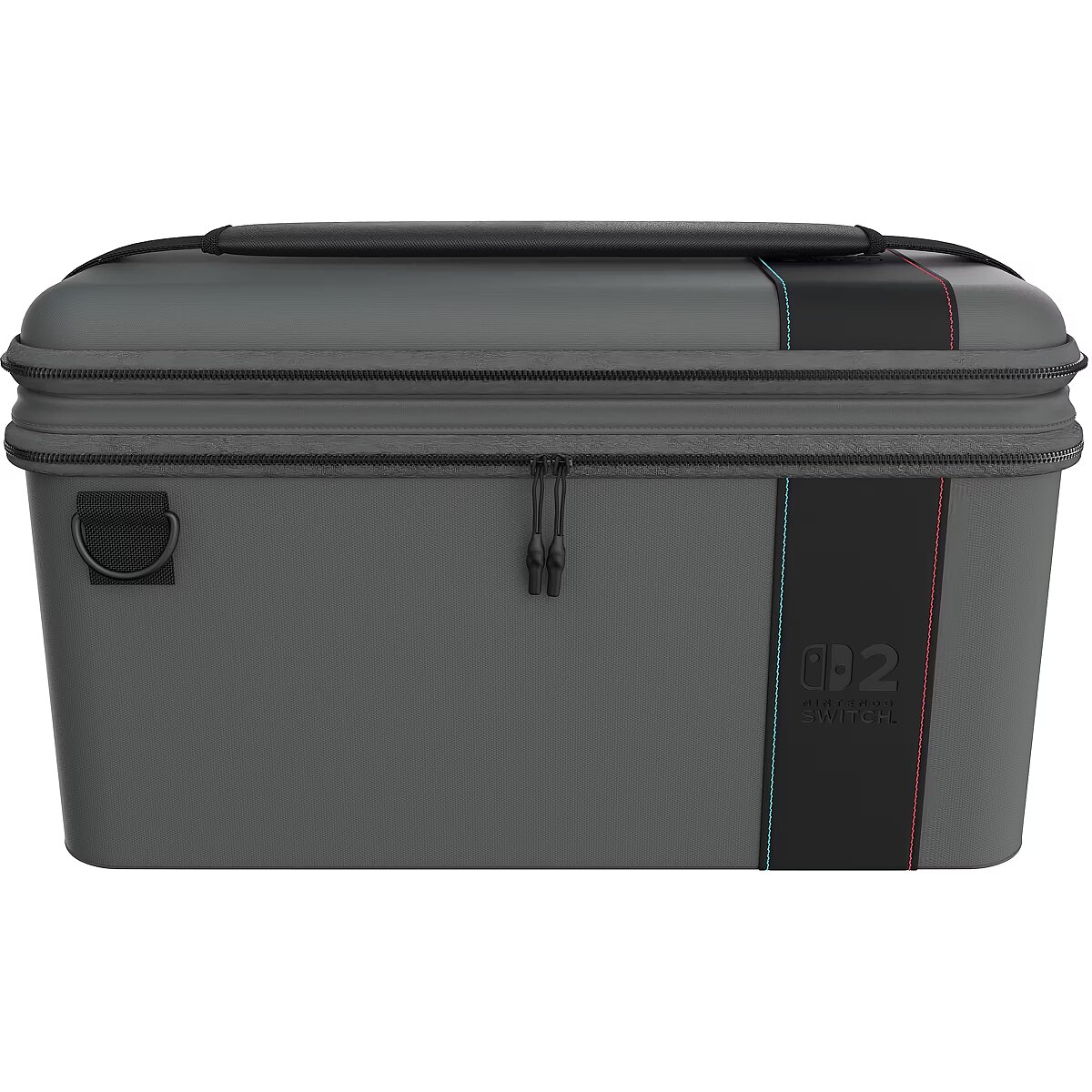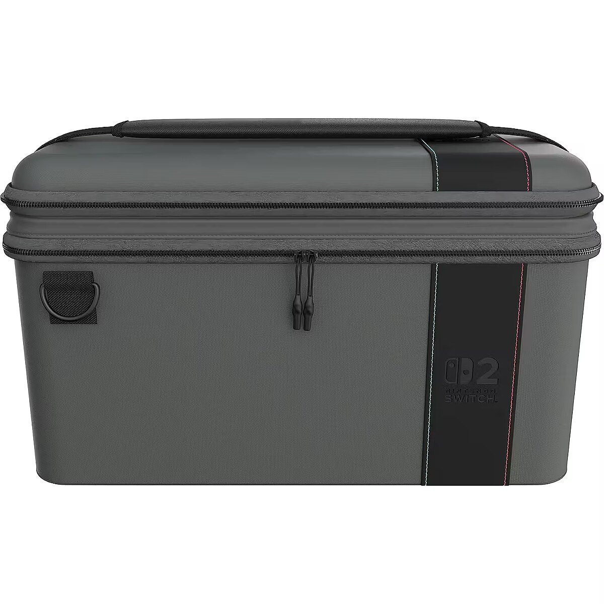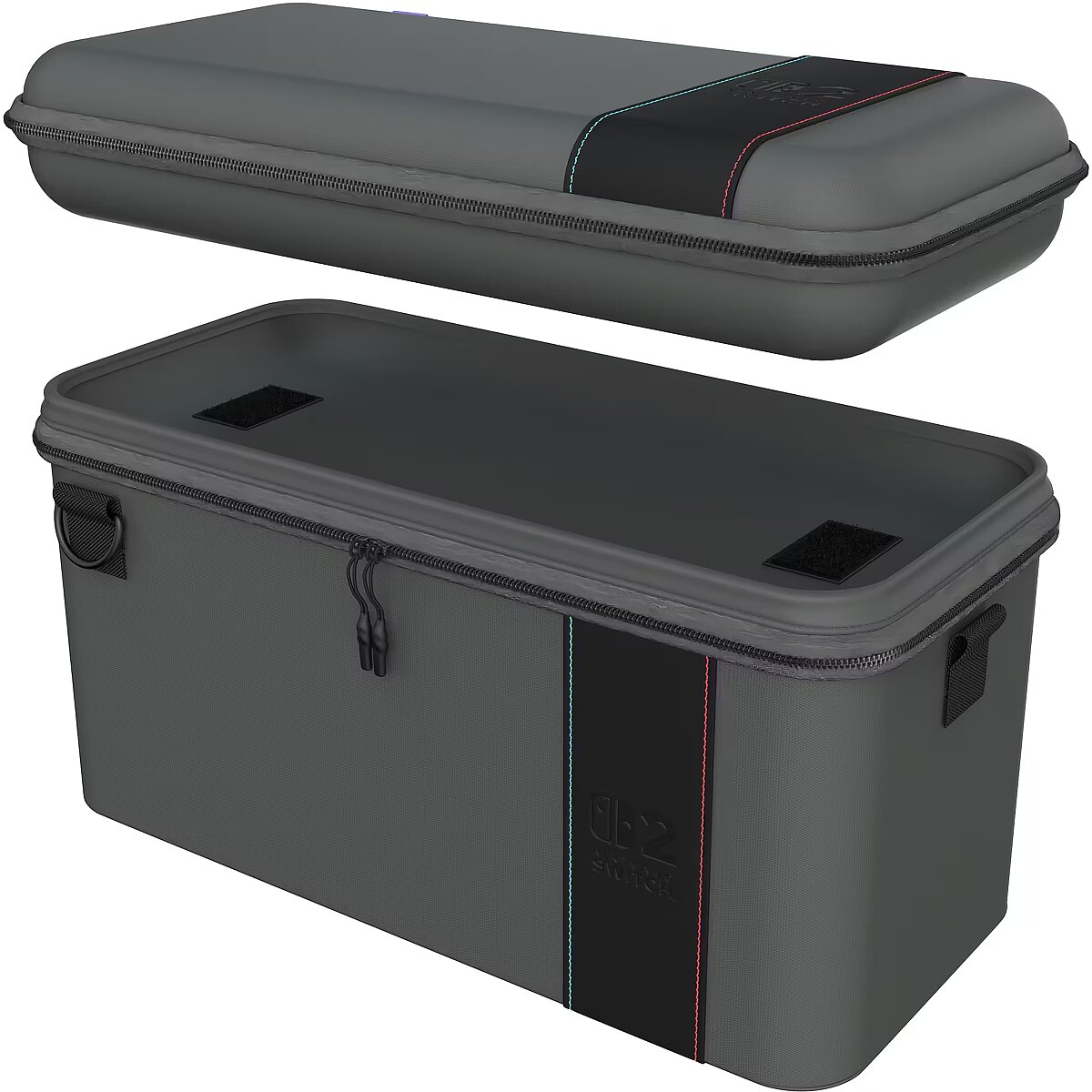 LongDesc - The Turtle Beach® PlayTrek 2-in-1 Case for Nintendo Switch™ 2 is the all-in-one travel and storage solution for your console and accessories. The detachable top case keeps your console safe with a padded screen flap, a zippered mesh pocket, and game card slots. Below, a spacious compartment stores your dock, AC adapter, extra Joy-Con™ Controllers and a wireless controller. Built with a ridged EVA molded shell and TPU-coated polyester exterior, this case delivers durability with style. A neoprene handle, adjustable should straps, and official Nintendo® licensing make it perfect for travel, tournaments, or everyday gaming.