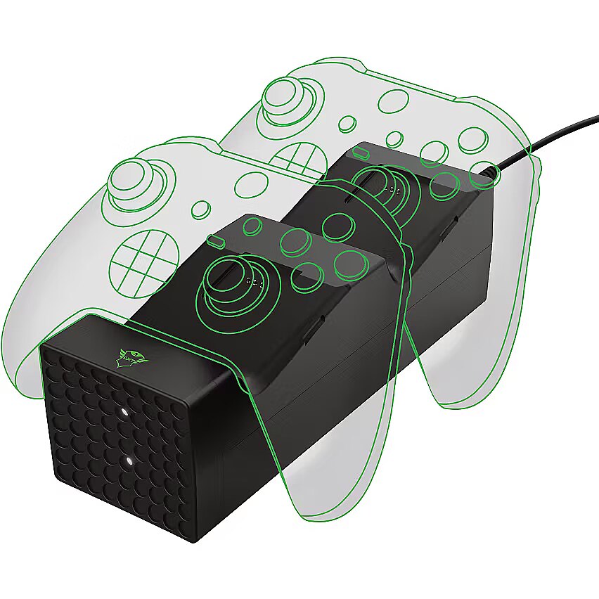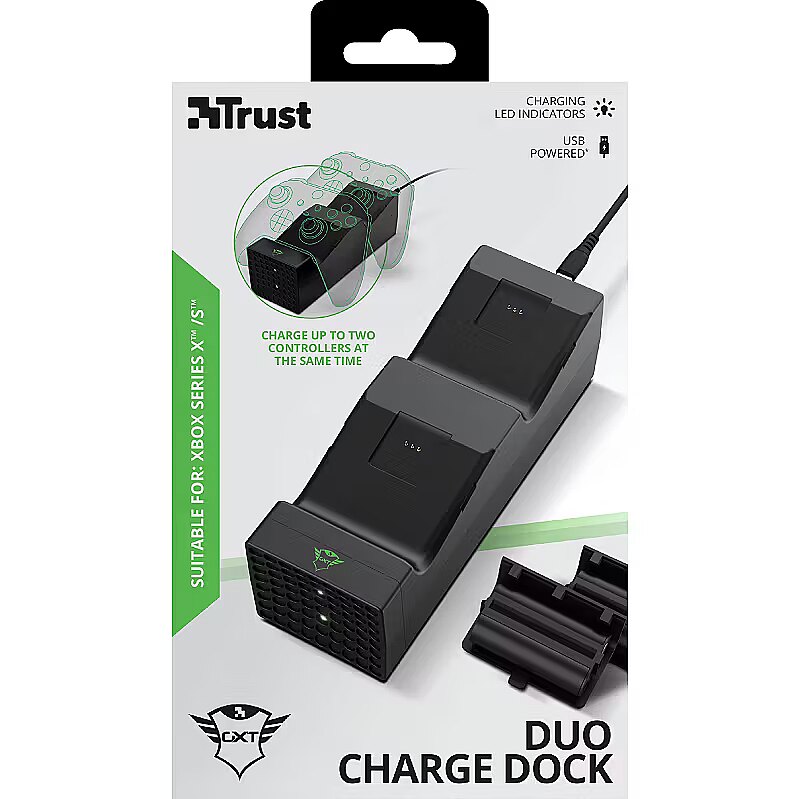 LongDesc - Take Back PowerNever worry about empty controllers again. The Trust GXT 250 Duo Charging Dock for Xbox Series X | S will always have your controllers ready and charged thanks to the included battery packs and dual-charge function.Stop Wasting BatteriesThe controller for the latest Xbox still works on disposable batteries. Well, no more. The Duo Charging Dock comes with two rechargeable battery packs, making this solution not just great for the environment, but it saves a lot of money too. And because you’ll recharge both battery packs at ones in this dock, it also saves you valuable time.It FitsThe GXT 250 Duo Charging Dock resembles the look of the Xbox Series X, making it a great companion for your new console. Use the single USB cable to connect the dock to the console and store your controllers on top to keep them in a safe spot. By keeping your console in sleep mode, your controllers will be charged and ready to go the next time you want to play a game.