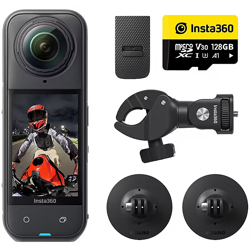 Say goodbye to distortion with just one tap, for a more natural perspective. Perfect for landscapes or shots with your friends! Your creativity, unleashed Bullet Time. Spin your X5 and get that classic cinematic shot in slow-mo. Starlapse. Why just look at the night sky? Capture star trails and epic nightscapes with angles no other camera can match. Timeshift. Hyperlapse, but cranked to 11. Speed up, slow down, and throw your viewers into the action with fluid, dynamic motion. Timelapse. Time flies... and now you can capture it. From sunrises to cityscapes, X5 keeps your shots steady and stunning. Motorcycle Bundle set includes: