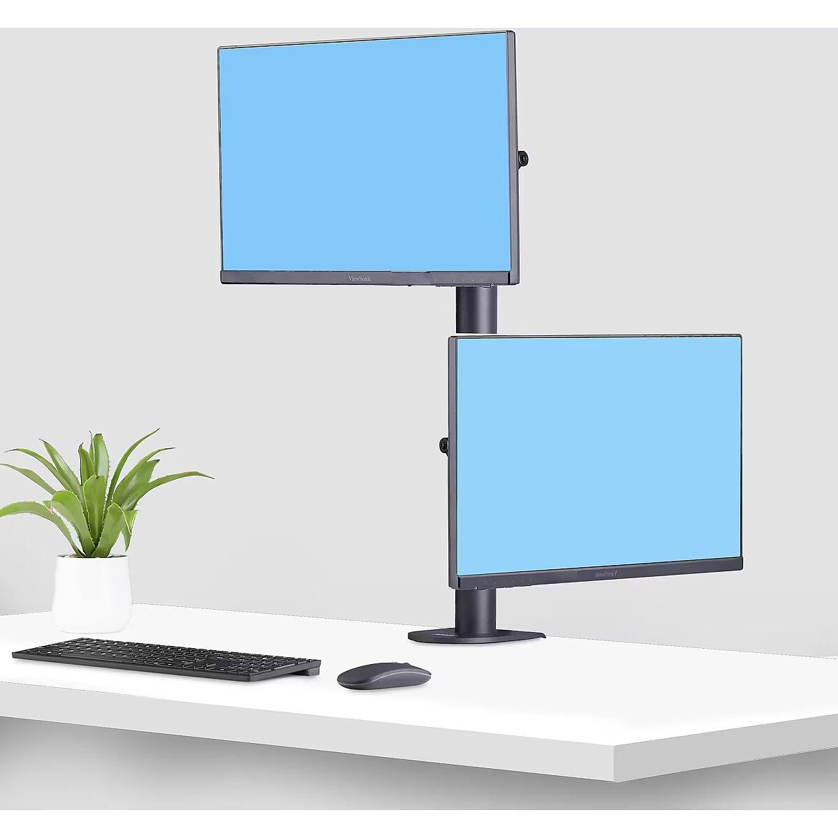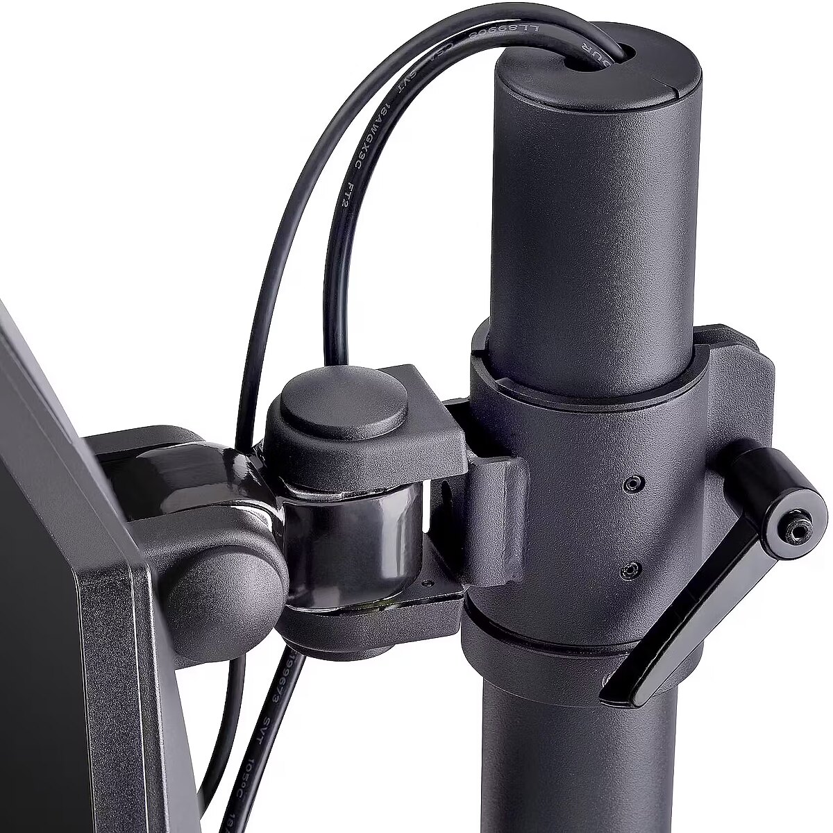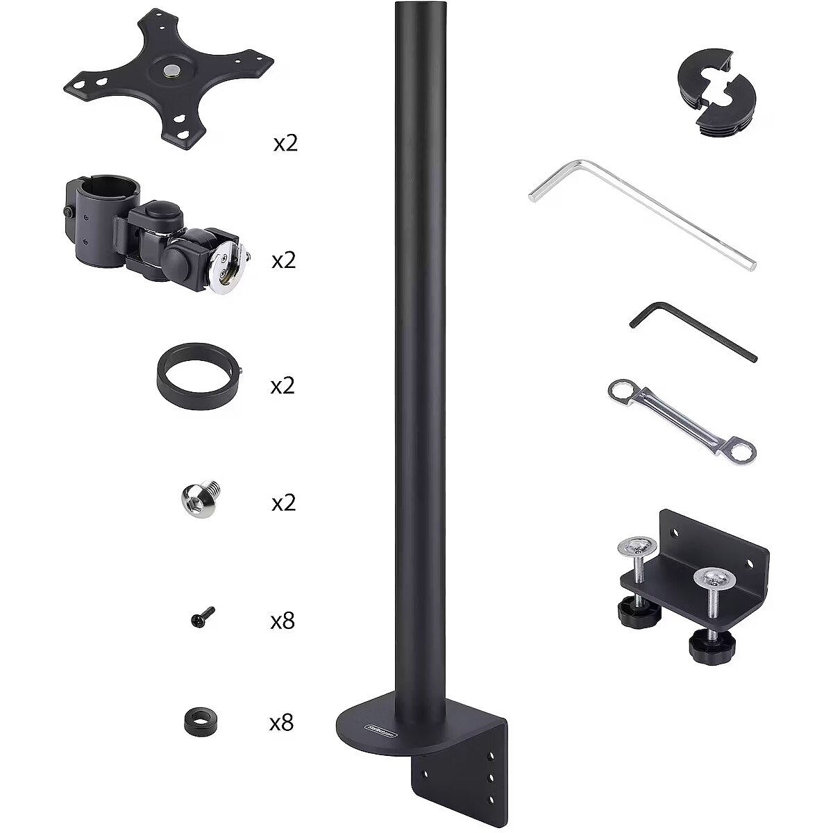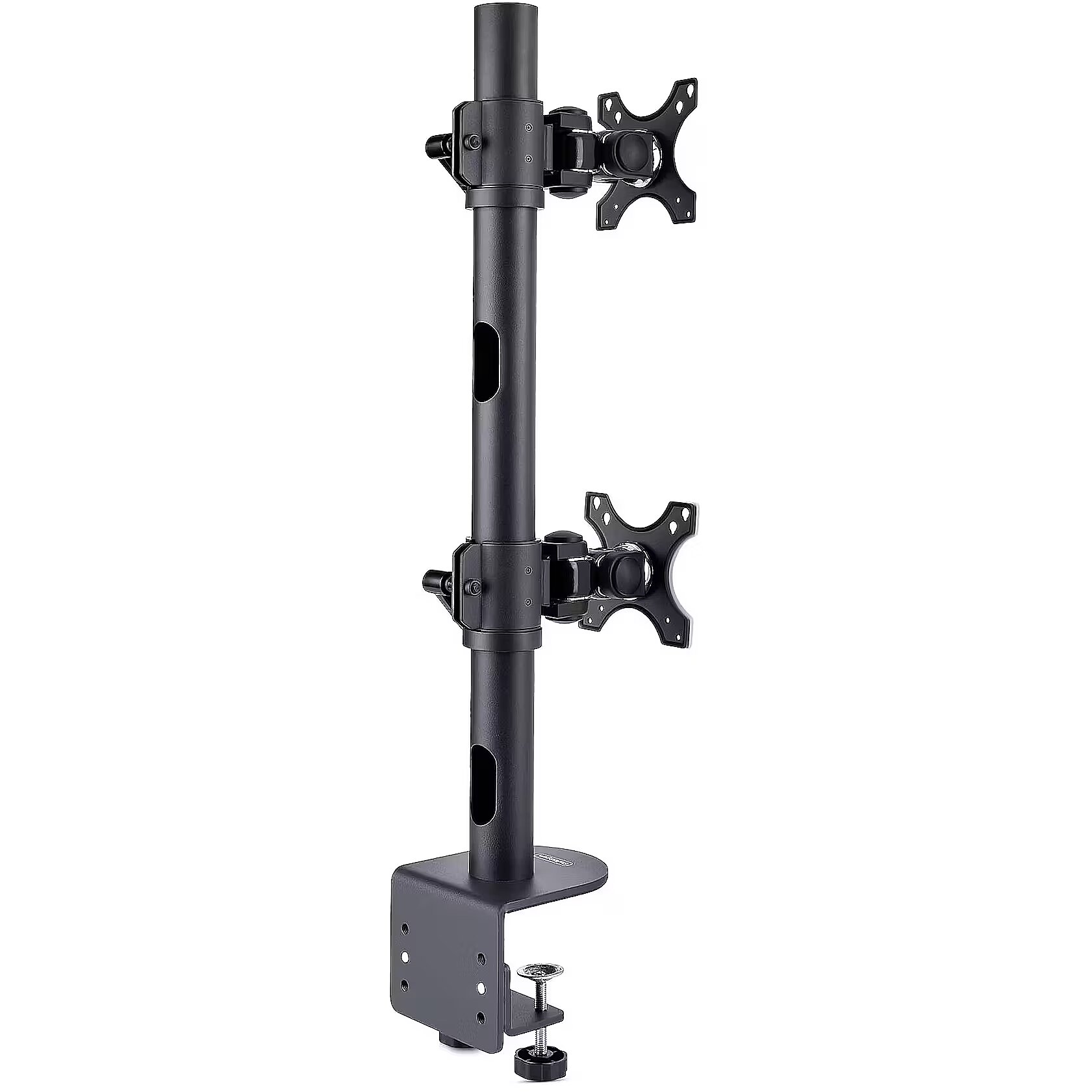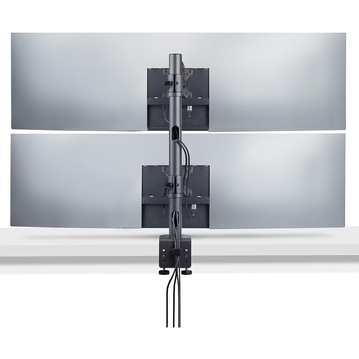 LongDesc - Heavy-duty dual monitor desk mount with support for up to 49" monitorsThis dual ultrawide display monitor mount is engineered to support up to two vertically stacked 49-inch 32:9 aspect ratio curved screens, providing an enhanced workspace for data aggregation and multi-window applications. The monitor desk mount is TAA-compliant.Robust Weight CapacityWith a total weight capacity of 35.3lb (16kg) per VESA mount, the vertically stacked mount provides a secure and stable solution for mounting heavy monitors whether they are standard (4:3), widescreen (16:9), and ultrawide (32:9).Fixed C-clamp design fits desks ranging from 1 to 3.9 inches (2.5 to 10cm) thick.Concealed Cable ManagementThe double monitor mount features concealed cable management running the cables inside the pole for an organized and clutter-free setup. The powder-coated finish enhances durability and aesthetics.Quick-Release VESA MountsDetachable VESA plates feature a toolless quick-release mechanism, simplifying display installation and removal. The mount supports VESA 75x75mm and 100x100mm standards, making it compatible with a wide range of monitors.Display AdjustmentThe mount's adjustable design enables height adjustments along the 27.4-inch (69.6cm) pole. Each monitor can be tilted and swiveled up to +/-90° and rotated 360° for seamless switching between portrait and landscape orientations. Additionally, the monitor mounts can be rotated around the pole without requiring tools, offering maximum flexibility.The StarTech.com Advantage