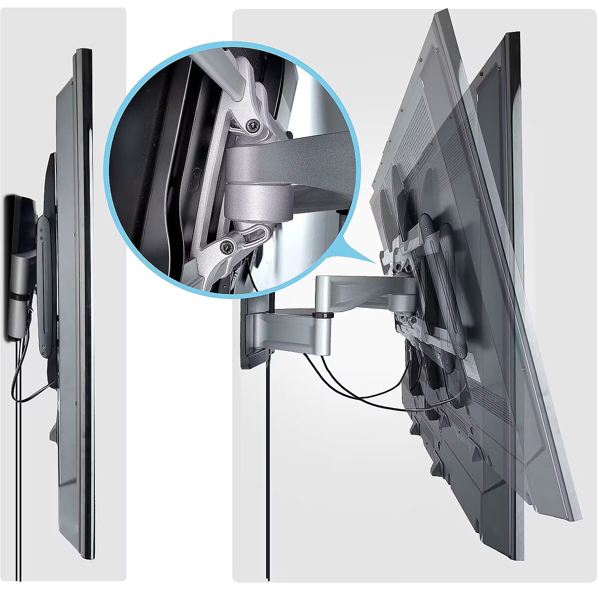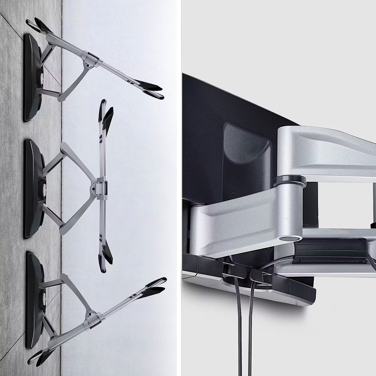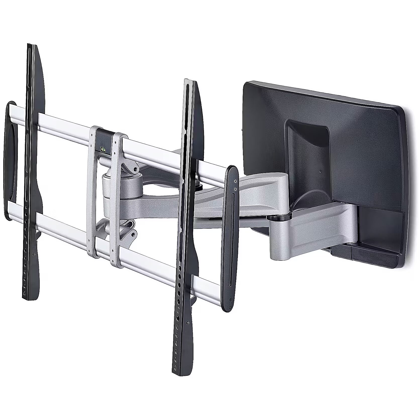 LongDesc - Mount a TV to a wall using this space-saving, low-profile mount with premium finishCreate a TV mounting solution with this articulating wall mount that supports up to 100-inch and 187.4lb (85kg) televisions. Use in conference rooms, customer-facing applications, and collaborative spaces where durability, precision, and presentation matter.Heavy-Duty Articulating Television MountThe mount collapses to just 4.1in (10.5cm) from the wall and extends to 21.6 in (55 cm) for easy access behind the TV. Dual-stud mounting (16in spacing) and dual-arm design ensure safe mounting and smooth motion when positioning your display. For perfect screen positioning, you can tilt (+2°/-12°) and swivel (+/-60°) for post-install adjustments to achieve the best viewing angle. The flat screen bracket is TAA-compliant to meet procurement requirements.Versatile Mounting with a Premium FinishThis VESA-compatible wall mount supports patterns up to 800x500mm and includes hardware, spacers, and a wall template for clean installation. It secures to wood studs, brick, or concrete surfaces, offering flexibility across environments. Integrated cable channels keep wires organized, while the silver steel and aluminum frame with decorative covers creates a refined, professional look from any angle.