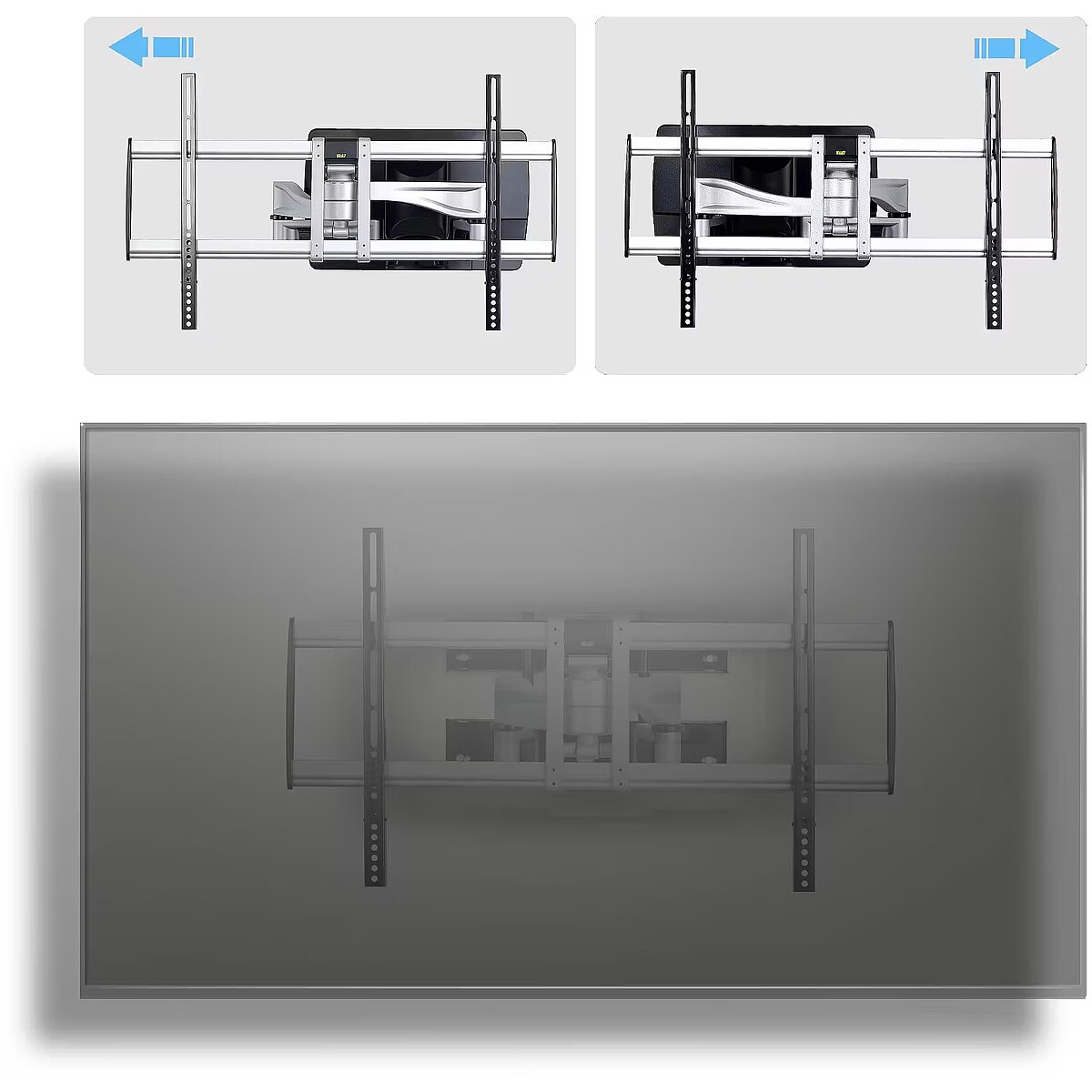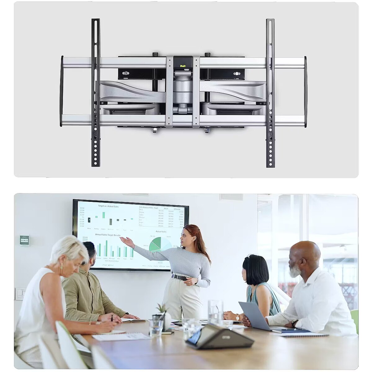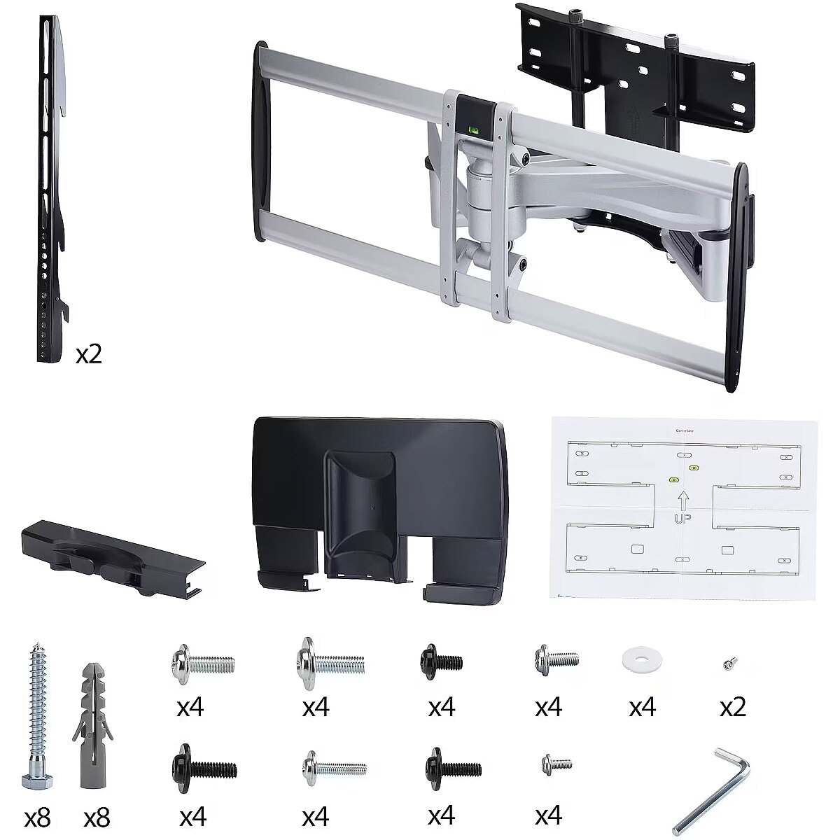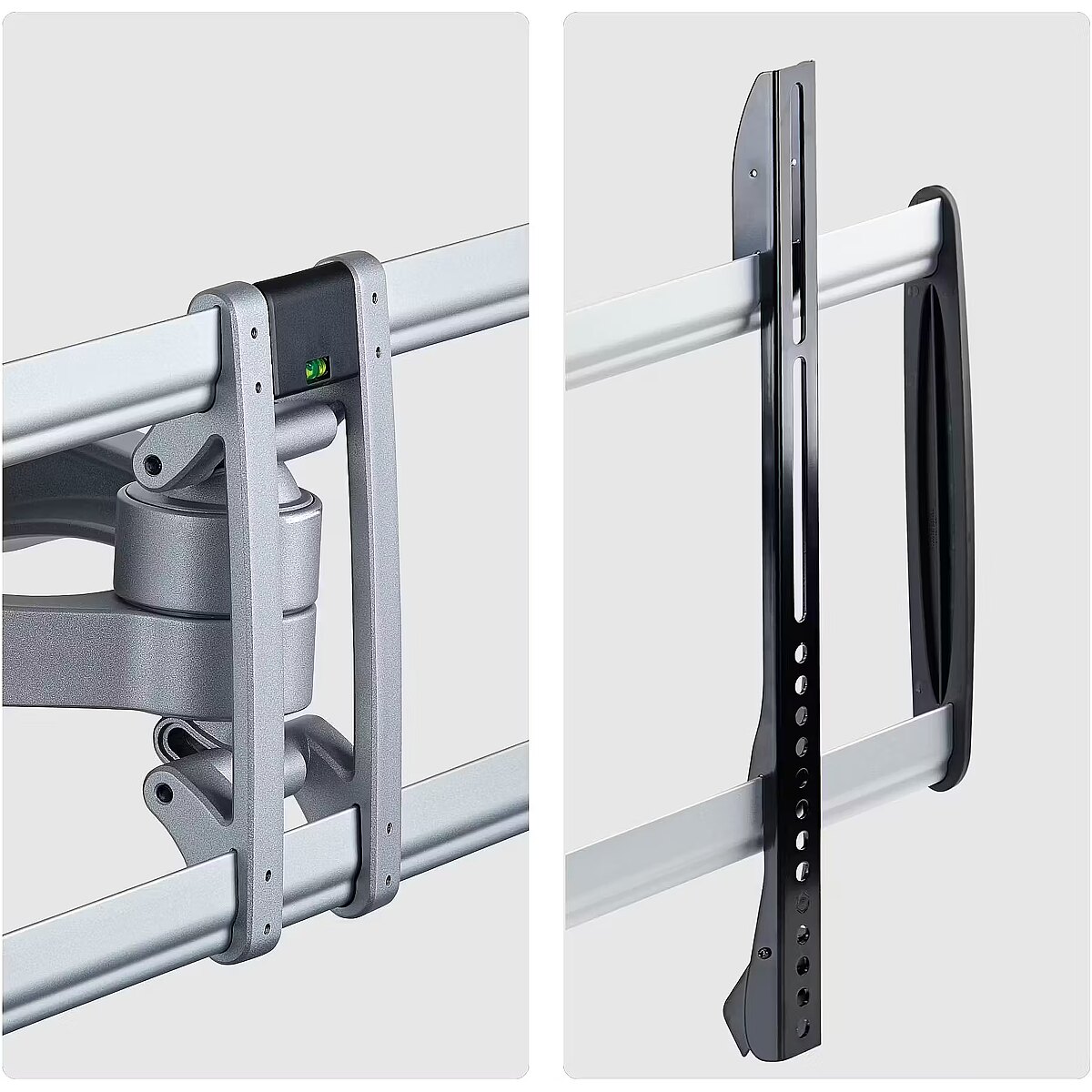 LongDesc - Mount a TV to a wall using this space-saving, low-profile mount with premium finishCreate a TV mounting solution with this articulating wall mount that supports up to 100-inch and 187.4lb (85kg) televisions. Use in conference rooms, customer-facing applications, and collaborative spaces where durability, precision, and presentation matter.Heavy-Duty Articulating Television MountThe mount collapses to just 4.1in (10.5cm) from the wall and extends to 21.6 in (55 cm) for easy access behind the TV. Dual-stud mounting (16in spacing) and dual-arm design ensure safe mounting and smooth motion when positioning your display. For perfect screen positioning, you can tilt (+2°/-12°) and swivel (+/-60°) for post-install adjustments to achieve the best viewing angle. The flat screen bracket is TAA-compliant to meet procurement requirements.Versatile Mounting with a Premium FinishThis VESA-compatible wall mount supports patterns up to 800x500mm and includes hardware, spacers, and a wall template for clean installation. It secures to wood studs, brick, or concrete surfaces, offering flexibility across environments. Integrated cable channels keep wires organized, while the silver steel and aluminum frame with decorative covers creates a refined, professional look from any angle.