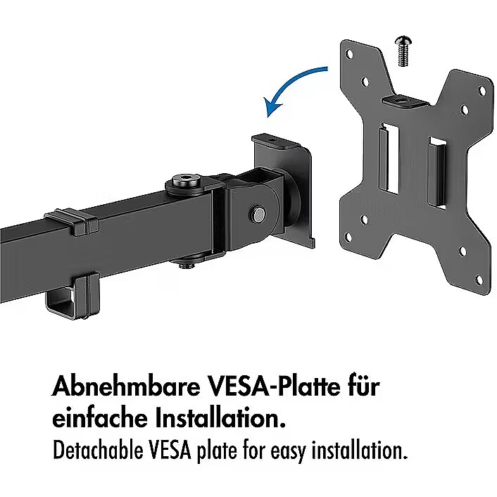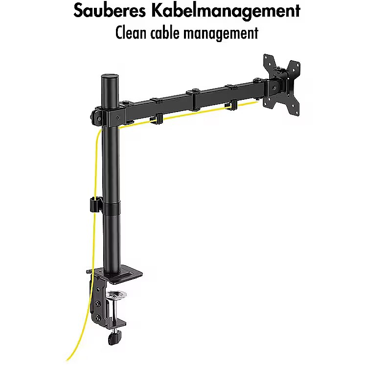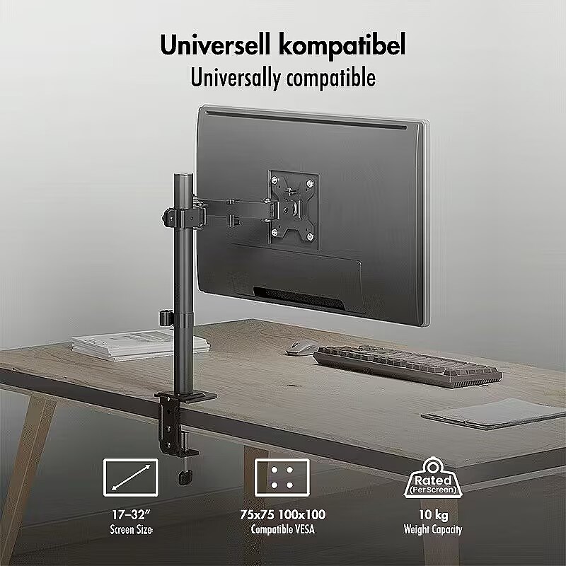 Other features - Suitable for 1732" monitors Number of monitors: 1 Mounting type: Table clamp or grommet mounting Weight capacity: 10 kg max. Maximum arm length: 376 mm Tilt: -45°/+45°, swivel: -90°/+90°, front panel rotatable: -180°/+180° Dimensions front panel WxH: 114x114 mm VESA compatibility: 75x75, 100x100 Pole height: 407 mm, pole diameter: 35 mm Freely adjustable height: For an optimal ergonomic position