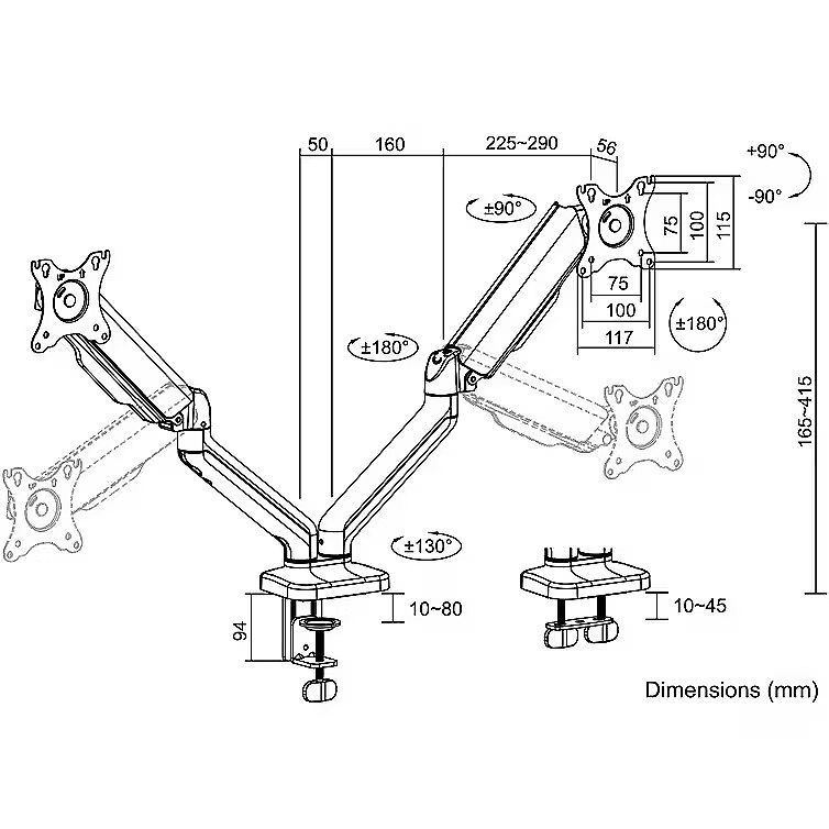 Other features - Mounting type: Table clamp (18 cm) or grommet mounting (14.5 cm) Weight capacity: Each arm 9 kg max. Dimensions front panel WxH: 115x115 mm