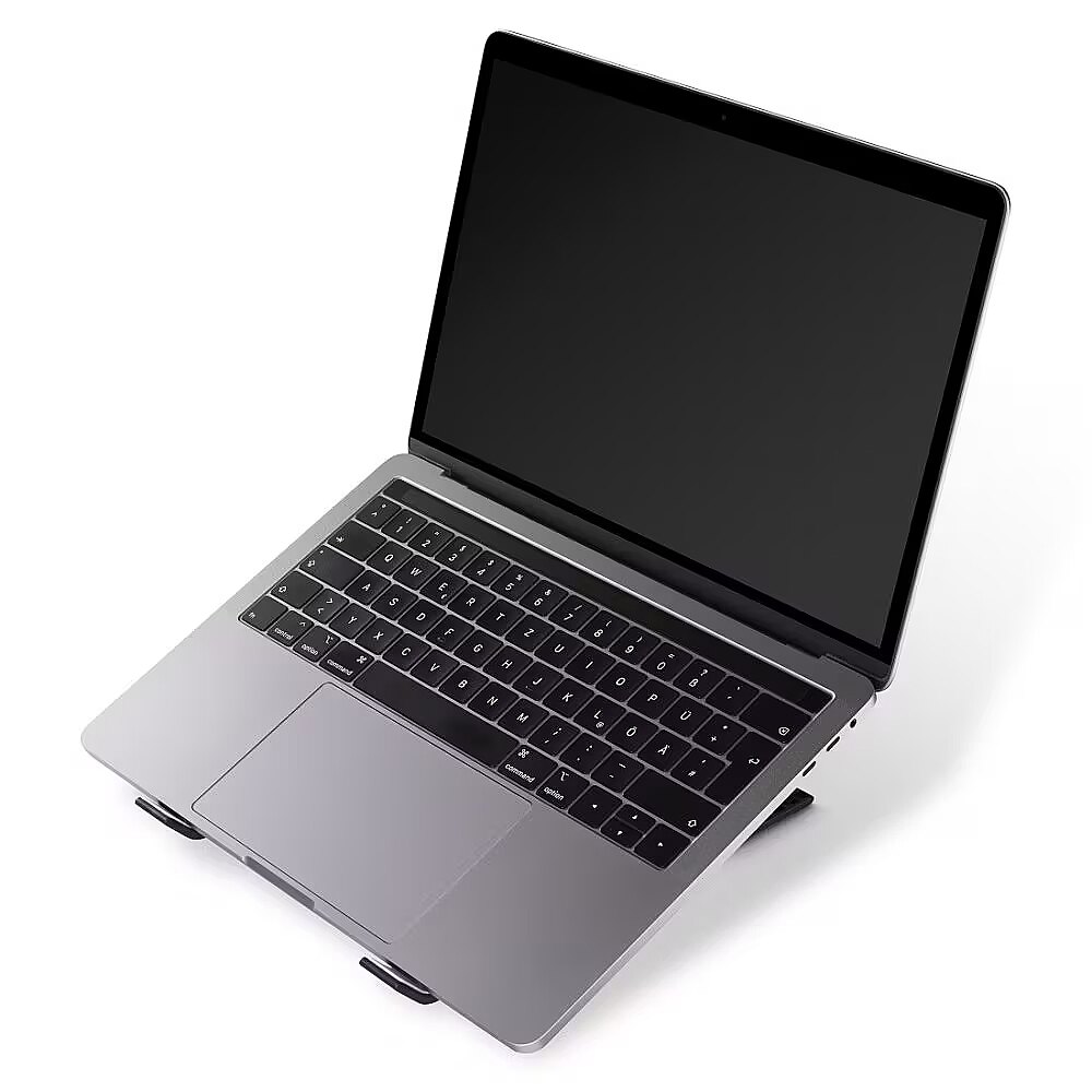 Description - Stand A stand for conveniently positioning the device Adjustable angle of tilt The flexible adjustment of the vertical angle of tilt allows for ergonomic work with the laptop while sitting or standing Non-slip rubber pads The non-slip rubber pads ensure a stable position and protect the surface from scratches Extremely light Mobile and flexible: the portable laptop stand is extremely light, making it even easier to transport Practical storage bag For storage and easy transport: the simple drawstring bag protects the notebook stand from scratches, dust, etc.