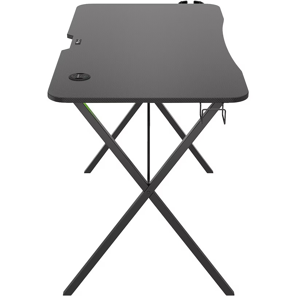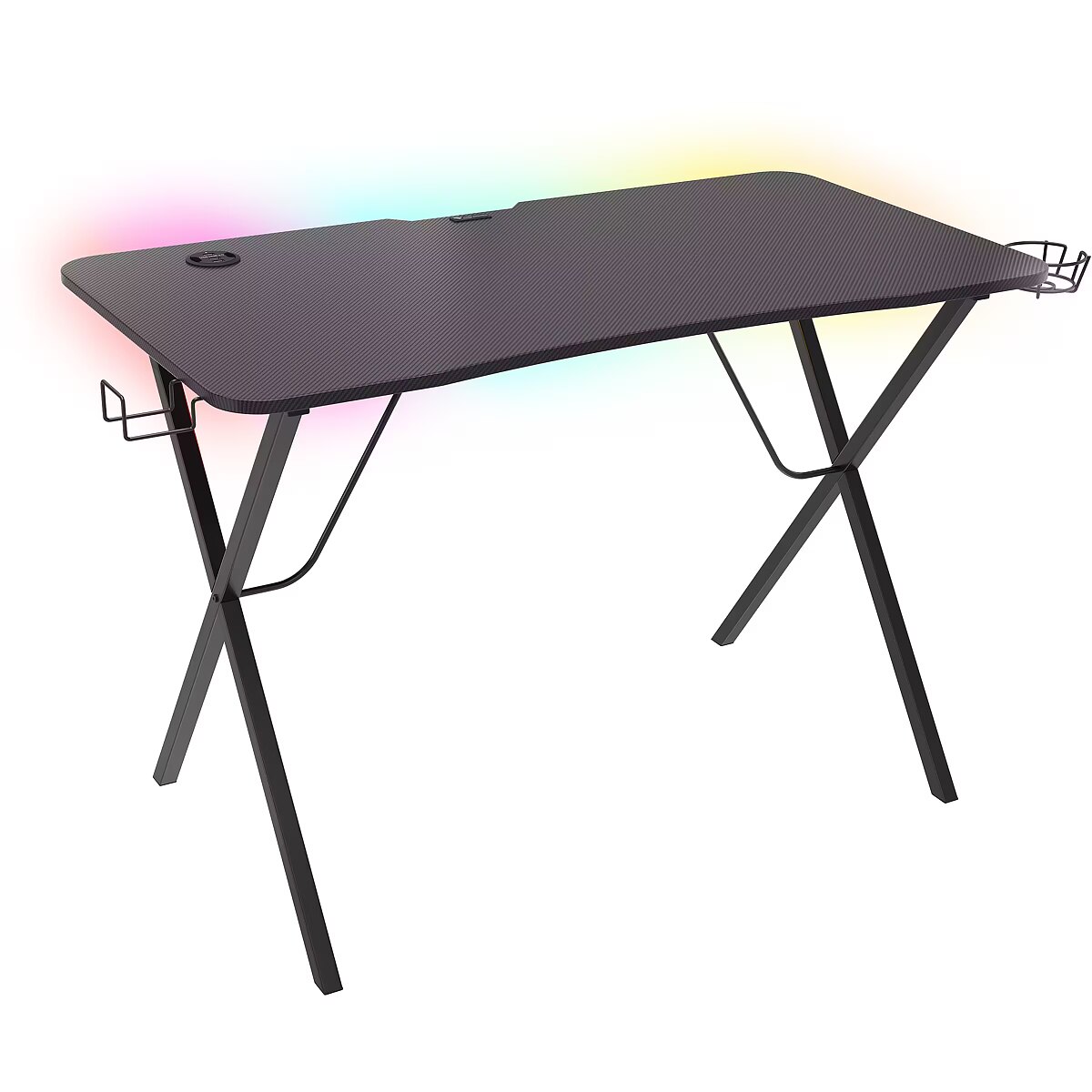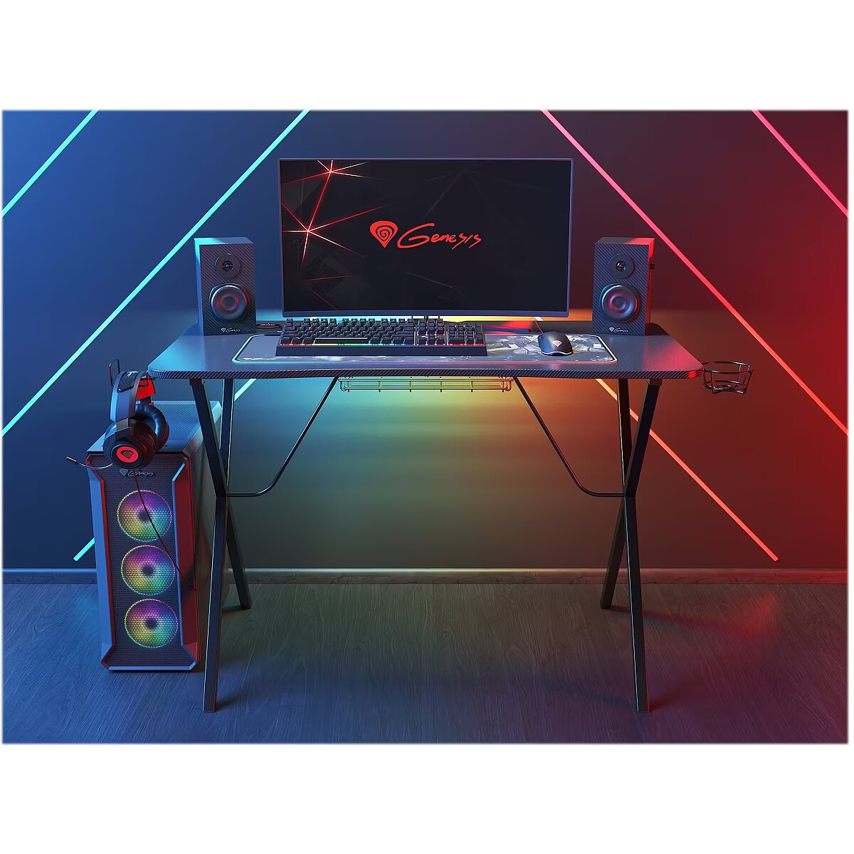 Description - Your gaming passion shines through Your whole gaming world at your hand! Genesis Holm 200 RGB provides enough space for all your gear during your epic battles. With its built-in RGB backlight it creates breathtaking scenery for another level to reach. The best comrade in every struggle Genesis Holm 200 RGB sets up perfect conditions for another fight.  Solid and durable construction guarantees stability. The carbon fiber laminated desk top made of high-quality MDF has ample room for all accessories you need making your extensive campaigns comfortable and enjoyable. All your gear organized Equipped for your geekery, Genesis Holm 200 RGB features holders to keep your desk in good order. Your headset can be safely hung on the special hook at the side of the desk. To survive a whole-night session you can keep your energy drink in the special cup holder protecting your precious devices against any spillage. The holders have universal mounting so you can place them on the right or left side, whichever suits you better. To keep the desk and its surroundings neat and tidy a power strip tray is placed underside so you can manage all cables. USB port at hand Genesis Holm 200 RGB has a built-in hub with three USB 3.0 ports and cable passages making it easier to connect peripherals and manage all wires. Now your keyboard or mouse will not get stuck in the chaos of cables. Unique backlight For the greatest effect enhance your gaming experience with remotely controlled LED backlight with multiply modes and functions. The remote control enables you to change colors, modes, speed and brightness of the backlight creating an awesome and unique atmosphere that will take you away to the virtual reality. The backlight is put under the desk-top so it does not clash with the backlight of other accessories but fabulously lights up the surroundings.