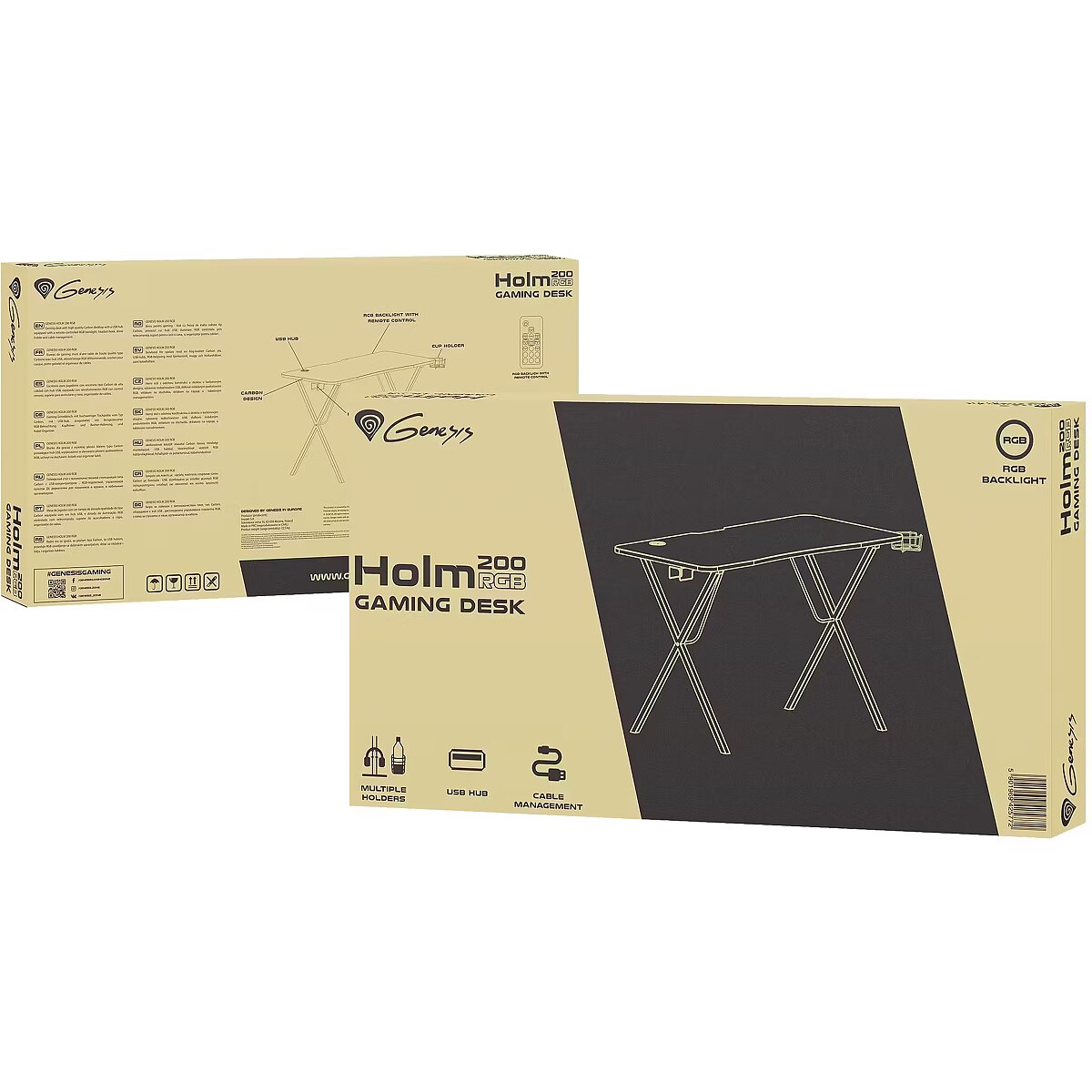 LongDesc - Your gaming passion shines throughYour whole gaming world at your hand! Genesis Holm 200 RGB provides enough space for all your gear during your epic battles. With its built-in RGB backlight it creates breathtaking scenery for another level to reach.The best comrade in every struggleGenesis Holm 200 RGB sets up perfect conditions for another fight. Solid and durable construction guarantees stability. The carbon fiber laminated desk top made of high-quality MDF has ample room for all accessories you need making your extensive campaigns comfortable and enjoyable.All your gear organizedEquipped for your geekery, Genesis Holm 200 RGB features holders to keep your desk in good order. Your headset can be safely hung on the special hook at the side of the desk. To survive a whole-night session you can keep your energy drink in the special cup holder protecting your precious devices against any spillage. The holders have universal mounting so you can place them on the right or left side, whichever suits you better. To keep the desk and its surroundings neat and tidy a power strip tray is placed underside so you can manage all cables. USB port at handGenesis Holm 200 RGB has a built-in hub with three USB 3.0 ports and cable passages making it easier to connect peripherals and manage all wires. Now your keyboard or mouse will not get stuck in the chaos of cables.Unique backlightFor the greatest effect enhance your gaming experience with remotely controlled LED backlight with multiply modes and functions. The remote control enables you to change colors, modes, speed and brightness of the backlight creating an awesome and unique atmosphere that will take you away to the virtual reality. The backlight is put under the desk-top so it does not clash with the backlight of other accessories but fabulously lights up the surroundings.