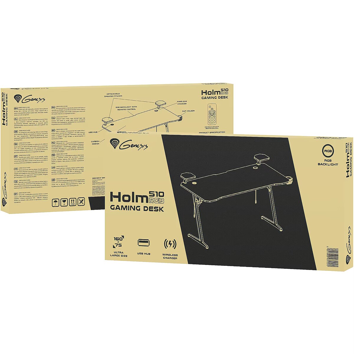 LongDesc - Genesis Holm 510 RGB is a professional gaming desk that will allow you to ergonomically manage your space. A large usable area and dedicated handles will provide space for all the necessary accessories, and the phenomenal RGB lighting will make your command centre gain a unique character. Meet Genesis Holm 510 RGB and create your dream gaming station!UNLIMITED SPACEThe desk is 160 cm long and 75 cm wide. Its dimensions guarantee a huge usable area on which you can put all the necessary accessories without limiting your movements in the game. Aesthetic carbon finish will allow you to perfectly match the desk to any room and add a touch of elegance. Choose comfort and originality with Holm 510 RGB!WINNING STYLEStand out on the battlefield with extremely effective RGB lighting. The included remote control allows you to control numerous modes and effects, thanks to which you can adjust the illumination to your preferences at any time. Set up bright, strong colours that will give you confidence and indulge in exciting gameplay, and when it's over, relax and regain strength in the company of soft colours. Create an atmosphere that will allow you to find yourself in another dimension and defeat your opponents in incredible style!ROBUST CONSTRUCTIONThe Genesis Holm 510 RGB desk has been designed with the needs of the most demanding players in mind. The metal structure will guarantee stability and durability, so you can be sure that the desk will remain in place, even during extremely dynamic movements.MASTER ORGANIZATIONProfessional gamers require advanced solutions. That is why the Holm 510 RGB desk is equipped with numerous dedicated shelves and holders that are removable and allow for installation in a convenient place. Shelves for loudspeakers, holders for headphones and a cup will save space on the countertop and arrange the space perfectly. Under the table, there is a cable organizer , thanks to which you will leave the cables hidden and provide them with a safe place to work.FUNCTIONALITY AND CONVENIENCEA wireless charger is placed on the surface of the table top, which will allow you to conveniently charge your mobile device and have it at hand at any time . The desk is also equipped with a hub with three USB 3.0 ports and cable glands, thanks to which you can easily connect the necessary equipment and organize cables. Forget about tangled cables and choose the maximum comfort with the Genesis Holm 510 RGB!