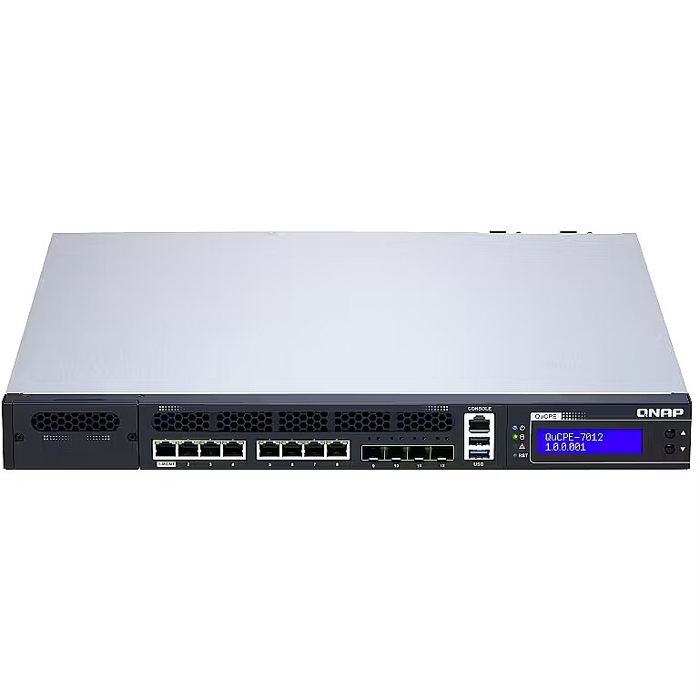 LongDesc - Network Virtualization Premise Equipment with an Intel® Xeon D multi-core processor, suitable for multi-user and multi-tasking business applications.QNAP’s QuCPE-7012 Network Virtualization Premise Equipment is a universal virtualization platform specifically designed for SMBs. The QuCPE-7012 adopts powerful Intel® Xeon® D multi-core processors that support Intel® QAT*, Smart NIC SR-IOV and DPDK hardware acceleration technologies and provides multi-port 2.5GbE, 10GbE, a network module slot and a PCIe slot for 25GbE/ 10GbE expandability. With enhanced bandwidth and computing performance for running multiple VMs and VNFs, the QuCPE-7012 is suitable for multi-user and multi-tasking business applications. The QuCPE-7012 also features the QNE (QNAP Network Equipment) OS for chaining VNF services and AMIZ Cloud centralized deployment and management platform to realize flexible Zero Touch Provisioning.Easily deploy virtual network environments with the 2-in-1 Premise EquipmentWhen deploying virtualized environments, Enterprises often choose to install costly enterprise-grade solutions on edge servers or free solutions with limited technical support – a hard decision for resource-constricted SMBs. In addition, simultaneously running multiple VMs can impact network performance. QNAP’s QuCPE Network Virtualization Premise Equipment feature hardware acceleration technologies, QNAP’s proprietary QNE Network operating system and the AMIZ Cloud centralized management platform to help SMBs build a highly-optimized virtual network infrastructure.The QNE Network Operating System completes the virtual network infrastructureQNAP’s proprietary QNE Network operating system supports the intuitive Network Service Composer and Software-Defined WAN (SD-WAN), allowing for flexible network deployment and multi-site network infrastructure expansion. By supporting Virtual Network Functions (VNF), Virtual Machines and Containers, QNE Network integrates network, computing and application services to realize network virtualization, application virtualization and efficient management, greatly lowering management and maintenance complexity.AMIZ Cloud - powerful centralized VM management platformThe AMIZ Cloud centralized management platform enables IT administrator at HQ to centrally monitor all edge devices, virtual machines and containers. Supporting High Availability, troubleshooting, and remote management via the Account Center, the QuCPE-7012 helps enterprises achieve Zero Touch Provisioning, thus enhancing IT deployment efficiency and reducing maintenance costs.Efficient management via Service Composer with visualized topologyWith the visualized topology of the Network Service Composer, you can easily set up VNFs or VMs, create virtual switches , and allocate physical network resources for chained services by drag and drop. When settings change, you can directly add/remove individual VNFs using the service composer, greatly simplifying operational network combination.Run your VM/VNF Directly on QuCPEQNE Network inherits versatile virtual applications from the QNAP QTS system. QuCPE can simultaneously run multiple virtual machines, software containers, and even bespoke user-made virtual machines in Virtualization Station and Container Station, assisting SMBs in improving deployment and management flexibility while streamlining hardware costs.Powerful server-grade hardware architectureWith multi-port capabilities and expandable architecture, the QuCPE-7012 enables optimal storage, computing, and deployment flexibility to fulfill performance and application diversification requirements.Intel hardware acceleration technologies boost virtual network performanceSpecifically designed for running virtualization applications, the QuCPE-7012 Network Virtualization Premise Equipment adopts multiple Intel hardware acceleration technologies to allow direct hardware access, thus enhancing VM and virtual network transmission performance.DPDK (Data Plane Development Kit)Allows data to bypass the OS Kernel and directly enter user space to offer a double packet transmission rate (Total T/R x L2) and improve overall virtualization application performance.Smart NIC SR-IOV (Single Root I/O Virtualization)By installing an SR-IOV compatible PCIe SmartNIC, you can allocate bandwidth resources from a physical network card directly to VMs. With traffic bypassing the Hypervisor vSwitch, it helps enhance I/O throughout and network efficiency, ensuring reliable VM applications and reduced CPU overheads.Intel QAT (Intel QuickAssist Technology)Offloads computationally-intensive compression and improves IPSec cryptography VPN performance.SD-WAN enables chaining network servicesQNE incorporates QNAP’s QuWAN SD-WAN solution (subscription-free) to form encrypted VPN tunnels with other QNAP devices based in multiple sites and achieve multi-site network services chaining. For example, you can automatically create a firewall network (using QuWAN and pfSense VNFs) to enhance WAN security in the Service Composer UI using drag-and-drop.Smart IT tools for network management efficiencyQNE Network provides comprehensive management features for Smart IT network management.Notification CenterConsolidates QTS system events and alerts, providing a single-app solution for notifications instead of having to configure individual settings in multiple apps. Notifications can be sent through email, SMS, and other communication apps.QuLog CenterCentralizes statistical rankings of error/warning events and access, assisting IT staff in monitoring and responding to potential system risks.Security CenterProvides security management for IT staff, including managing SSL certificates. Other features include automatically detecting history edits to prevent malicious edits.ZabbixZabbix is a third-party solution that automatically detects devices and monitors network status. Zabbix provides user-friendly topology and network reporting, suitable for ent