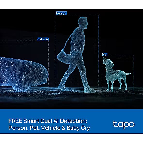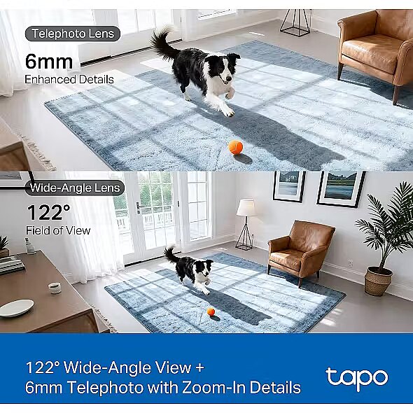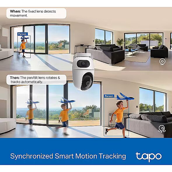 Two 2K 3MP lenses work together to capture a broader perspective, minimizing blind spots and delivering all-round protection for your home.2K 3MP Dual Lens - Capture the full picture with dual 2K high definition optics, monitoring two separate areas at the same time with just one device. Engineered to minimize blind spots for optimal coverage.Wide-angle & Telephoto Lens - With 122° FOV wide-angle lens and 6mm telephoto lens, it ensures all-around awareness and down-to-the-detail protection of your home.Synchronized Smart Tracking - When the fixed lens detects events, the pan/tilt lens will automatically pivot to focus on and track the moving object.One-Tap Smart Focus - Select an area in the wide-angle view, and the pan/tilt camera will focus on it instantly.Free Smart Dual AI Detection & Notification - Get instant push notifications when motion, person, pets, vehicles or even baby cry are detected, there is no additional fee to use it.Works with Alexa, Google Home & Samsung SmartThings - Fully compatible with Amazon Alexa and Google Assistant, use your simple voice command to view Tapo indoor/outdoor home security wi-fi camera live stream.Night Vision up to 40 ft -Even in complete darkness, an advanced IR algorithm delivers clear black-and-white footage.Secure Local or Cloud Storage - Save footage continuously on up to a 512 GB microSD card (not included) or subscribe to Tapo Care for cloud storage which saves 30-day video.2-Way Audio - Engage in seamless, real-time conversations with our two-way audio feature, designed for minimal latency and exceptional sound clarity.