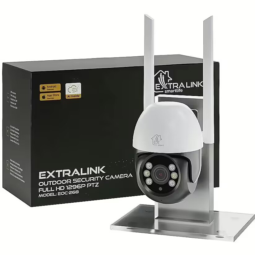 Description - Extralink Perun Outdoor Security Camera EOC-268 | IP camera | 1296p, PTZ Extralink outdoor camera - reliable IP surveillance in all conditions The Extralink outdoor camera is equipped with a colour CMOS image sensor, providing crystal clear images and videos in 1296p resolution regardless of weather conditions. The infrared illuminator of the wifi camera automatically detects ambient light and switches to colour night mode, the monitoring distance is up to 20m. A memory card slot allows local storage of video footage. Key features of the Extralink PTZ camera EOC-268: High-quality video, live streaming and viewing of recordings Support for intelligent auto-tracking - face detection, high-quality motion detection Panning angle: 310° horizontally and 140° vertically Wide viewing angle, see more at any time 2.4 GHz WiFi wireless connection, no network cable required Local storage support - MicroSD card slot up to 128 GB Supports two-way audio between phone and camera Supports 7X24H video recording, never miss a moment Free app, remote viewing support on iOS or Android Tuya cloud storage support for motion detection recordings Power supply via universal power adapter (Micro USB port, DC12V/1A) Flexible mounting with wall screws Night mode - colour images in low light conditions Wide and stable WiFi IP camera network coverage You will gain stable monitoring with the Extralink Perun PTZ camera. The 2.4GHz external antennas of the ip surveillance camera provide stronger and more stable network reception. It only supports 2.4GHz Wi-Fi, which penetrates obstacles to a greater extent, thus providing a wider Wi-Fi range. Perun surveillance camera's wide viewing range The IP camera's 310° horizontal and 140° vertical rotation and 5x digital zoom can be controlled in the app. The 145-degree viewing angle of the IP wifi PTZ camera guarantees a wide monitoring area. Intelligent motion detection The Extralink outdoor WiFi camera is equipped with enhanced AI human detection and motion sensors that can accurately record human movements and reduce false alarms that may be caused by insects and falling leaves. When motion is detected, a real-time alert will be sent to your phone. Tap on the alert notification to view videos and photos anytime, anywhere. You will be notified of all suspicious events. The camera for IP surveillance in all conditions The wireless wifi camera has an IP65 (waterproof rating) design that completely prevents dust and water from entering. The wifi ip camera can work flawlessly outdoors, regardless of heavy rain or sun exposure. You don't have to worry about rain or snow affecting image quality. Outdoor camera with real-time conversation The Extralink Perun full HD wifi wireless camera with built-in microphone and speaker system enables clear two-way audio communication. Talk in real time to anyone in front of the camera, for example family, friends, intruders.