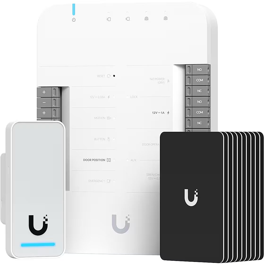 Technical_details - The UniFi G2 Access Starter Kit contains everything you need to set up the next generation, state-of-the-art access control system for your business. Compatible with most electric bolt/strike and magnetic locks, the UniFi G2 Access Starter Kit is easy to install with minimal effort. UniFi Access is based on native PoE technology. The UniFi Access Hub is a single door intelligent IP network controller that is part of the UniFi Access solution. The UniFi Access Hub has versatile interfaces including support for most electric deadbolts/locks, magnetic locks and 12V access accessories such as motion sensors, buttons and alarms. The three PoE-powered reading interfaces minimize cabling and provide a convenient way to add a UniFi G3-Flex security camera (sold separately) for additional security. The seamlessly integrated UniFi Access solution is managed with the UniFi Access Controller software. The UniFi Access Reader Gen2 is a second generation compact NFC card reader and prompt device that supports door unlocking with a hand gesture. Item no.: 100030139 EAN 0810084691670 Manufacturer no. UA-G2-SK Indoor use LAN Yes Electricity consumption 50 W Power over Ethernet (PoE) Yes Set consisting of 1x UniFi Access Door Hub, 1x UniFi Access Reader Gen2, 10x UniFi access cards Further information Connections Hub: 4x RJ-45, 2 lock terminals (12V and dry), 2 AUX ports for an external siren and an automatic door opener, 4 additional inputs (sensors and buttons) Note UniFi Dream Machine Pro is required to run UniFi Access