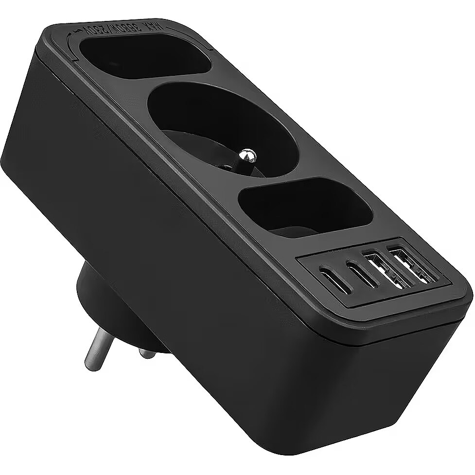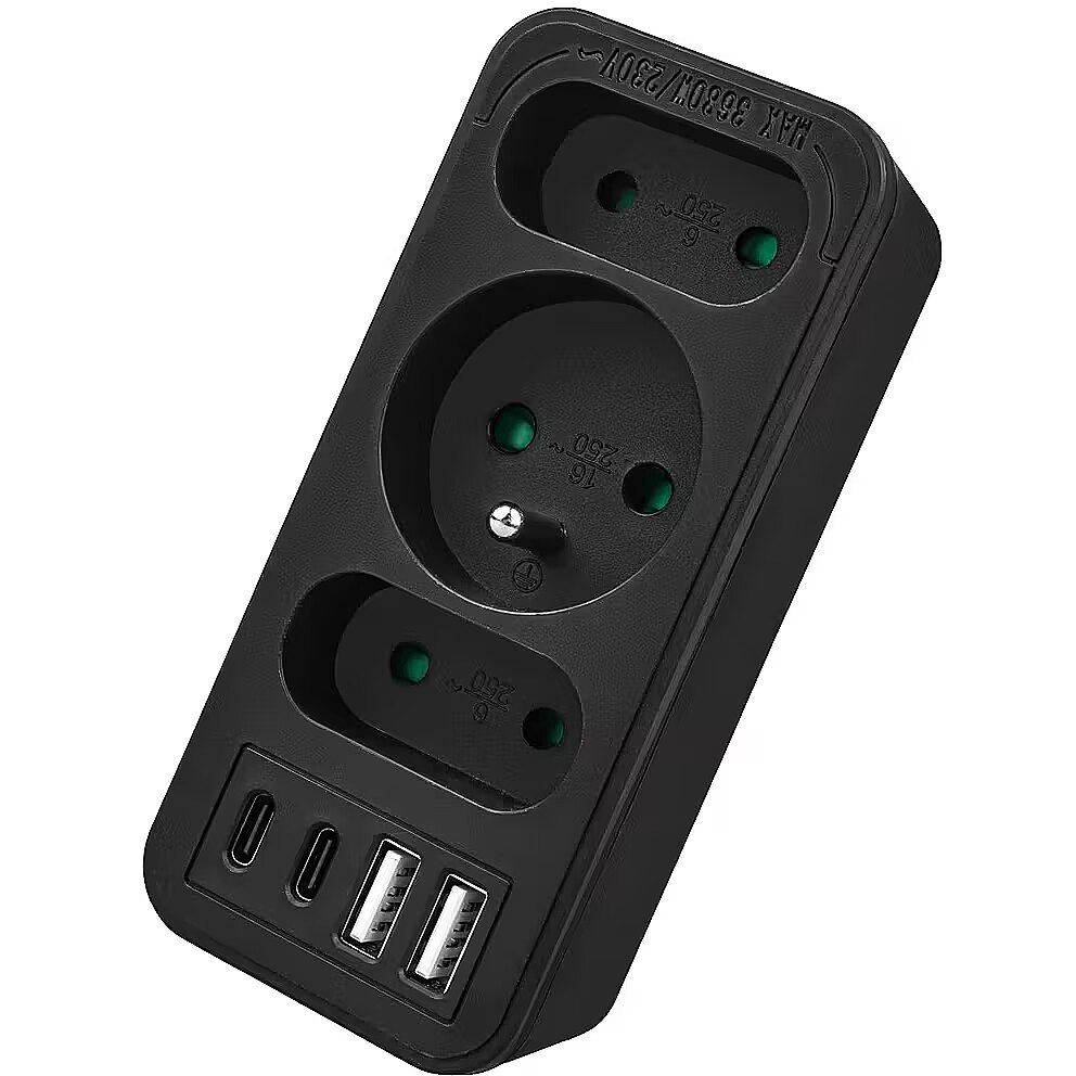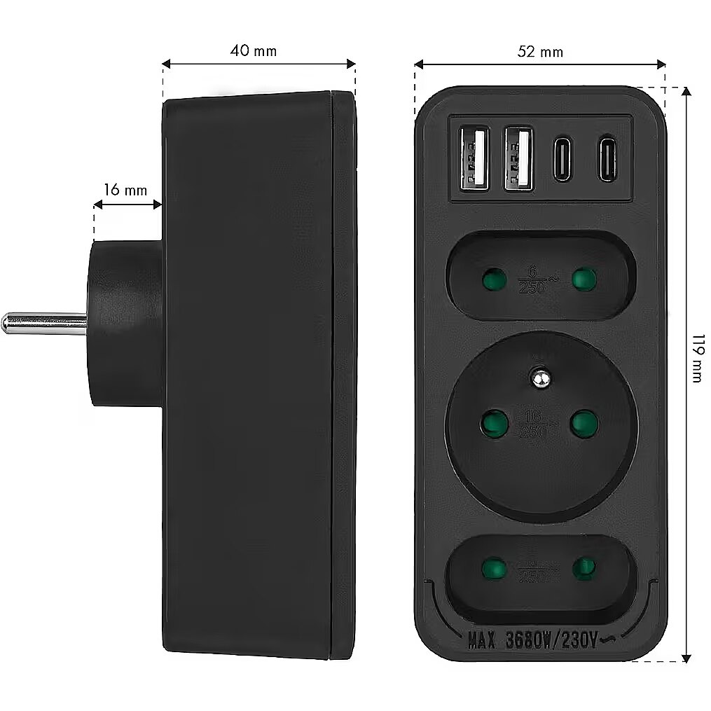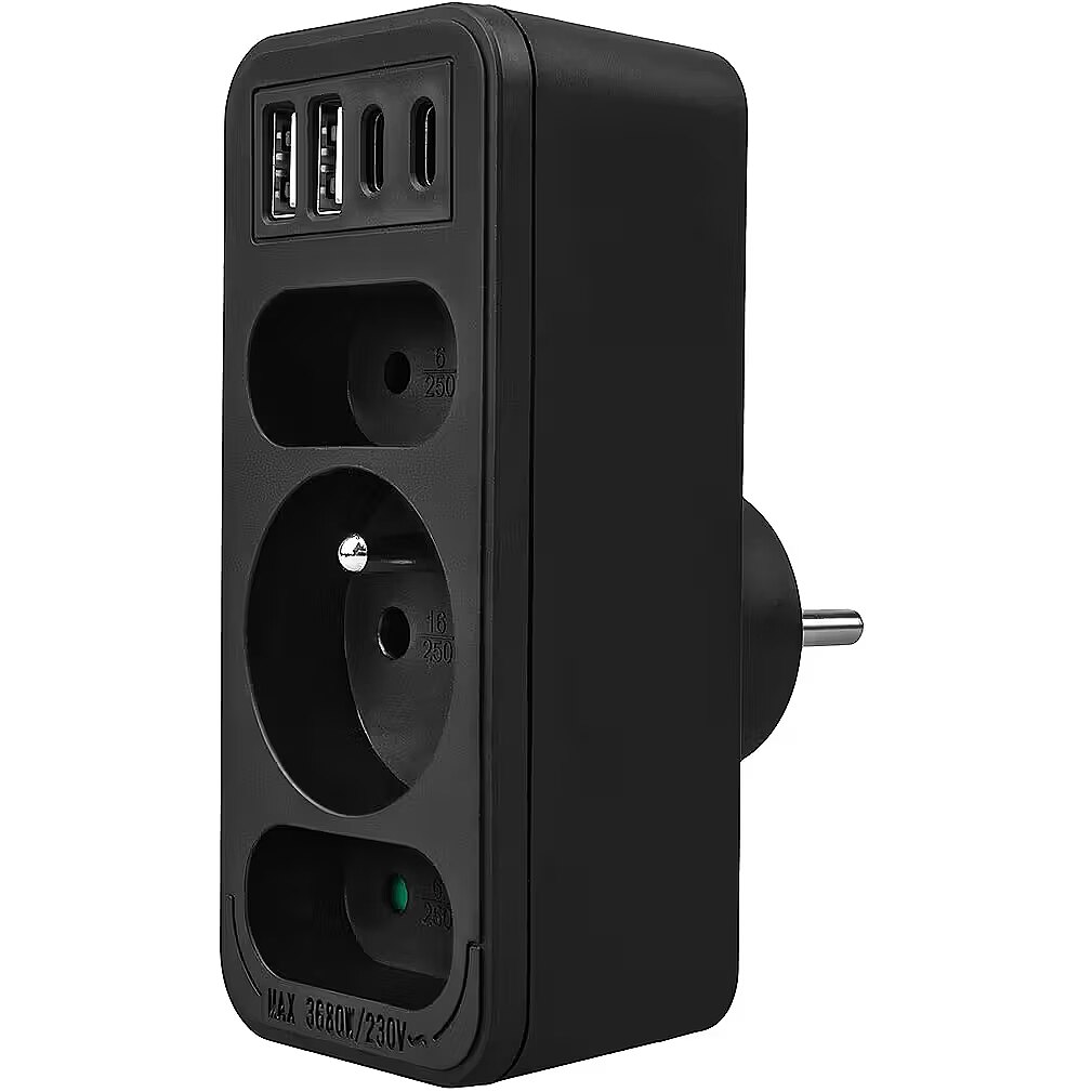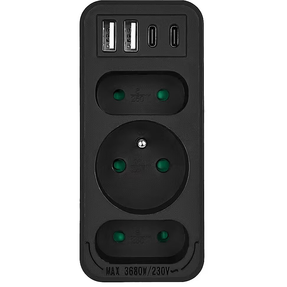 Other features - Color: black Housing material: plastic Power source (voltage): 110-240 V AC / 50/60 Hz Type of sockets: 2x flat socket (type C), 1x round socket with grounding pin (type E) Maximum load: C sockets - max. current 6A 1380 W; E socket - max. current 16A 3680W USB port type: 2x USB-A, 2x USB-C  USB-A output power: 5V/3A, 9V/2A, 12V/1.5A, max. 18 W (using one output)  USB-C output power: 5V/3A, 9V/2.22A, 12V/1.67A, max. 20 W (using one output) Child safety feature: yes Protection rating: IP20