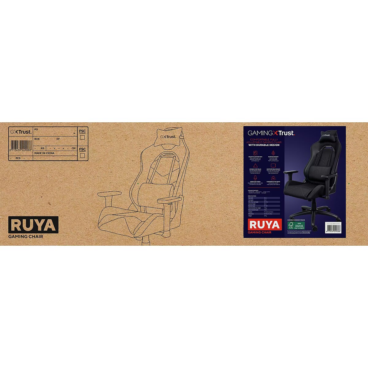 LongSummaryDescription - Trust GXT 714 RUYA. Product type: Universal gaming chair, Maximum user weight: 150 kg, Maximum user height: 195 cm. Width: 710 mm, Depth: 750 mm, Height (min): 134 cm. Quantity per pack: 1 pc(s)