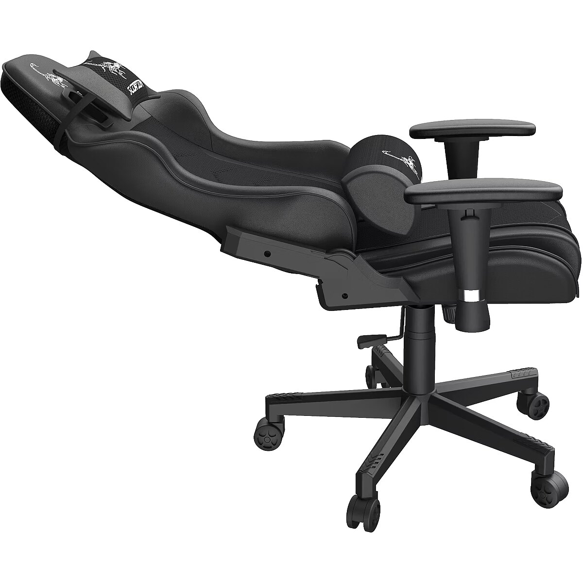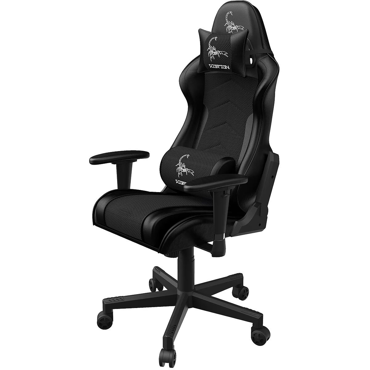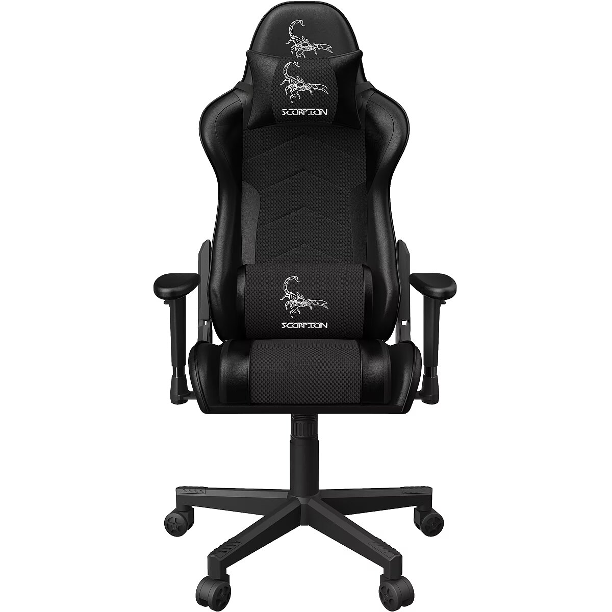 Description - Krzesło gamingowe Scorpion czarne Krzesło komputerowe z PVC Mocna nylonowa podstawa, gąbka w oparciu i zagłówku oraz formowana pianka wewnątrz siedziska Wentylowane siateczkowe siedzisko i przód Regulowany podłokietnik 2D Mechanizm uchylny, podnośnik gazowy i koła PU