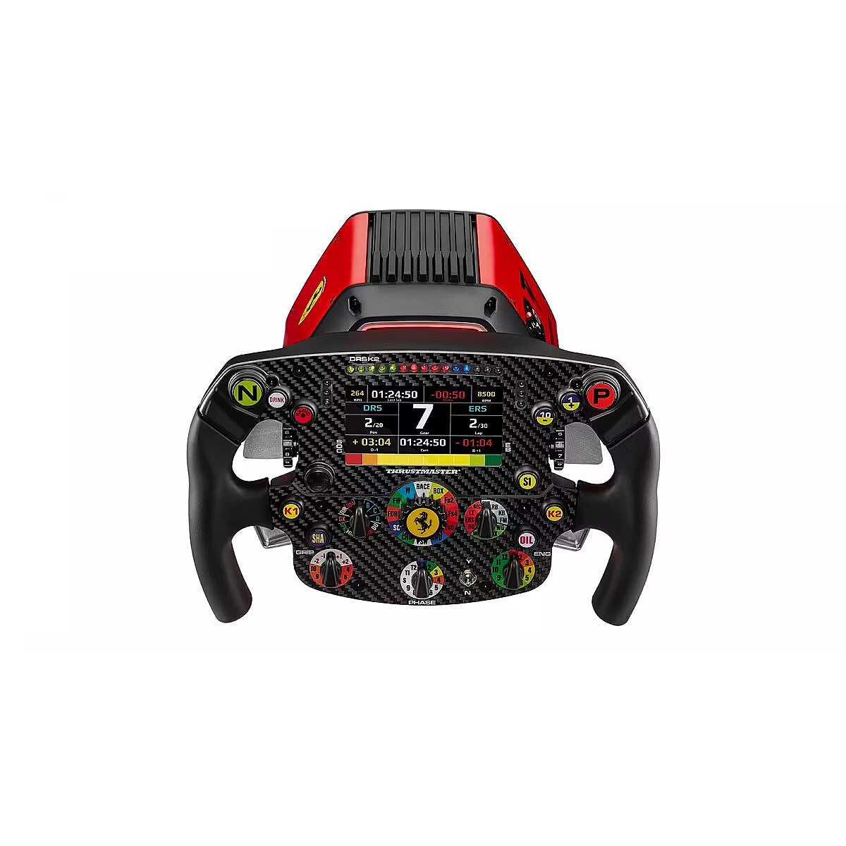 Ta pełnowymiarowa replika kierownicy bolidu Ferrari SF1000 zawiera 21 diod i 109-milimetrowy wyświetlacz, który może przekazywać nawet 69 informacji związanych z grą*. 25 przycisków umieszczonych na kierownicy (w tym 7 koderów) umożliwia sterowanie ustawieniami pojazdu. Centralna płyta czołowa wykonana w całości z włókna węglowego łączy sztywność z lekką konstrukcją, ułatwiając panowanie nad pojazdem podczas wyścigu.