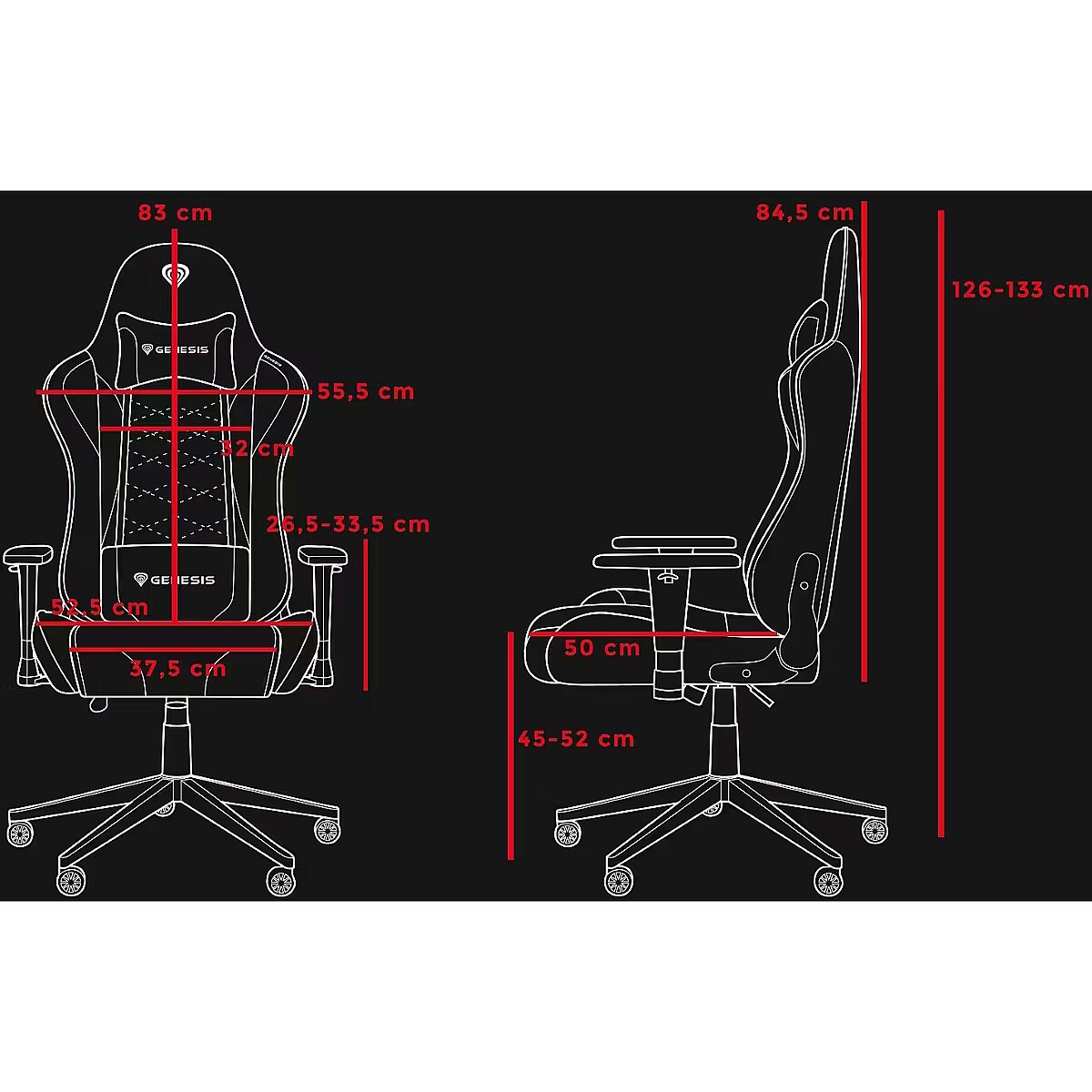 LongSummaryDescription - GENESIS NITRO 440 G2. Product type: PC gaming chair, Maximum user weight: 120 kg, Seat type: Padded seat. Height (min): 126 cm, Height (max): 133 cm, Seat width: 52.5 cm. Quantity per pack: 1 pc(s), Package width: 580 mm, Package depth: 840 mm. Products per pallet: 8 pc(s)