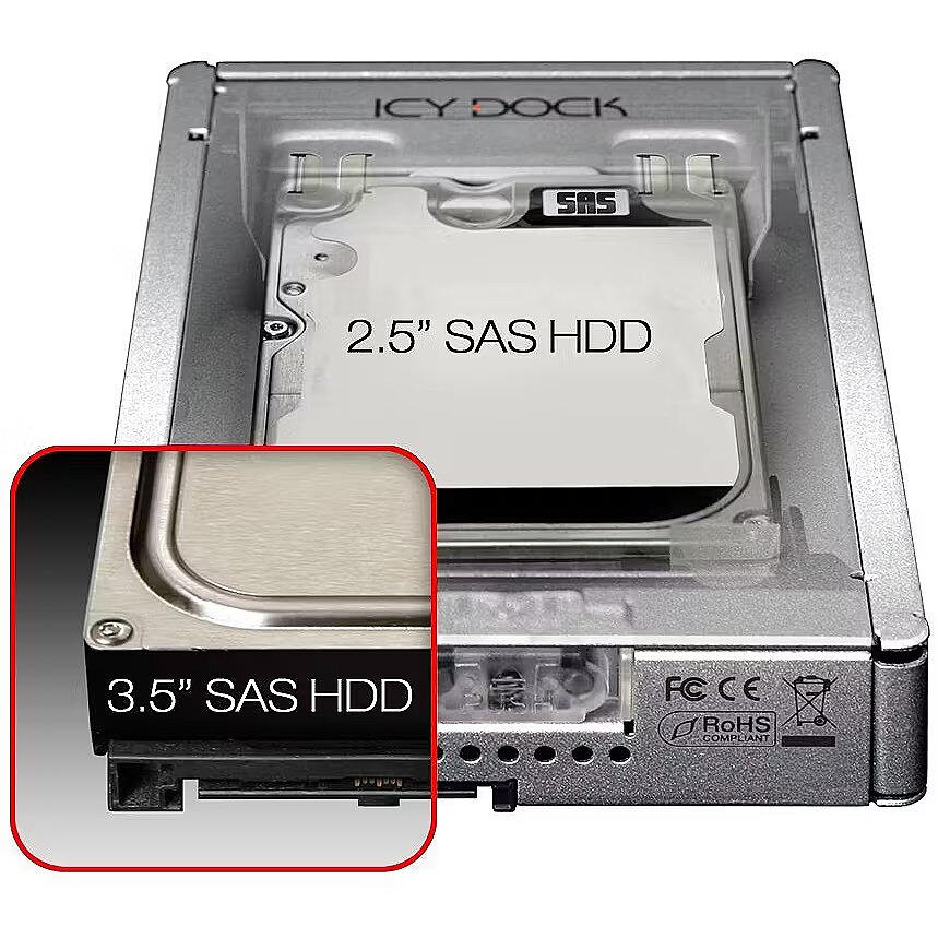 Technical_details - In order to provide a pure 2.5” to 3.5” SAS conversion, Icy Dock is proud to introduce the new MB982IP-1S-1 2.5” SAS/SATA to 3.5” SAS SSD & HDD Converter. The MB982IP-1S-1 is an addition to the already popular MB982 enterprise series, with an emphasis on industrial level SAS storage applications. This product is designed using the dimensions, connection locations, and mounting hole positions of a standard 3.5” SAS or SSD drive. The converter is designed specifically to be used for 2.5” SAS/SATA drives that are required in 3.5” SAS internal hard drive bays of tower and rackmount chassis, as well as with SAS backplanes or hot swap modules. The MB982IP-1S-1 utilizes a full metal design, thus creating the best environment to cool any 10K, 15K RPM SAS mechanical or enterprise SAS solid state drive, meanwhile, the rock solid construction is ideal for industrial, enterprise, and military related applications. Improving upon the MB982IP-1S, the MB982IP-1S-1 uses a completely standardized SAS connection in order to be fully compatible with various SAS backplanes. To accommodate various hard drive heights, we have included our Smart-Fit Technology, allowing security of the drive whether it is a thinner 9.5mm or a thicker 15mm. The MB982IP-1S-1 also includes most of the Featuress that you already expect from an Icy Dock product: an effortless installation process without any tools or screws, plenty of ventilation slots to keep any drive used running cool and efficient, and a unique and stylish design. The top, front and rear allow exceptional airflow, and a special vent on the bottom gives the user visual confirmation that the drive has made a secure connection. Technical details Standard interfaces Serial Maximum Maximum Data Transfer Rate 6 Gbit/s Colour of product Silver Material SECC Product dimensions (WxDxH) 101.6 x 146.6 x 25.4 mm Weight & dimensions Width 101.6 mm Depth 146.6 mm Height 25.4 mm Weight 320 g Hard drive Storage media type HDD, SSD Storage drive interface Serial ATA Storage drive sizes supported 2.5 " Number of storage drives supported 1 Storage N