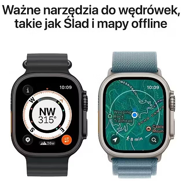 Apple Watch Ultra 3 został zaprojektowany z myślą o jeszcze większej wydajności baterii dla celów śmielszych i ambitniejszych niż kiedykolwiek. Kiedy potrzebujesz dodatkowej energii, możesz skorzystać z szybkiego ładowania i uzupełnić baterię na 12 godzin normalnego użytkowania w zaledwie 15 minut. Mistrz wieloboju. Apple Watch Ultra 3 przenosi na wyższy poziom wszystkie Twoje wyczyny sportowe. Podczas jazdy na rowerze aktywnie monitoruje Twoją prędkość i efektywność, dzięki czemu postępy widzisz w czasie rzeczywistym. Podczas treningu pływackiego na bieżąco rejestruje zestawy, automatycznie wykrywa styl i oblicza całkowity dystans. Twoje rekordy są na wyciągnięcie ręki. Znajdź swoje Strefy mocy. Podłączając osobisty miernik mocy do Ultra 3, oszacujesz swoją funkcjonalną moc progową, czyli najwyższy poziom intensywności, który teoretycznie jesteś w stanie utrzymać przez godzinę. Ta wartość aktywuje funkcję Strefy mocy pokazującą bieżącą moc, czas w strefie oraz średnią moc podczas aktywności. Aplikacja Trening pokazująca parametry funkcji Strefy mocy, trening przebiega w 4 strefie Obserwuj parametry jazdy na rowerze na swoim iPhonie. Trening na rowerze, który zainicjujesz na Ultra 3, automatycznie wyświetli się jako wydarzenie na żywo na iPhonie. Możesz więc łatwiej i bezpieczniej przeglądać rejestrowane dane na swoim telefonie przymocowanym do kierownicy. Nastaw się na Widoki treningu. Chcesz sprawdzić swoją bieżącą prędkość na rowerze? W funkcji Widoki treningu wybrane wskaźniki przesuwają się na środek, aby można je było wygodnie śledzić. A przekręcając pokrętło Digital Crown, łatwo przełączysz się między takimi parametrami jak Strefy tętna, rundy czy Wysokość n.p.m. Bezkonkurencyjny Trening mieszany. Ultra 3 wykrywa, kiedy po pływaniu wskakujesz na rower, a potem jeszcze ruszasz do biegu, i śledzi wskaźniki dla każdej z tych dyscyplin. Rejestrowanie segmentów treningu triatlonowego nigdy nie było tak proste. Styl się liczy. W basenie Ultra 3 samoczynnie wykrywa styl pływania, oblicza automatyczne zestawy z dystansem i tempem, a także generuje zaawansowane pomiary, takie jak SWOLF, żeby zmierzyć efektywność Twojej aktywności. Na szczytach. I w głębinach. Zdobywanie nowych szczytów i nurkowanie w głębinach wymagają specjalistycznych narzędzi. Apple Watch Ultra 3 został wyposażony w przełomowe funkcje, w tym zaawansowany kompas czy w pełni funkcjonalny komputer nurkowy dlatego mając przy sobie tak niewiele, masz sprzęt na każdą wyprawę. Ślad pozwala znaleźć drogę powrotną. Jeśli zgubisz się na szlaku, funkcja Ślad automatycznie odtworzy pokonaną przez Ciebie trasę, korzystając z danych GPS nawet gdy nie masz zasięgu. Możesz też łatwo dodać ważne punkty na trasie, takie jak miejsce wejścia na szlak czy obozowisko. Funkcja Ślad pokazująca kompas, wysokość n.p.m. oraz zaznaczone punkty trasy Przecieraj szlaki, także te niestandardowe. Twórz i zapisuj na iPhonie własne trasy spacerów i wędrówek. Do wyboru masz różne opcje przejścia: drogę w jedną stronę, tam i z powrotem lub pętlę. Możesz też otrzymać wskazówki krok po kroku prosto z nadgarstka. Mierz wysoko z Wędrówką. Wśród treningów na Ultra 3 znajdziesz pieszą wędrówkę, dzięki której możesz rejestrować tempo, dystans, przewyższenie i spalone kalorie. Obserwuj w czasie rzeczywistym, jak wysoko udało Ci się wspiąć, a na koniec wędrówki sprawdź łączne przewyższenie. Sięgaj gwiazd. Karta treningu Wędrówka, na której widać czas i wysokość n.p.m. Możesz pobierać mapy offline. Zaplanuj z wyprzedzeniem trasę swojej wędrówki i pobierz na iPhonea mapę offline. Zostanie automatycznie zsynchronizowana z Twoim zegarkiem i podpowie Ci, którędy iść, gdy znajdziesz się w nieznanym terenie. Apple Watch Ultra 3 z kopertą z tytanu w kolorze naturalnym, widać mapy offline i kolejne wskazówki, zegarek ma opaskę Alpine w kolorze terakoty Wyznaczaj punkty trasy w apce Kompas. Możesz oznaczyć swoją bieżącą lokalizację lub wyróżnić początek szlaku bądź obozowisko. Punkty trasy z łącznością komórkową automatycznie wskazują lokalizację, w której po raz ostatni na Twojej trasie dostępna była łączność komórkowa. Z takim wyposażeniem głębia jest Twoja. Opracowana wspólnie z Huish Outdoors apka Oceanic+ zmienia Ultra 3 w pełni funkcjonalny komputer nurkowy wykorzystujący algorytm dekompresyjny Bühlmanna. Przekręcając pokrętło Digital Crown, jednym spojrzeniem sprawdzisz przydane informacje. Aplikacja będzie na bieżąco wyliczać i monitorować parametry nurkowania oraz generować niezbędne ostrzeżenia. Apple Watch Ultra 3 z kopertą z tytanu w kolorze naturalnym, widać parametry z aplikacji Oceanic+: głębokość, czas dekompresji, czas nurkowania, minuty do wynurzenia, temperatura wody, zegarek ma pasek Ocean w kolorze neonowej zieleni Pobierz apkę Oceanic+