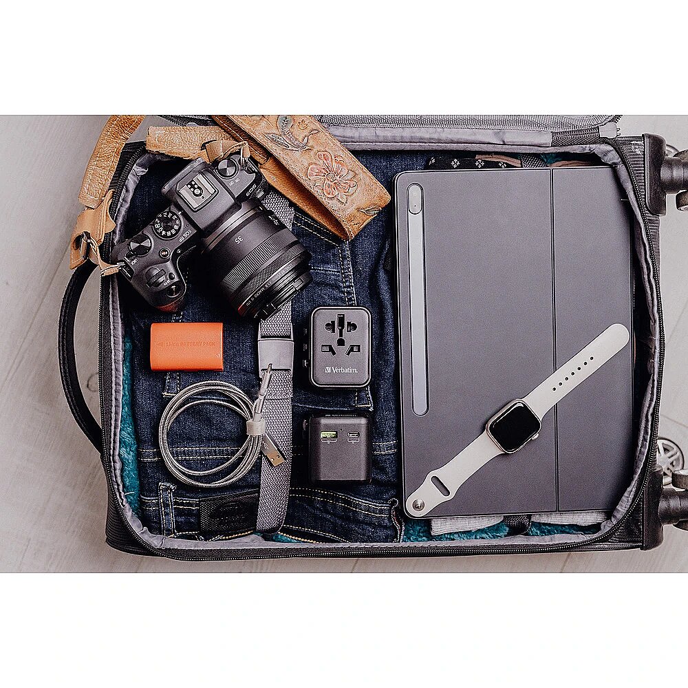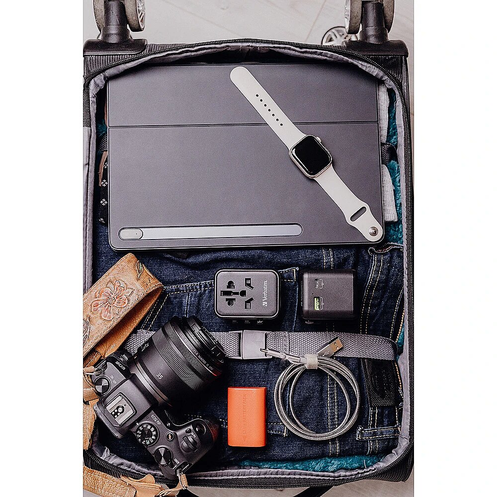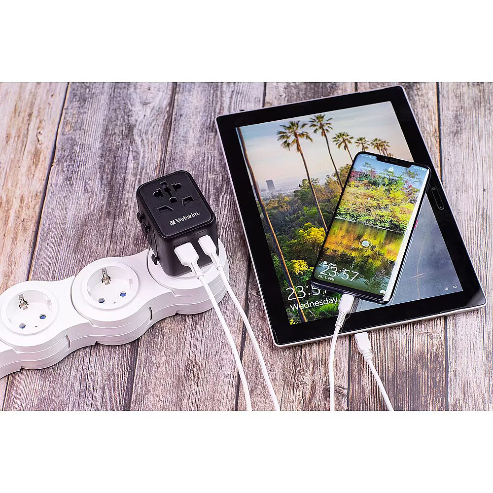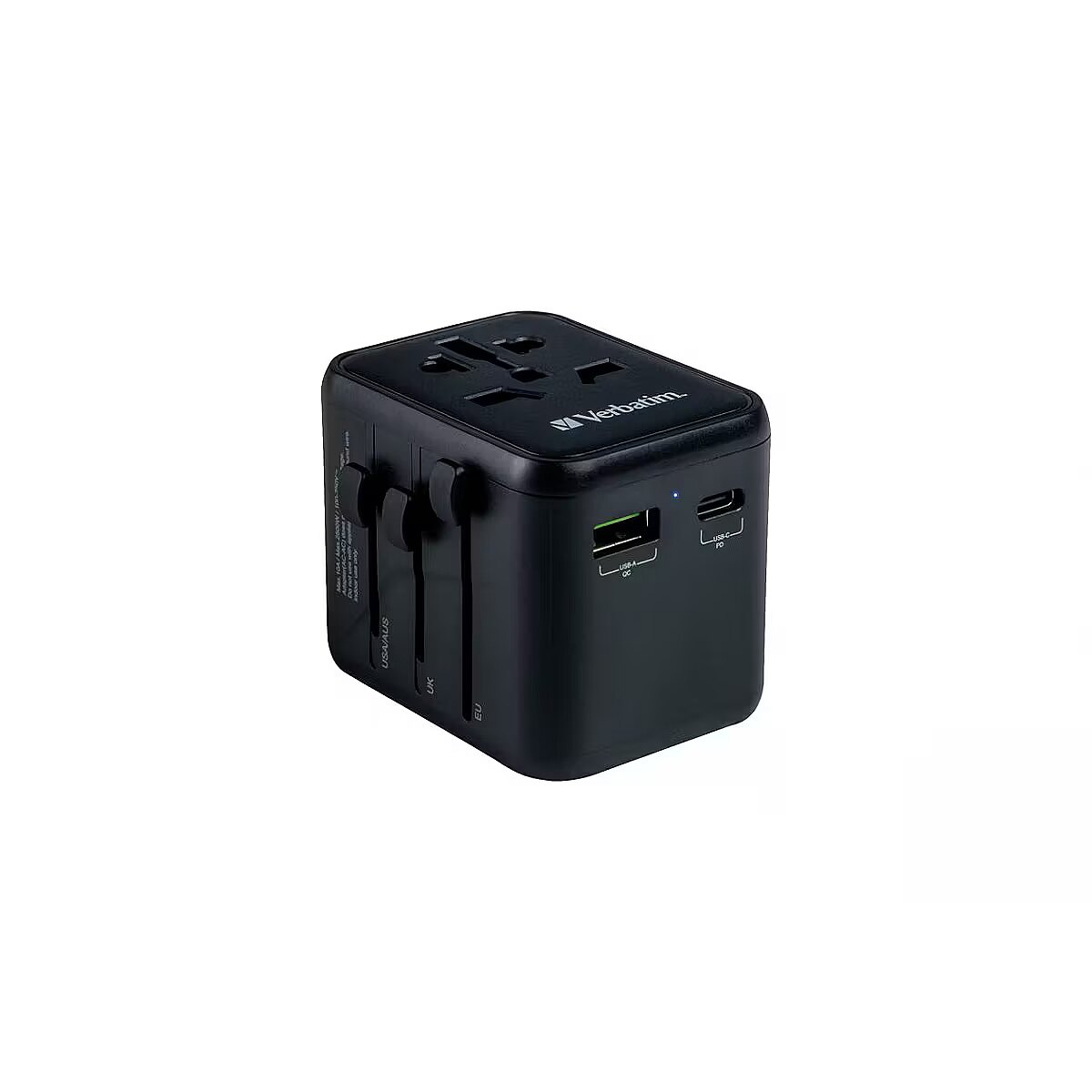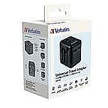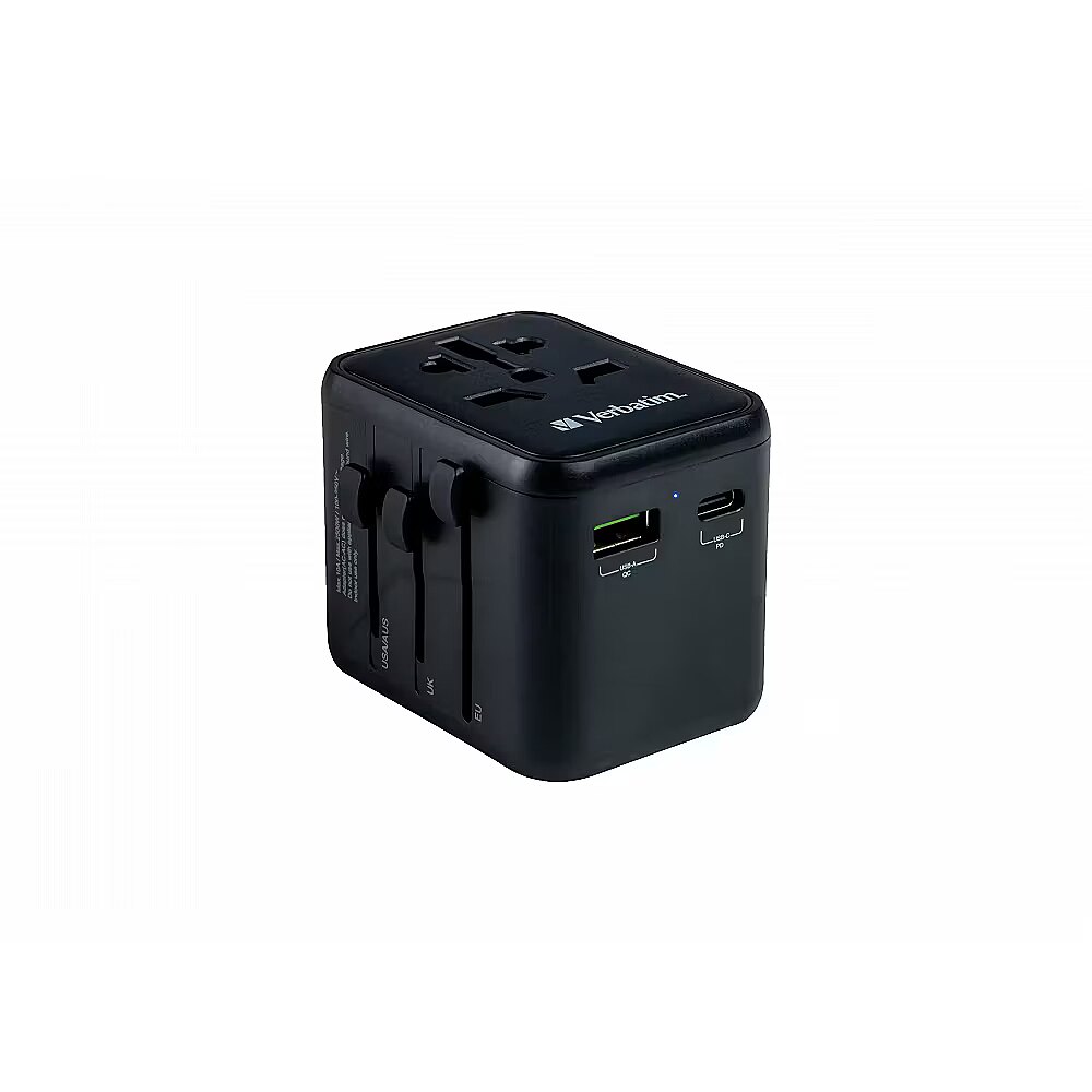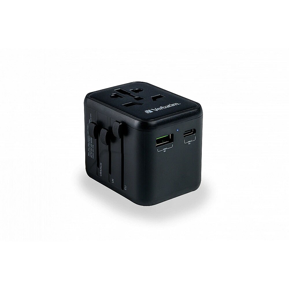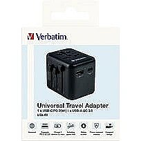 LongDesc - The Verbatim Universal Travel Adapter can be used in more than 180 countries – take it everywhere with you and never be out of power. This world-to-world multi plug will allow you to connect to any local power supply around the world and recharge your power-hungry devices, like laptops and camera batteries. The USB-C and USB-A ports on the bottom can charge all your USB devices including smartphones, Bluetooth speakers, tablets, power banks, and Kindles.Superfast 3-in-1 chargingThe compact and powerful Universal Travel Adapter allows 3 devices to be charged simultaneously through the AC power socket and the USB-A and USB-C ports.The USB-C port supports 20W Power Delivery (PD) and the USB-A port delivers 18W Quick Charge 3.0 output, providing superfast charging for all your USB devices.Just push the sliders on the side of the multi plug to reveal the three most common international plugs - EU, UK, and US - and rotate the pins for sockets in Australia or China.Compact and SafeCertified by CE, UKCA, FCC and ROHS, and made with high quality fireproof polycarbonate material, this Universal Adapter is perfect for daily use during your trip.It has safety shutters for child protection that can only be opened with force of more than 75N (7.5Kg) per hole, and itsBS1362 compliant fuse (including a spare) gives you 100% peace of mind wherever you may go.