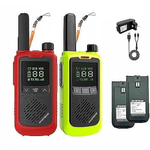 Packaging content - Set contents - 2x Baofeng BF-T17 PMR radio, 2x Rechargeable battery 1x, Dual cable 2x, USB 1x, USB power adapter to work with cables, 2x Lanyard