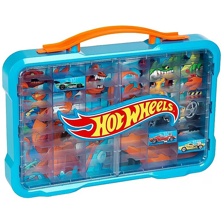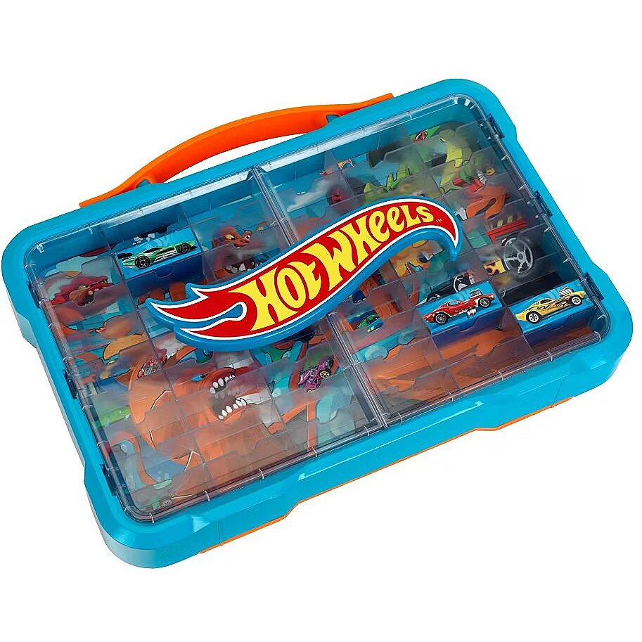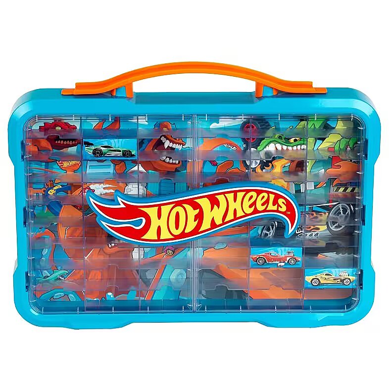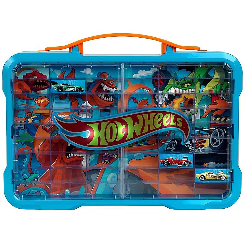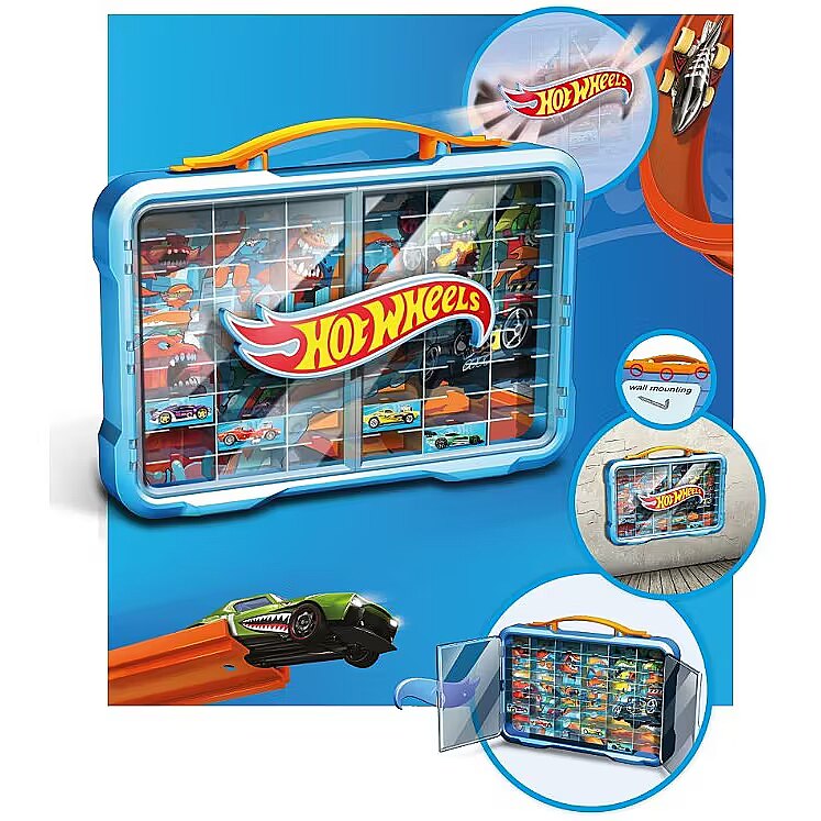This durable case features compartments for storing up to 54 1:64 scale cars (vehicles not included). The display case, with a cool poster on the back and a bright Hot Wheels logo on the front, can be mounted on the wall using standard screws and wall plugs (not included) or carried with you wherever you go thanks to the convenient carrying handles.