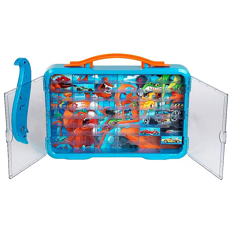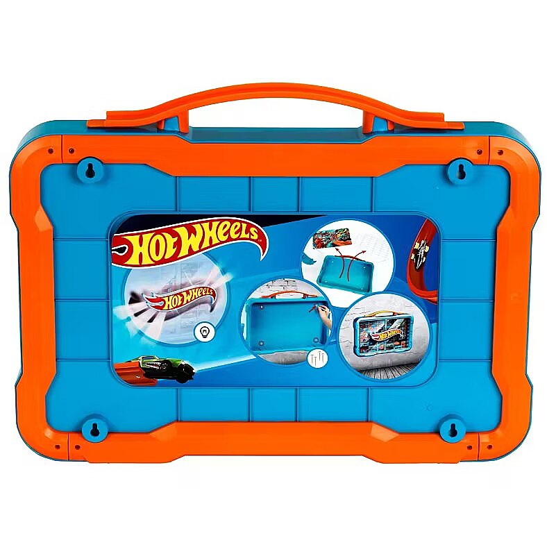 Space for 54 cars and a bright illuminated Hot Wheels logo, with a practical carrying handle. This case is sure to be a dream come true for all Hot Wheels fans. A case/garage with transparent hinged doors. The owner of this elegant Hot Wheels garage can easily drive up to it, pass through the doors, head to one of the 54 parking spaces, park smoothly, and then relax knowing there is no better place for their beloved car. Closing the doors will simply delight car lovers of all ages.
